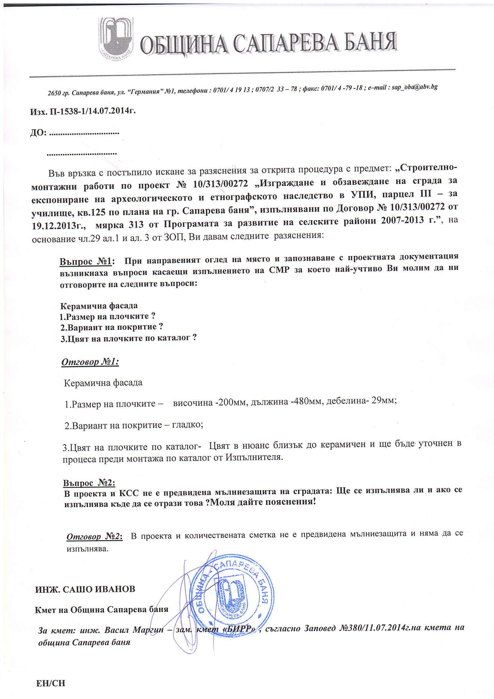 Във връзка с постъпилo исканe за разяснения за открита процедура с предмет: „Строително-монтажни работи по проект № 10/313/00272 „Изграждане и обзавеждане на сграда за експониране на археологическото и етнографското наследство в УПИ, парцел III - за училище, кв.125 по плана на гр. Сапарева баня", изпълнявани по Договор № 10/313/00272 от 19.12.2013г., мярка 313 от Програмата за развитие на селските райони 2007-2013 г.", на основание чл.29 aл.1 и ал. 3 от ЗОП, Ви давам следните разяснения: