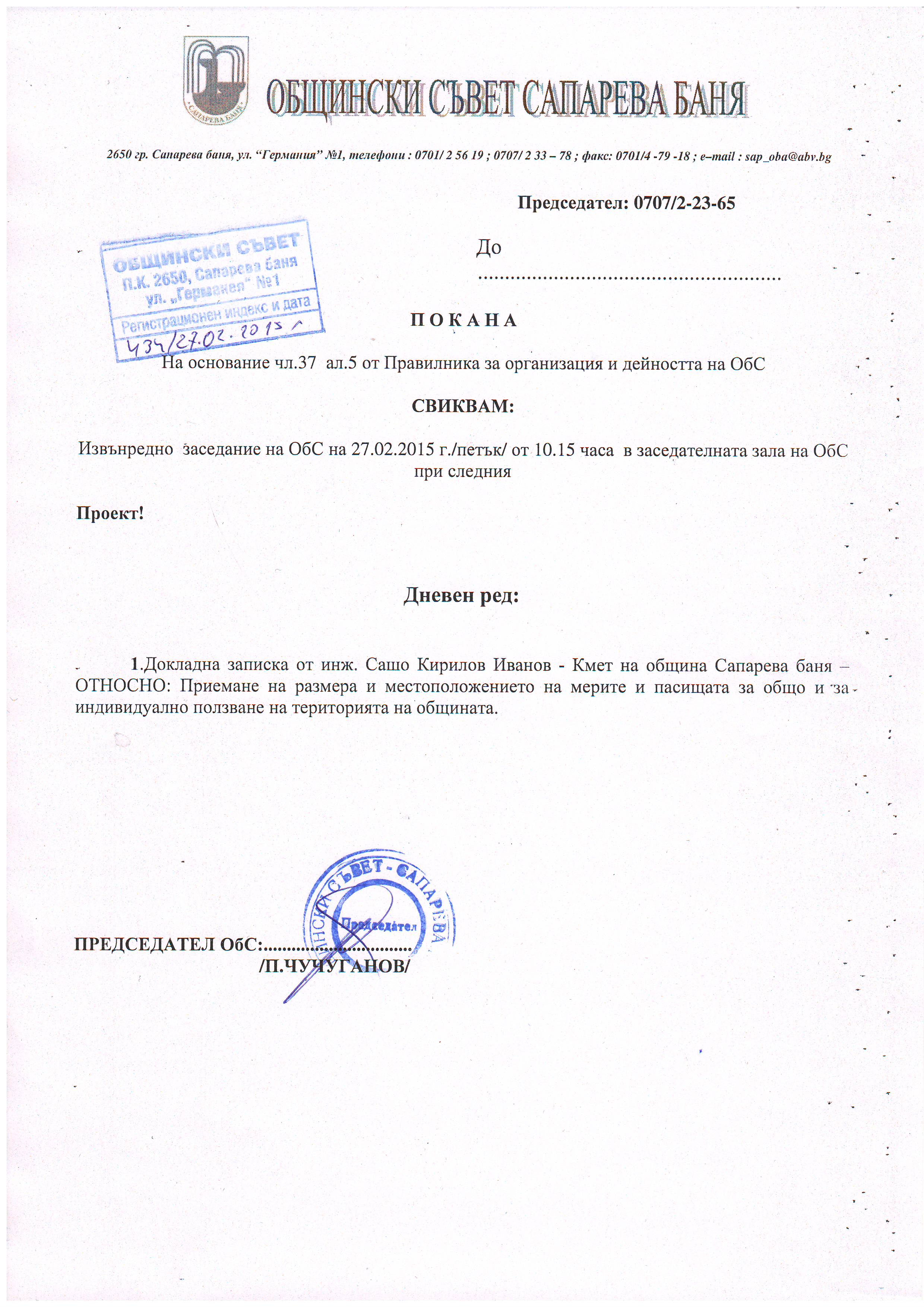 Покана за извънредно заседание на ОбС на 27.02.2015 г./петък/ от 10.15 часа