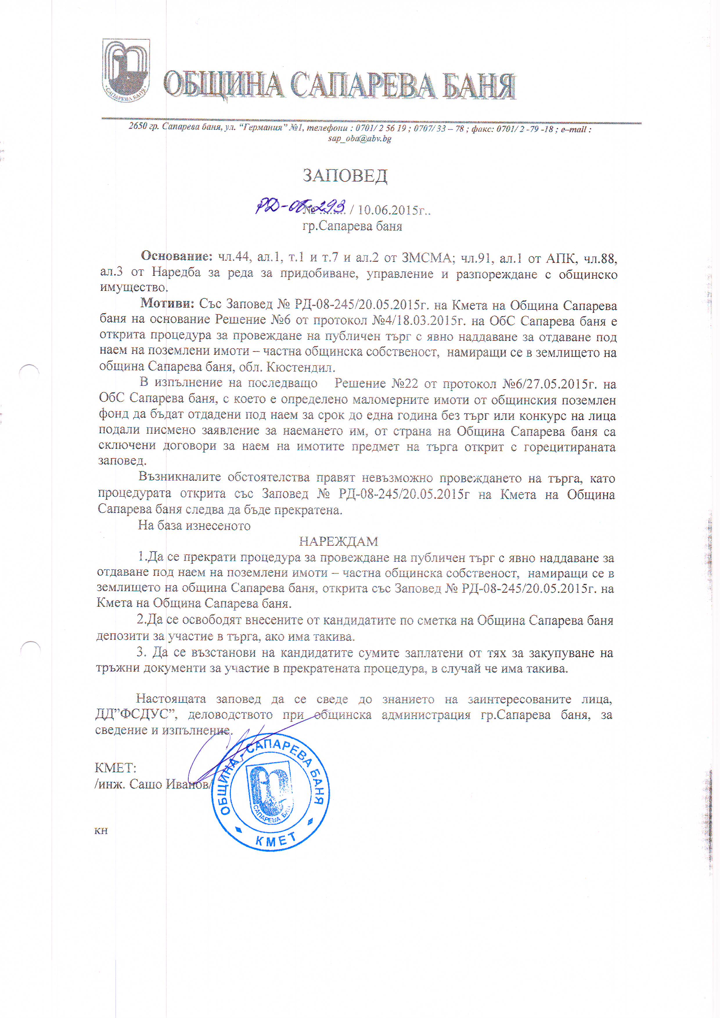 На основание чл.44, ал.2 от ЗМСМА, чл.14, ал.1 и ал. 2 от ЗОС, чл. 24а,ал.5 от ЗСПЗЗ; чл. 37,ал.3;чл.85,ал.1 от Наредба   за реда на придобиване, стопанисване, управление и разпореждане с общинско имущество на Общински съвет Сапарева баня,Решение №6 от Протокол №4/18.03.2015г.  на Общински съвет Сапарева баня и Заповед № РД-08- 245/20.05.2015г. на кмета на община Сапарева баня