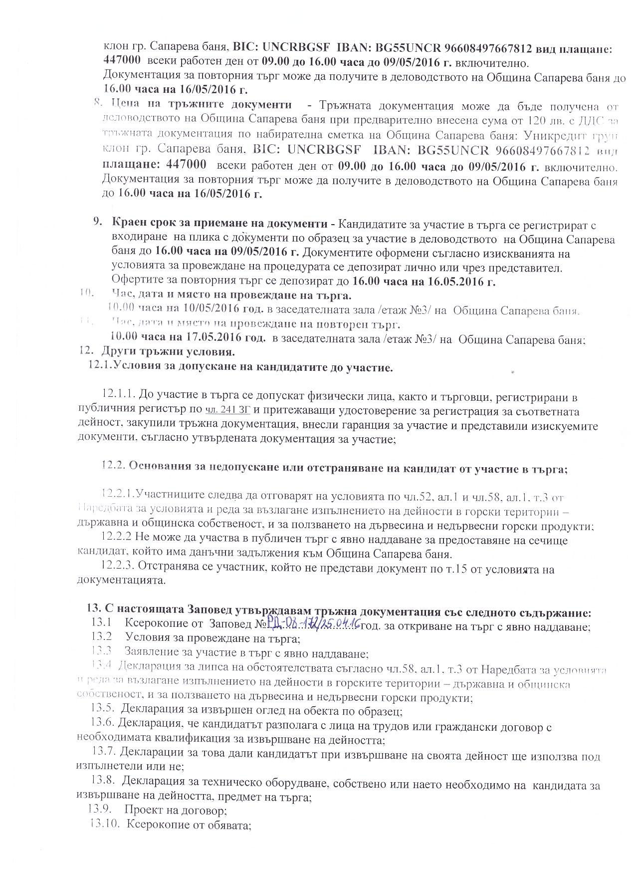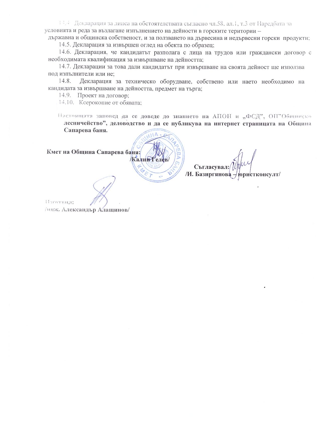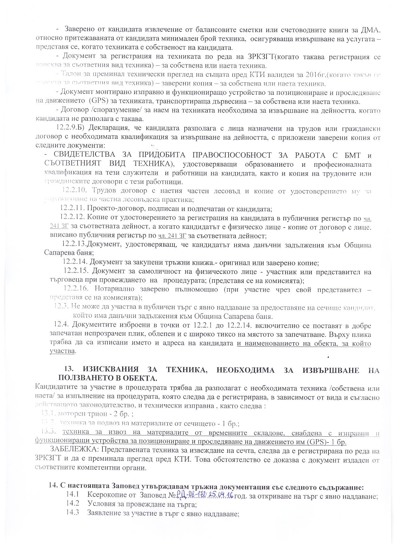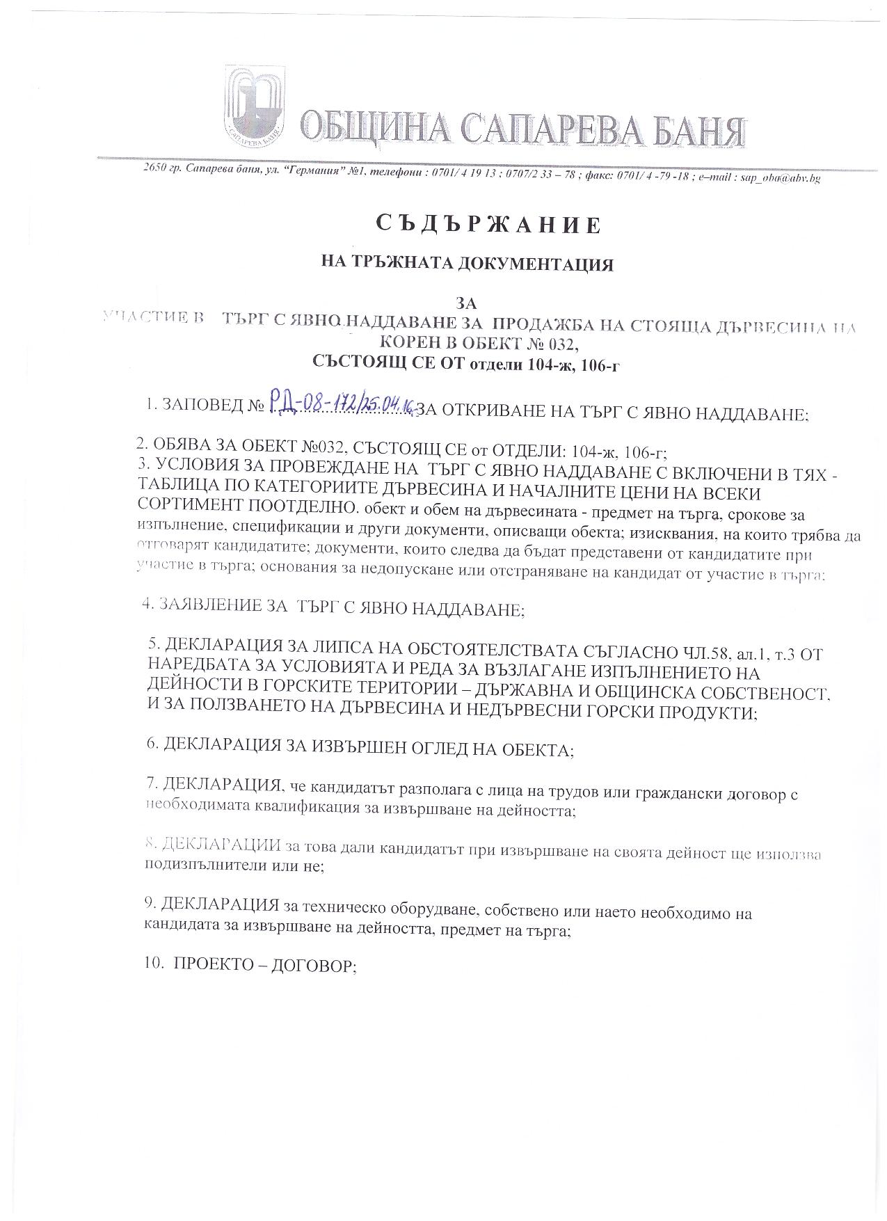 На основание чл.44, .1, т.1 и т.7, .2 от ЗМСМА; чл. 112, ал.1, т. 1 от ЗГ; чл.55, ал.2 и ал. 3 във вр. с чл.50, т.4 от Наредба за условията и реда за възлагане изпълнението на дейности в горските територии - държавна и общинска собственост, и за ползването на дървесина и недървесни горски продукти;   Решение № 15 от Протокол №14/24.10.2016 г.; Решение №55 от Протокол №7/30.03.2016 г.на Общински съвет гр. Сапарева баня  и Заповед № РД-08-172/25.04.16 г. год. на Кмета на Община Сапарева баня се организира  публичен  търг с явно наддаване за продажба на стояща дървесина на корен в обект  № 032 състоящ се ототдели  104-ж, 106-г на територията на Общинско лесничейство гр.Сапарева баня.