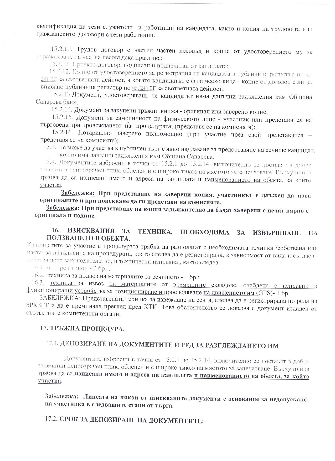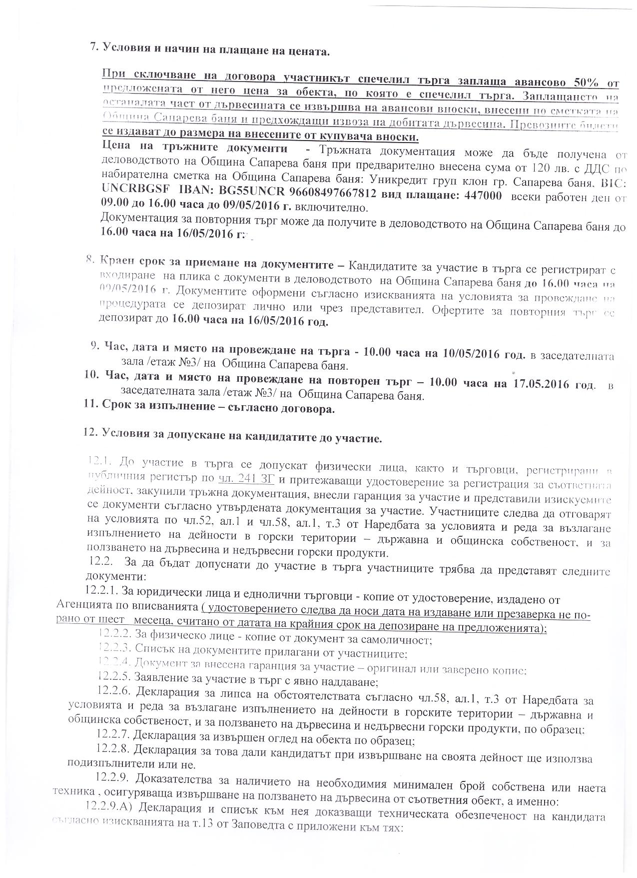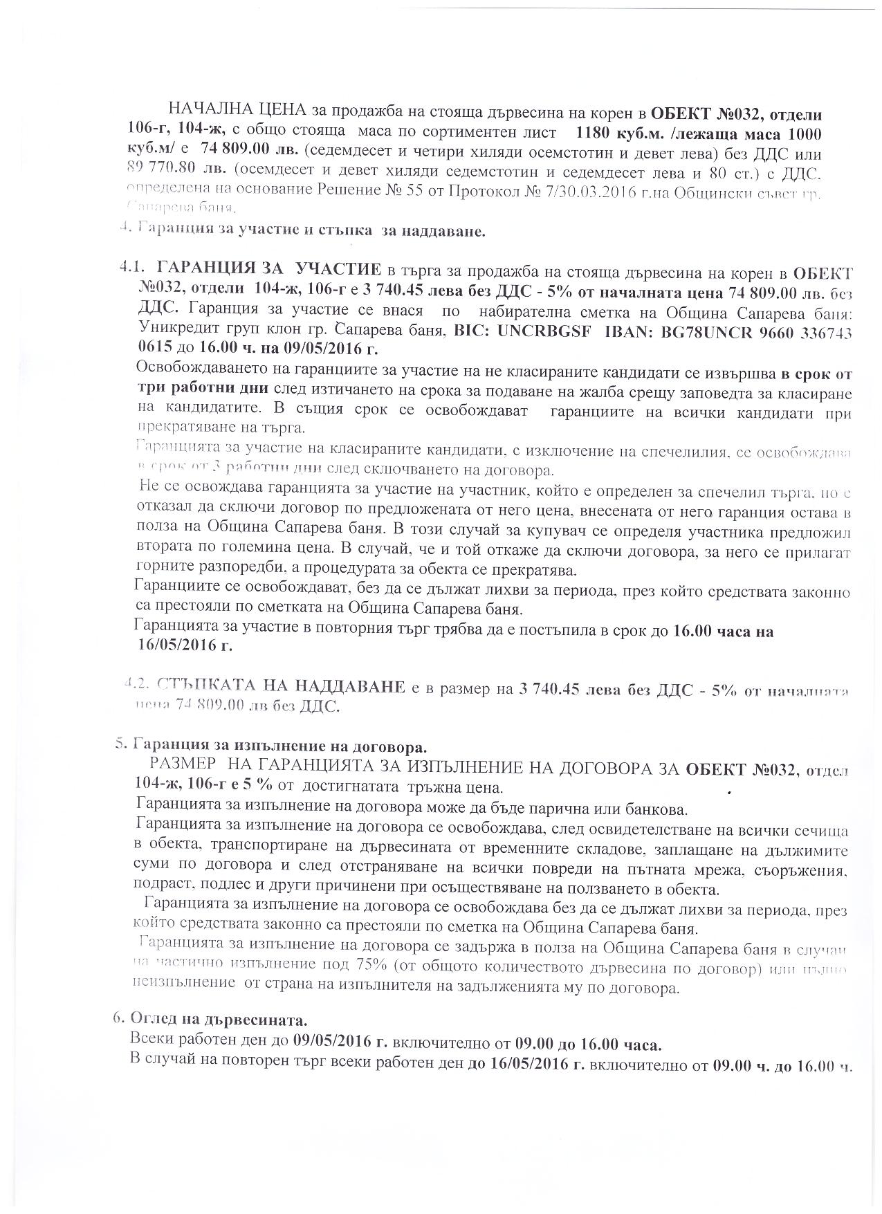 3.1.Гаранция за участие за обект 032 отдели 104-ж, 106-г - 5% от началната цена 74 809.00 без ДДС или  3740.45 лева без ДДС. Гаранция за участие се внася  по  набирателна сметка на Община Сапарева баня: Уникредит груп клон гр. Сапарева баня, BIC: UNCRBGSF  IBAN: BG78UNCR 9660 3367430615  до 16.00 ч. на 09/05/2016 г.