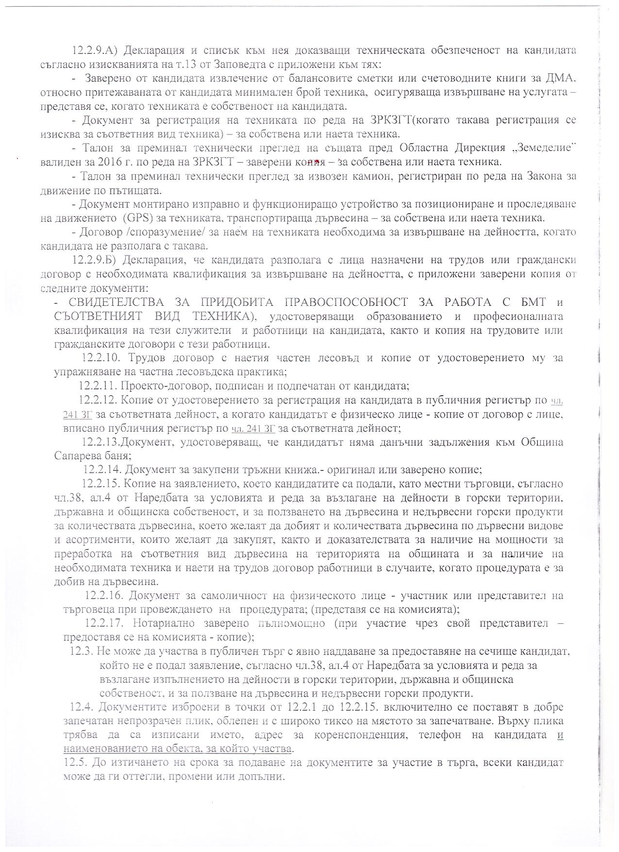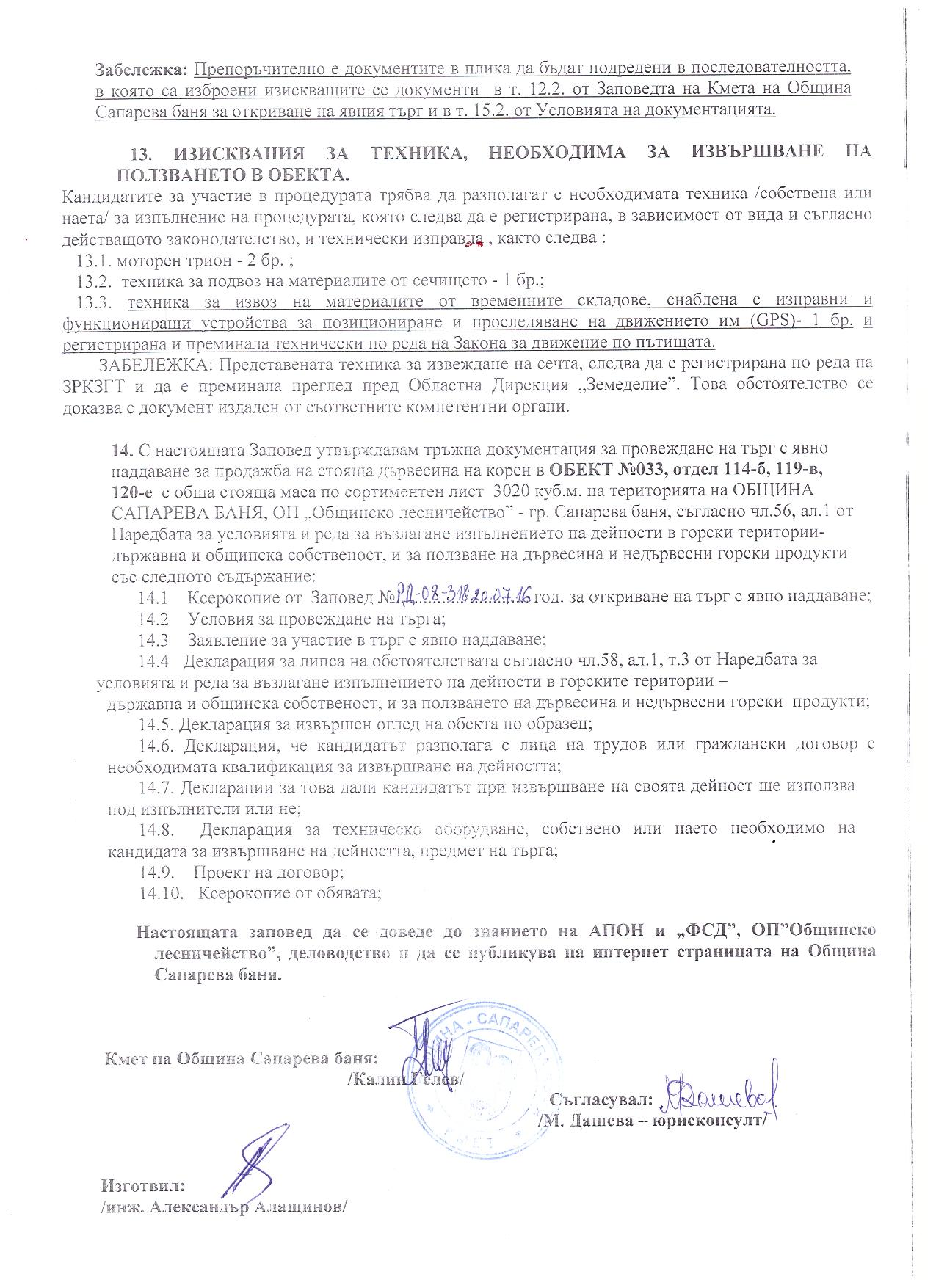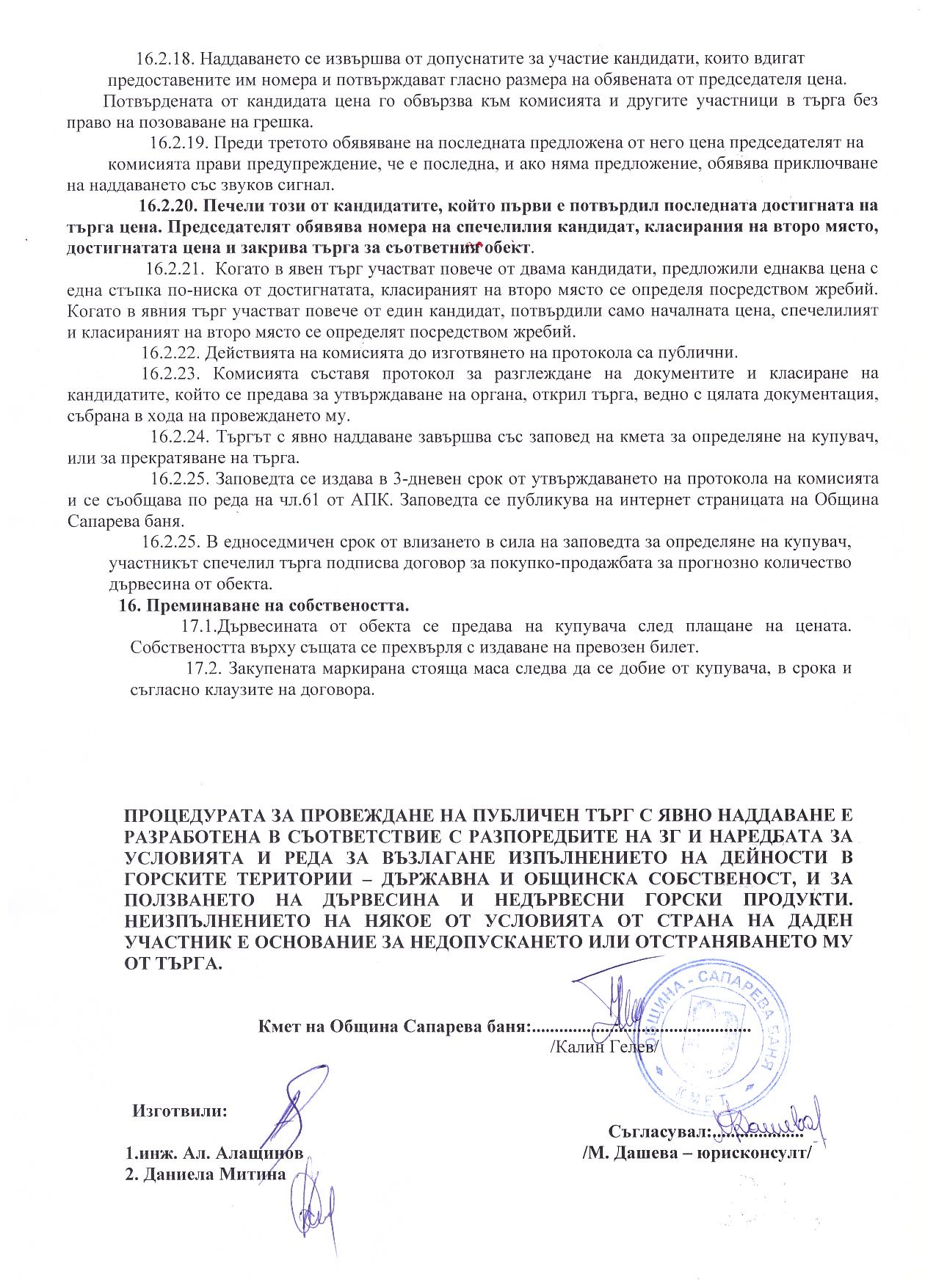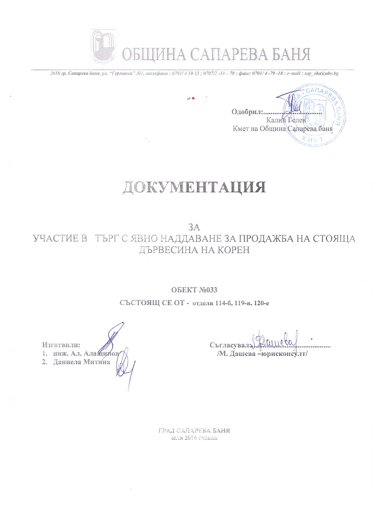 На основание чл.44, aл.1, т.1 и т.7, aл.2 от ЗМСМА; чл. 112, ал.1, т. 1 и чл.115, ал.1, т.1 от ЗГ; чл.55, ал.2 и ал. 3 във вр. с чл.50, т.4 от Наредба за условията и реда за възлагане изпълнението на дейности в горските територии - държавна и общинска собственост, и за ползването на дървесина и недървесни горски продукти; Решение № 74 от Протокол №9/28.04.2016 г.; Решение №133 от Протокол №11/23.06.2016 г.на Общински съвет гр. Сапарева баня и Заповед № РД-08-318/20.07.2016 г. год. на Кмета на Община Сапарева баня се организира публичен търг с явно наддаване за продажба на стояща дървесина на корен в обект № 033 състоящ се ототдели 114-б, 119-в, 120-е на територията на Общинско лесничейство гр.Сапарева баня.
