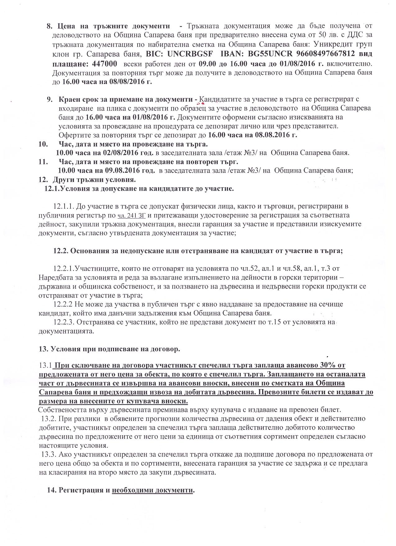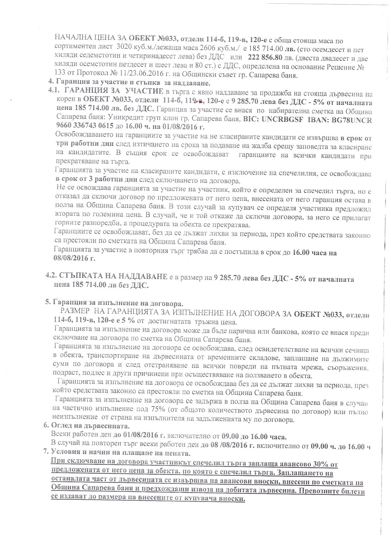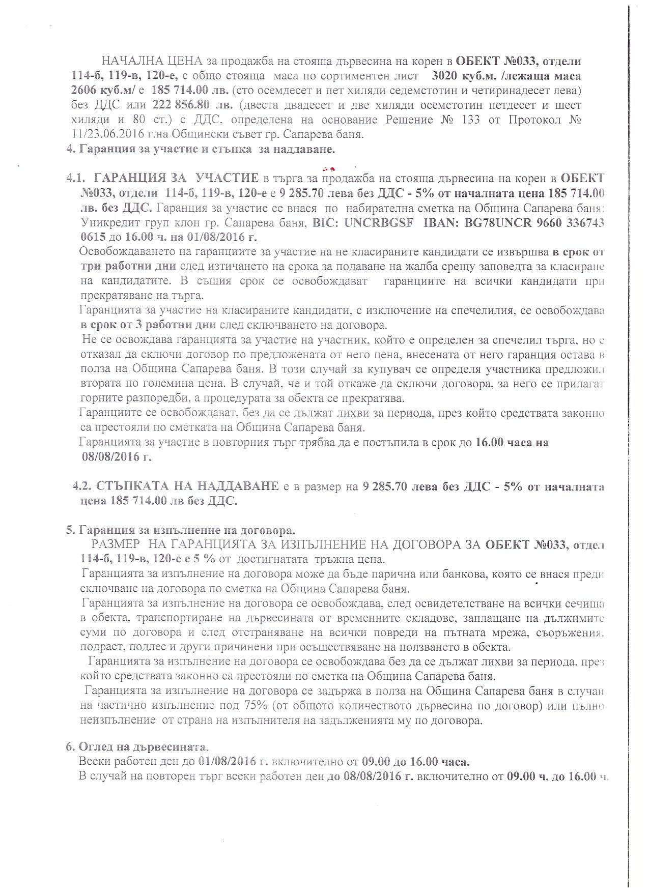 3.1.Гаранция за участие за обект № 033 – отдели 114-б, 119-в, 120-е - 5% от началната цена 185 714.00 без ДДС или 9 285.70 лева без ДДС. Гаранция за участие се внася по набирателна сметка на Община Сапарева баня: Уникредит груп клон гр. Сапарева баня, BIC: UNCRBGSF IBAN: BG78UNCR 9660 3367430615 до 16.00 ч. на 01/08/2016 г.