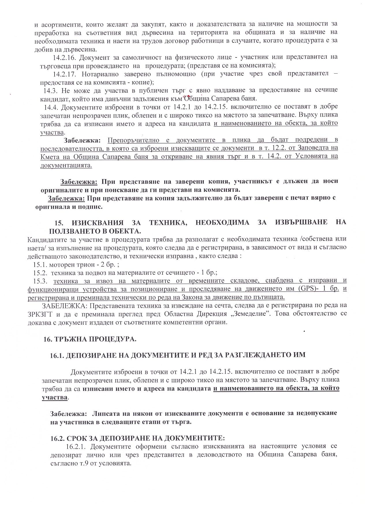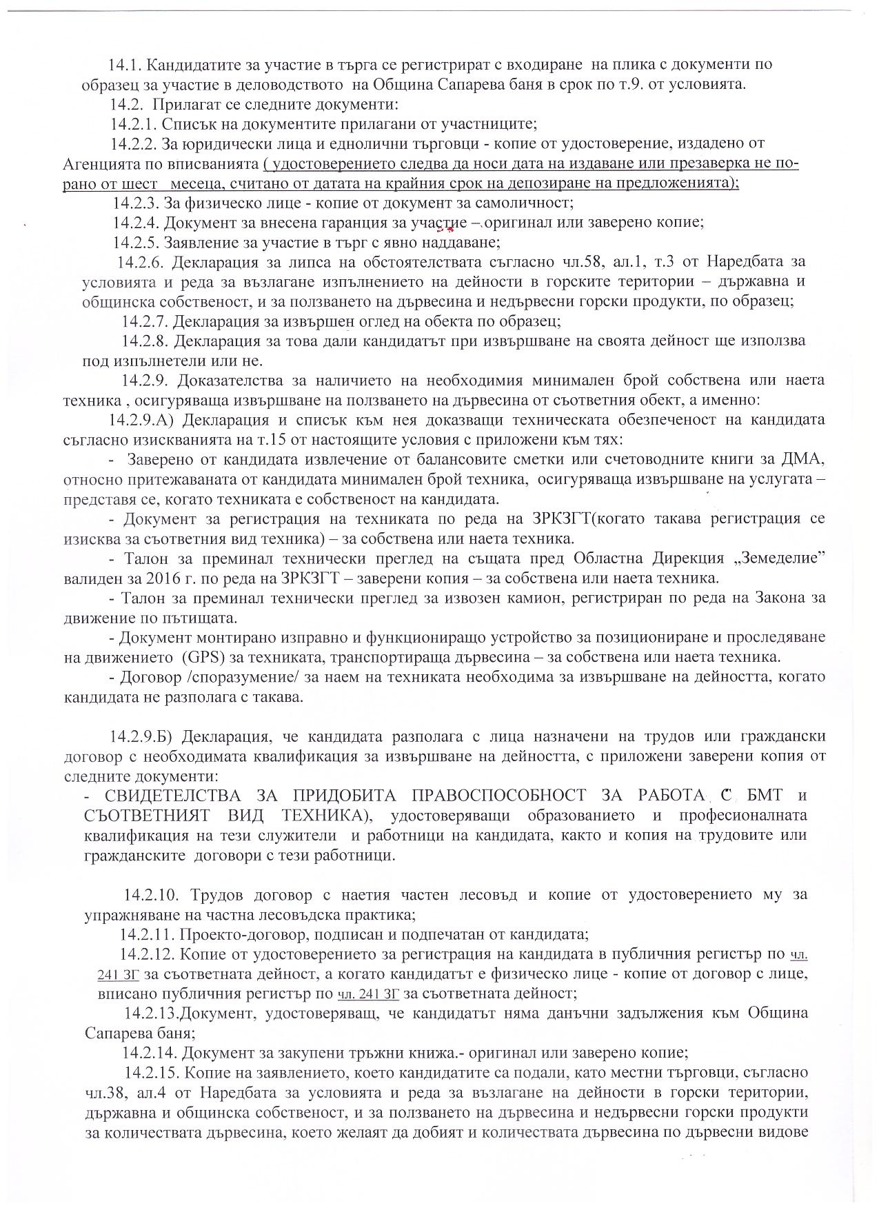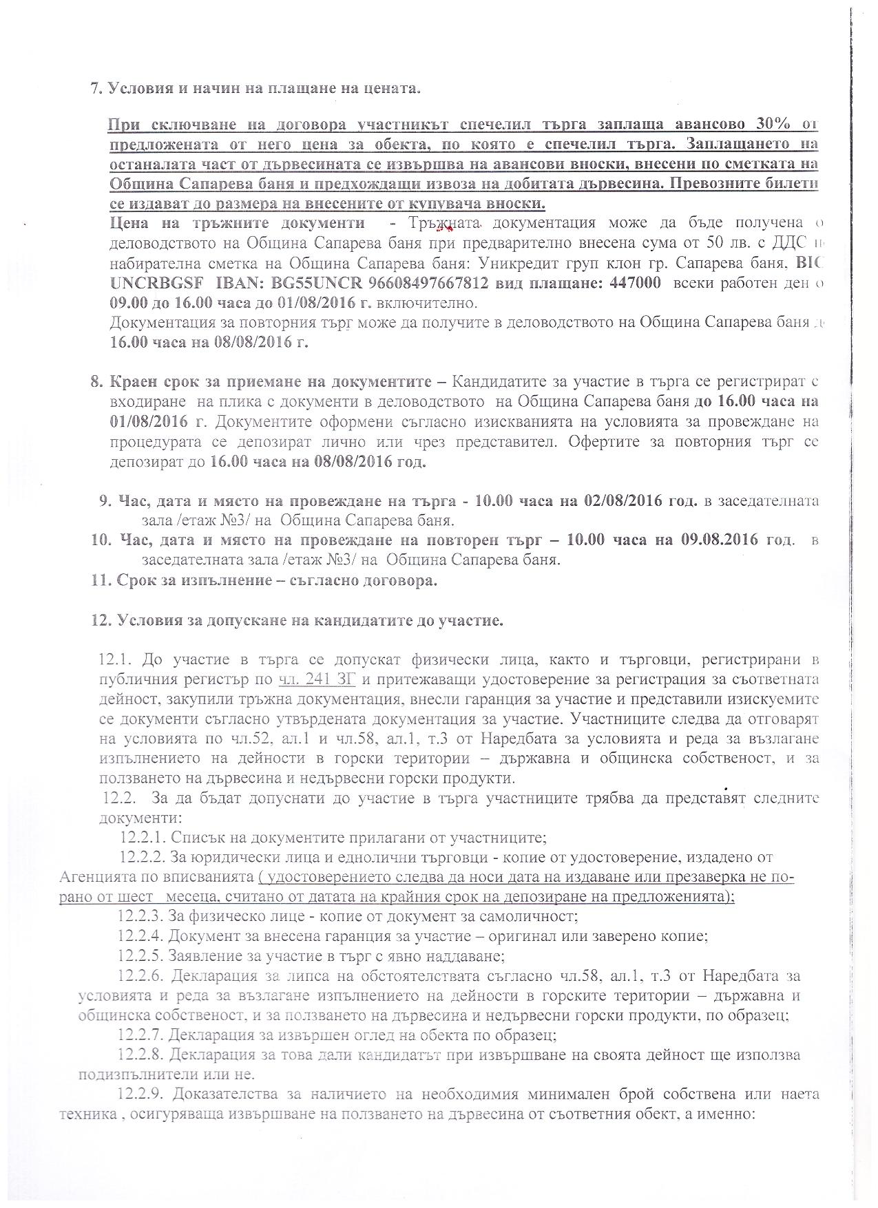 3.1.Гаранция за участие за обект № 033 – отдели 114-б, 119-в, 120-е - 5% от началната цена 185 714.00 без ДДС или 9 285.70 лева без ДДС. Гаранция за участие се внася по набирателна сметка на Община Сапарева баня: Уникредит груп клон гр. Сапарева баня, BIC: UNCRBGSF IBAN: BG78UNCR 9660 3367430615 до 16.00 ч. на 01/08/2016 г.