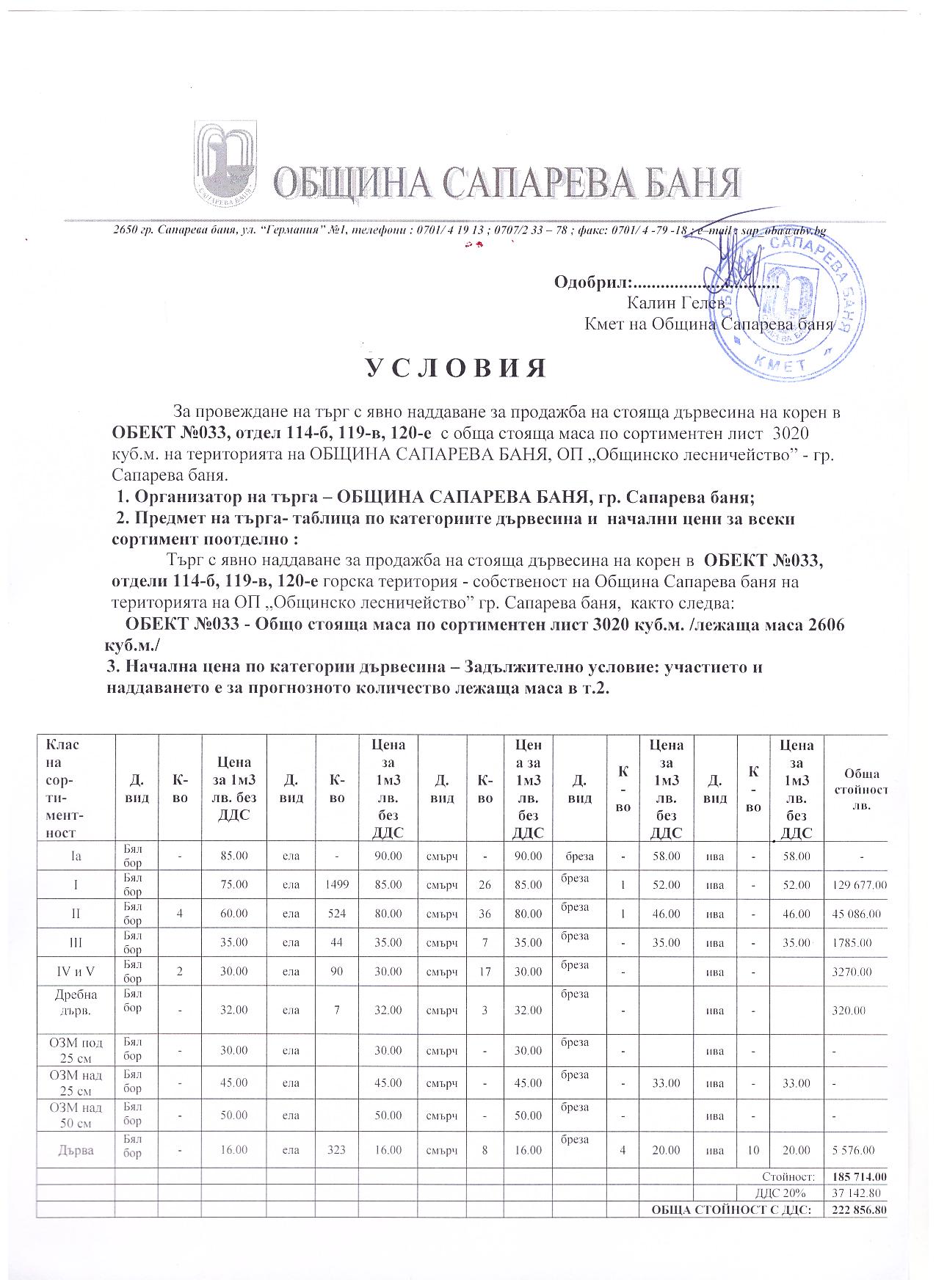 Продажба на стояща дървесина на корен в обект №033, отдели 114-б, 119-в, 120-е, собственост на Община Сапарева баня. Обща стояща маса по сортиментен лист 3020 куб.м. /лежаща маса 2606 куб.м./, начална цена за обекта -;