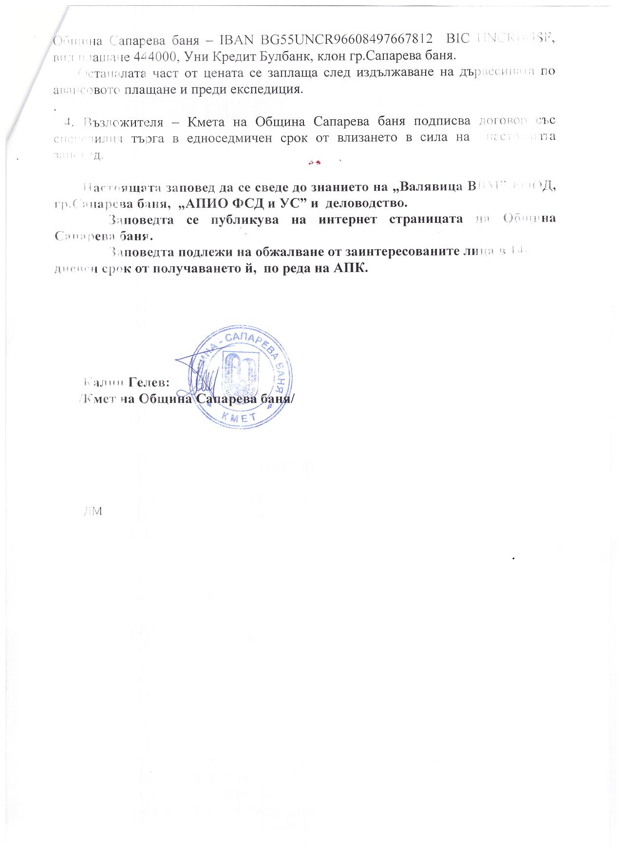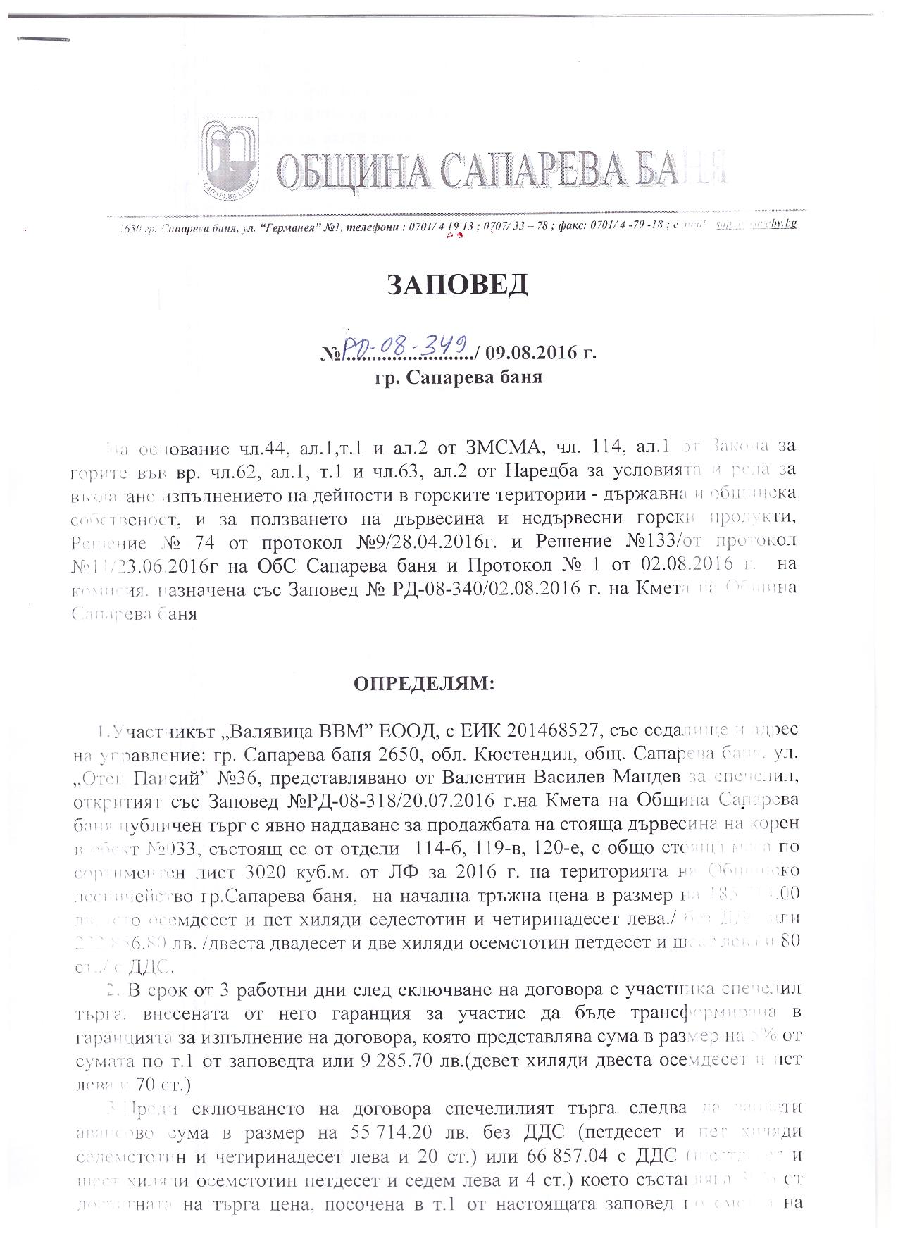 Заповед №РД-08-349/09.08.2016г. на кмета на община Сапарева баня