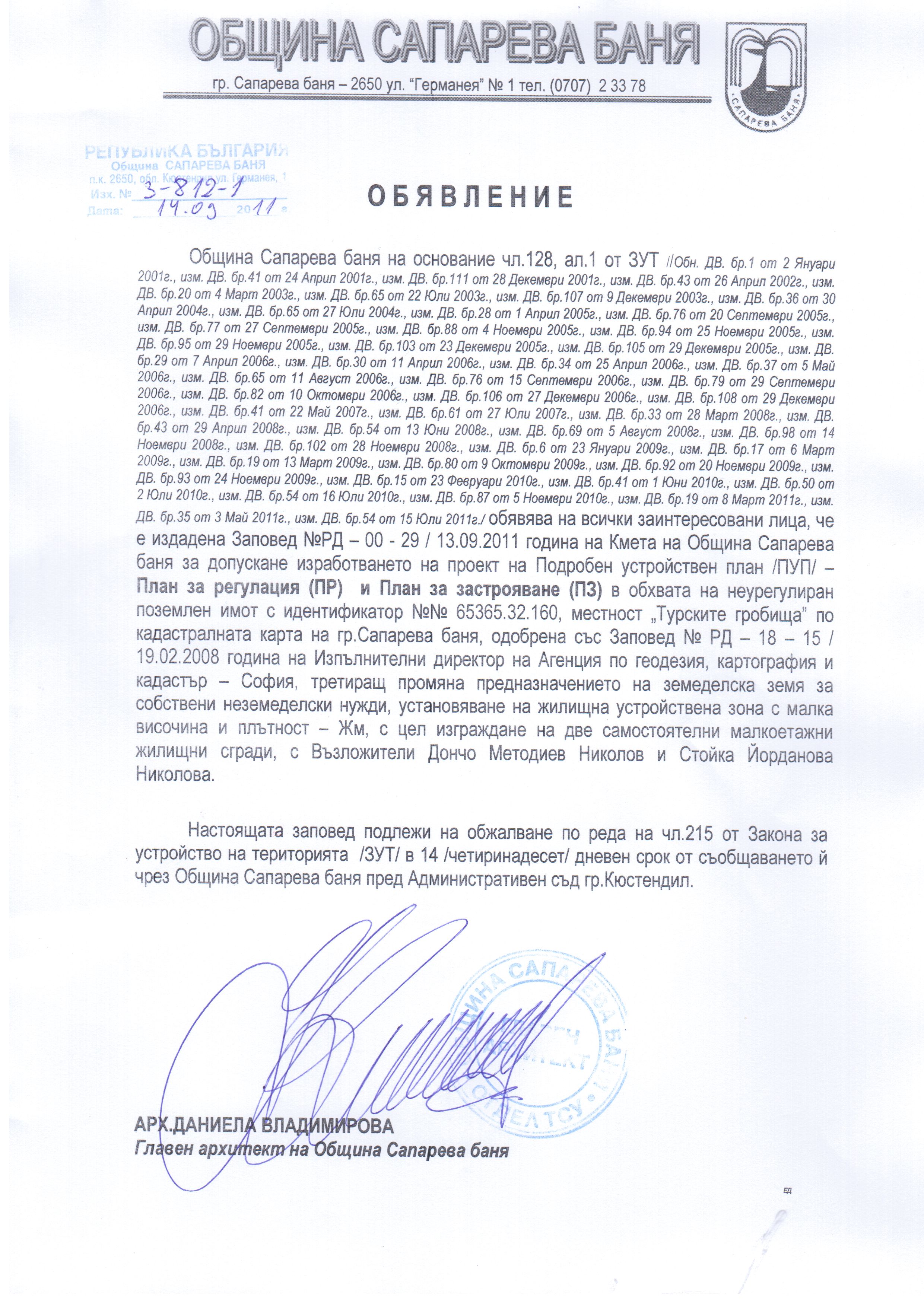 Община Сапарева баня на основание чл.128, ал.1 от ЗУТ /Обн. ДВ. бр.1 от 2 Януари 2001г., изм. ДВ. бр.41 от 24 Април 2001г., изм. ДВ. бр.111 от 28 Декември 2001г., изм. ДВ. бр.43 от 26 Април 2002г., изм. ДВ. бр.20 от 4 Март 2003г., изм. ДВ. бр.65 от 22 Юли 2003г., изм. ДВ. бр.107 от 9 Декември 2003г., изм. ДВ. бр.36 от 30 Април 2004г., изм. ДВ. бр.65 от 27 Юли 2004г., изм. ДВ. бр.28 от 1 Април 2005г., изм. ДВ. бр.76 от 20 Септември 2005г., изм. ДВ. бр.77 от 27 Септември 2005г., изм. ДВ. бр.88 от 4 Ноември 2005г., изм. ДВ. бр.94 от 25 Ноември 2005г., изм. ДВ. бр.95 от 29 Ноември 2005г., изм. ДВ. бр.103 от 23 Декември 2005г., изм. ДВ. бр.105 от 29 Декември 2005г., изм. ДВ. бр.29 от 7 Април 2006г., изм. ДВ. бр.30 от 11 Април 2006г., изм. ДВ. бр.34 от 25 Април 2006г., изм. ДВ. бр.37 от 5 Май 2006г., изм. ДВ. бр.65 от 11 Август 2006г., изм. ДВ. бр.76 от 15 Септември 2006г., изм. ДВ. бр.79 от 29 Септември 2006г., изм. ДВ. бр.82 от 10 Октомври 2006г., изм. ДВ. бр.106 от 27 Декември 2006г., изм. ДВ. бр.108 от 29 Декември 2006г., изм. ДВ. бр.41 от 22 Май 2007г., изм. ДВ. бр.61 от 27 Юли 2007г., изм. ДВ. бр.33 от 28 Март 2008г., изм. ДВ. бр.43 от 29 Април 2008г., изм. ДВ. бр.54 от 13 Юни 2008г., изм. ДВ. бр.69 от 5 Август 2008г., изм. ДВ. бр.98 от 14 Ноември 2008г., изм. ДВ. бр.102 от 28 Ноември 2008г., изм. ДВ. бр.6 от 23 Януари 2009г., изм. ДВ. бр.17 от 6 Март 2009г., изм. ДВ. бр.19 от 13 Март 2009г., изм. ДВ. бр.80 от 9 Октомври 2009г., изм. ДВ. бр.92 от 20 Ноември 2009г., изм. ДВ. бр.93 от 24 Ноември 2009г., изм. ДВ. бр.15 от 23 Февруари 2010г., изм. ДВ. бр.41 от 1 Юни 2010г., изм. ДВ. бр.50 от 2 Юли 2010г., изм. ДВ. бр.54 от 16 Юли 2010г., изм. ДВ. бр.87 от 5 Ноември 2010г., изм. ДВ. бр.19 от 8 Март 2011г., изм. ДВ. бр.35 от 3 Май 2011г., изм. ДВ. бр.54 от 15 Юли 2011г./ обявява на всички заинтересовани лица, че е издадена Заповед №РД - 00 - 29 / 13.09.2011 година на Кмета на Община Сапарева баня за допускане изработването на проект на Подробен устройствен план /ПУП/ - План за регулация (ПР) и План за застрояване (ПЗ) в обхвата на неурегулиран поземлен имот с идентификатор № 65365.32.160, местност „Турските гробища" по кадастралната карта на гр.Сапарева баня, одобрена със Заповед № РД - 18 - 15 / 19.02.2008 година на Изпълнителни директор на Агенция по геодезия, картография и кадастър - София, третиращ промяна предназначението на земеделска земя за собствени неземеделски нужди, установяване на жилищна устройствена зона с малка височина и плътност - Жм, с цел изграждане на две самостоятелни малкоетажни жилищни сгради, с възложители Дончо Методиев Николов и Стойка Йорданова Николова.