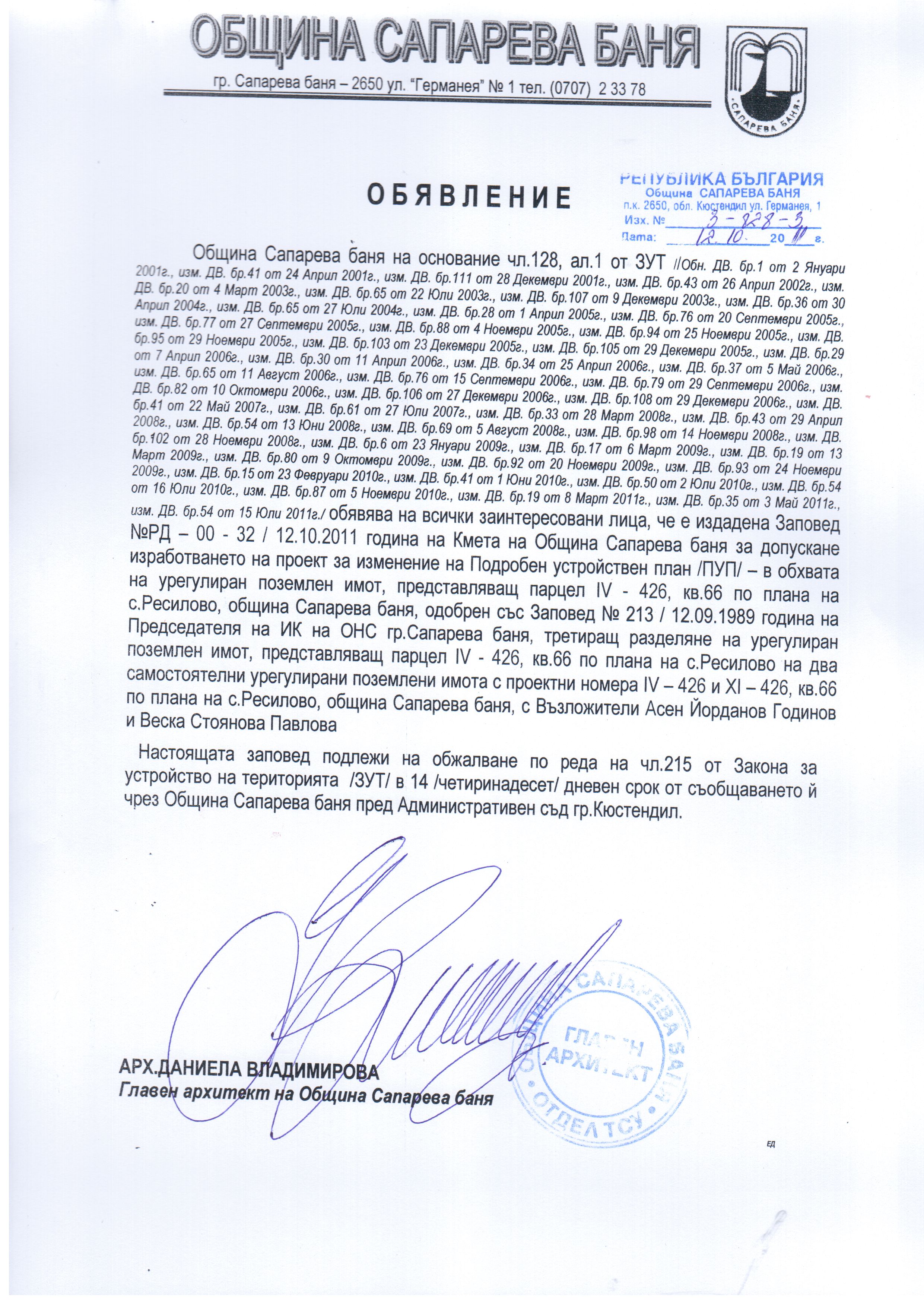Община Сапарева баня на основание чл.128, ал.1 от ЗУТ /Обн. ДВ. бр.1 от 2 Януари 2001г., изм. ДВ. бр.41 от 24 Април 2001г., изм. ДВ. бр.111 от 28 Декември 2001г., изм. ДВ. бр.43 от 26 Април 2002г., изм. ДВ. бр.20 от 4 Март 2003г., изм. ДВ. бр.65 от 22 Юли 2003г., изм. ДВ. бр.107 от 9 Декември 2003г., изм. ДВ. бр.36 от 30 Април 2004г., изм. ДВ. бр.65 от 27 Юли 2004г., изм. ДВ. бр.28 от 1 Април 2005г., изм. ДВ. бр.76 от 20 Септември 2005г., изм. ДВ. бр.77 от 27 Септември 2005г., изм. ДВ. бр.88 от 4 Ноември 2005г., изм. ДВ. бр.94 от 25 Ноември 2005г., изм. ДВ. бр.95 от 29 Ноември 2005г., изм. ДВ. бр.103 от 23 Декември 2005г., изм. ДВ. бр.105 от 29 Декември 2005г., изм. ДВ. бр.29 от 7 Април 2006г., изм. ДВ. бр.30 от 11 Април 2006г., изм. ДВ. бр.34 от 25 Април 2006г., изм. ДВ. бр.37 от 5 Май 2006г., изм. ДВ. бр.65 от 11 Август 2006г., изм. ДВ. бр.76 от 15 Септември 2006г., изм. ДВ. бр.79 от 29 Септември 2006г., изм. ДВ. бр.82 от 10 Октомври 2006г., изм. ДВ. бр.106 от 27 Декември 2006г., изм. ДВ. бр.108 от 29 Декември 2006г., изм. ДВ. бр.41 от 22 Май 2007г., изм. ДВ. бр.61 от 27 Юли 2007г., изм. ДВ. бр.33 от 28 Март 2008г., изм. ДВ. бр.43 от 29 Април 2008г., изм. ДВ. бр.54 от 13 Юни 2008г., изм. ДВ. бр.69 от 5 Август 2008г., изм. ДВ. бр.98 от 14 Ноември 2008г., изм. ДВ. бр.102 от 28 Ноември 2008г., изм. ДВ. бр.6 от 23 Януари 2009г., изм. ДВ. бр.17 от 6 Март 2009г., изм. ДВ. бр.19 от 13 Март 2009г., изм. ДВ. бр.80 от 9 Октомври 2009г., изм. ДВ. бр.92 от 20 Ноември 2009г., изм. ДВ. бр.93 от 24 Ноември 2009г., изм. ДВ. бр.15 от 23 Февруари 2010г., изм. ДВ. бр.41 от 1 Юни 2010г., изм. ДВ. бр.50 от 2 Юли 2010г., изм. ДВ. бр.54 от 16 Юли 2010г., изм. ДВ. бр.87 от 5 Ноември 2010г., изм. ДВ. бр.19 от 8 Март 2011г., изм. ДВ. бр.35 от 3 Май 2011г., изм. ДВ. бр.54 от 15 Юли 2011г./ обявява на всички заинтересовани лица, че е издадена Заповед №РД - 00 - 32 / 12.10.2011 година на Кмета на Община Сапарева баня за допускане изработването на проект за изменение на Подробен устройствен план /ПУП/ - в обхвата на урегулиран поземлен имот, представляващ парцел ІV - 426, кв.66 по плана на с.Ресилово, община Сапарева баня, одобрен със Заповед № 213 / 12.09.1989 година на Председателя на ИК на ОНС гр.Сапарева баня, третиращ разделяне на урегулиран поземлен имот, представляващ парцел ІV - 426, кв.66 по плана на с.Ресилово на два самостоятелни урегулирани поземлени имота с проектни номера ІV - 426 и ХІ - 426, кв.66 по плана на с.Ресилово, община Сапарева баня, с Възложители Aсен Йорданов Годинов и Веска Стоянова Павлова.