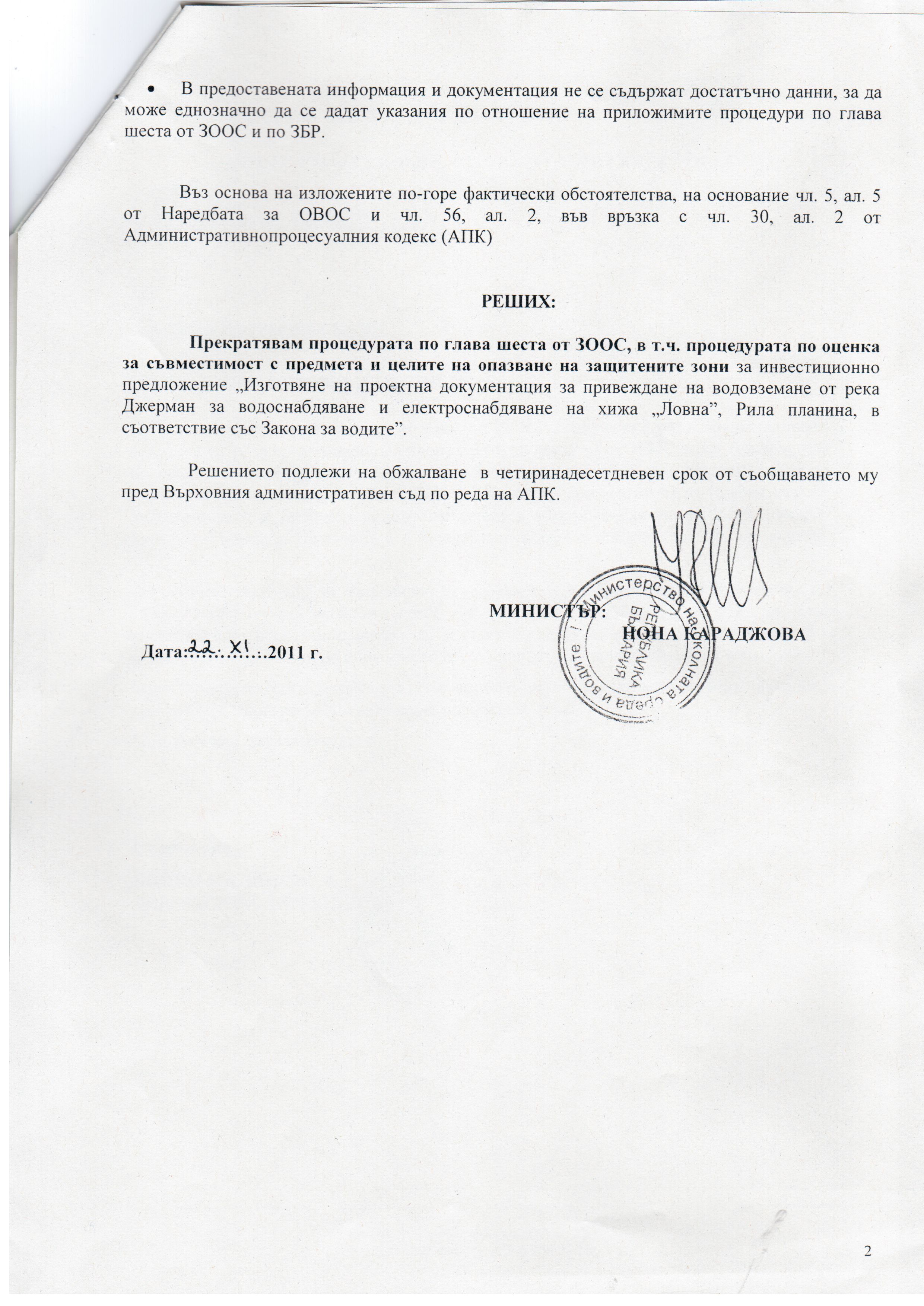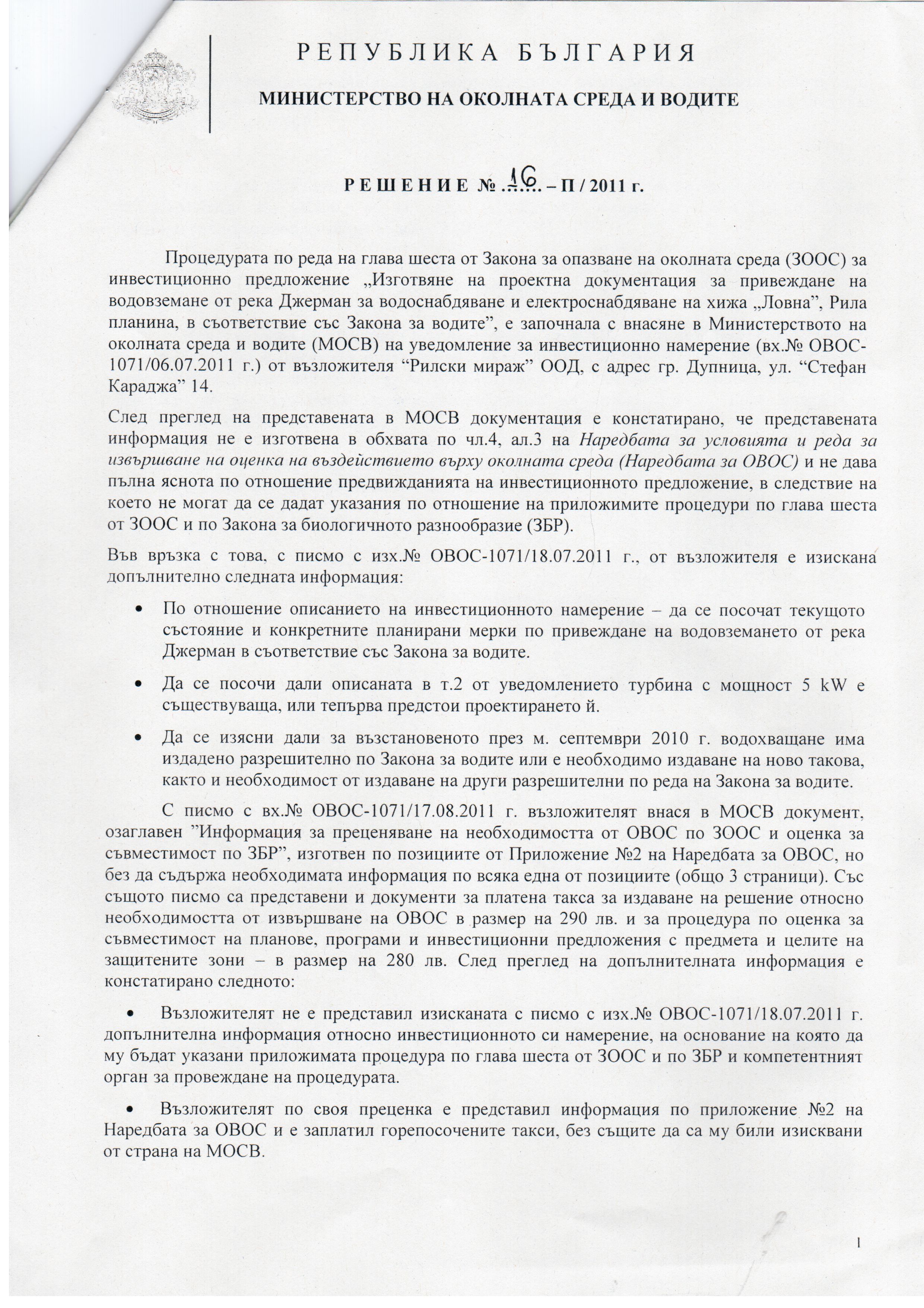 Процедура по реда на глава шеста от Закона за опазване на околната среда за инвестиционно предложение „Изготвяне на проектна документация за привеждане на водовземане от река Джерман за водоснабдяване и електроснабдяване на хижа „Ловна", Рила планина, в съответствие със Закона за водите", е започнала с внасяне в Министерство на околната среда и водите на уведомление за инвестиционно намерение от възложител „Рилски мираж" ООД.