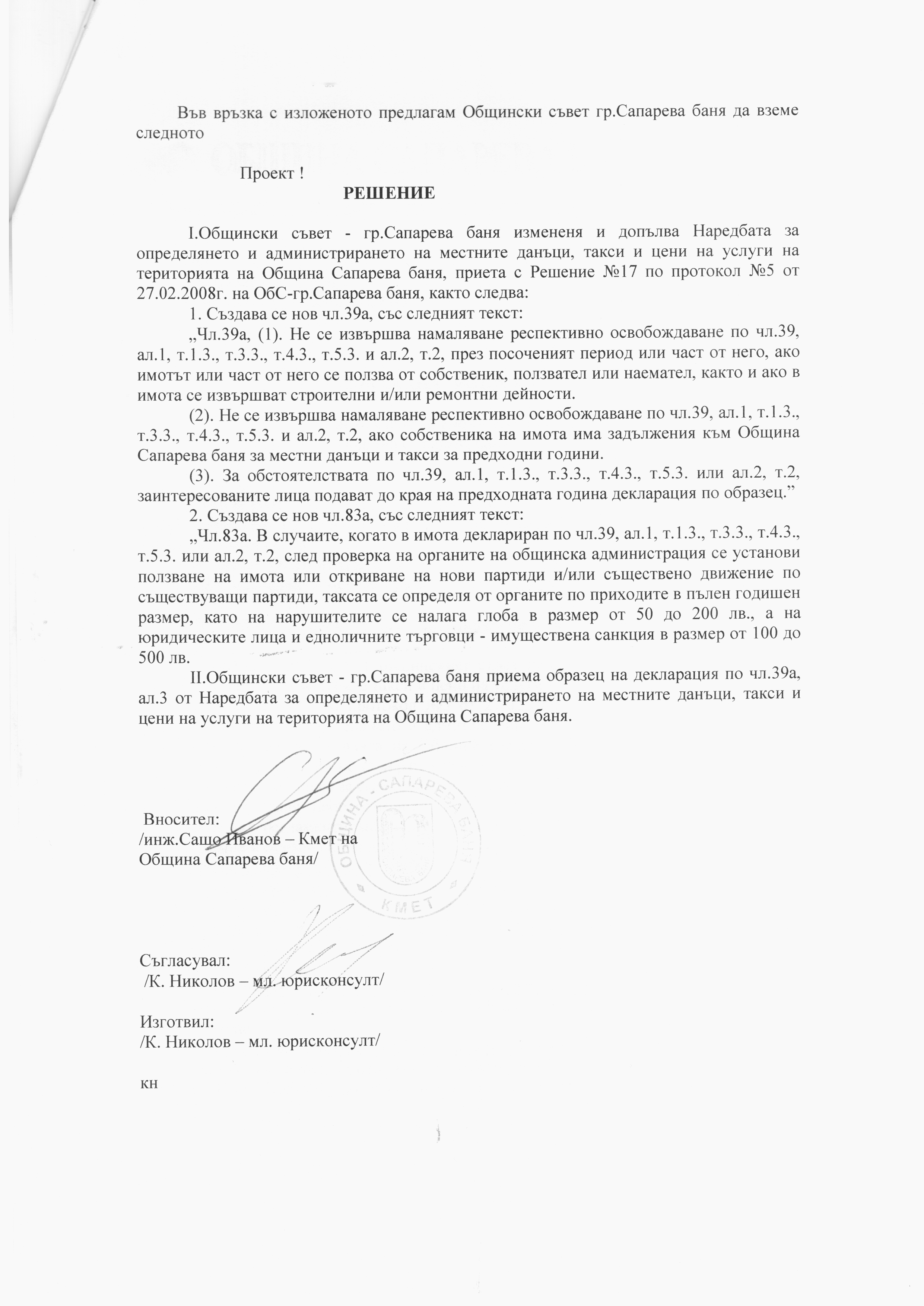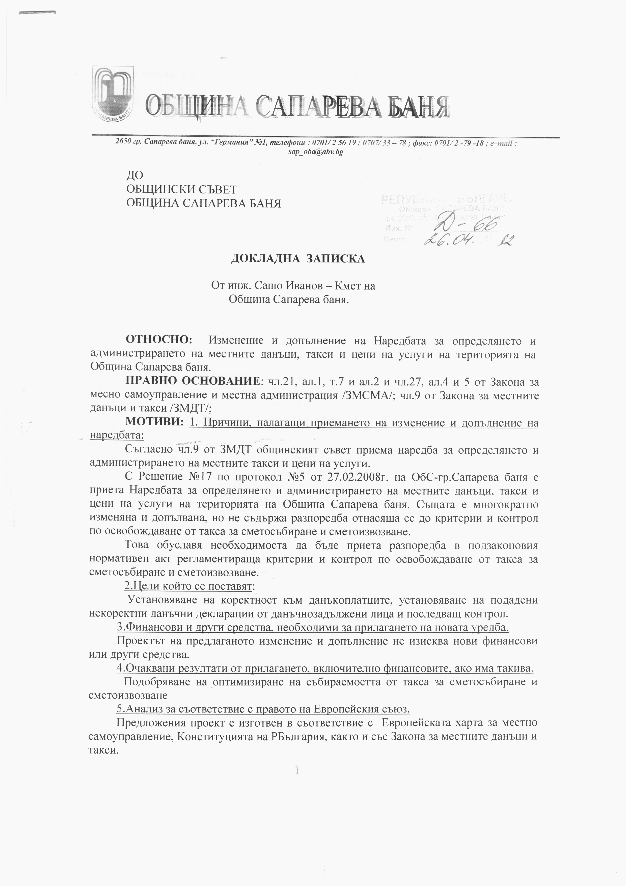 Докладна записка относно допълнение и изменение на Наредбата за определянето и администрирането на местните данъци, такси и цени на услуги