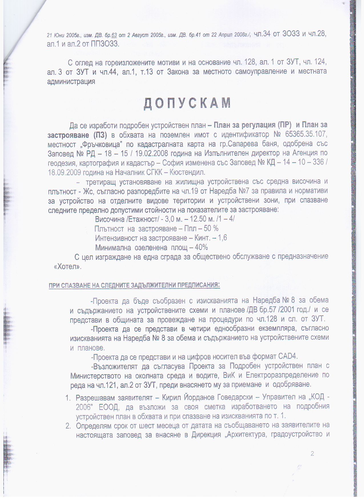 На основание чл. 128, ал.1 от Закона за устройство на територията, Община Сапарева баня съобщава за постановена на 17.07.2012 г. Заповед № РД - 00 - 31 / 2012 г. на Кмета на Община Сапарева баня за допускане изработването на проект на Подробен устройствен план /ПУП/ - План за регулация (ПР) и План за застрояване (ПЗ) в обхвата на поземлен имот с идентификатор № 65365.35.107, местност „Фръчковица" по кадастралната карта на гр.Сапарева баня, третиращ промяна на земеделска земя за собствени неземеделски нужди - установяване на жилищна устройствена зона със средна височина и плътност - Жс, с цел изграждане на една средноетажна сграда за обществено обслужване с предназначение «Хотел», с Възложител «КОД - 2006» ЕООД.