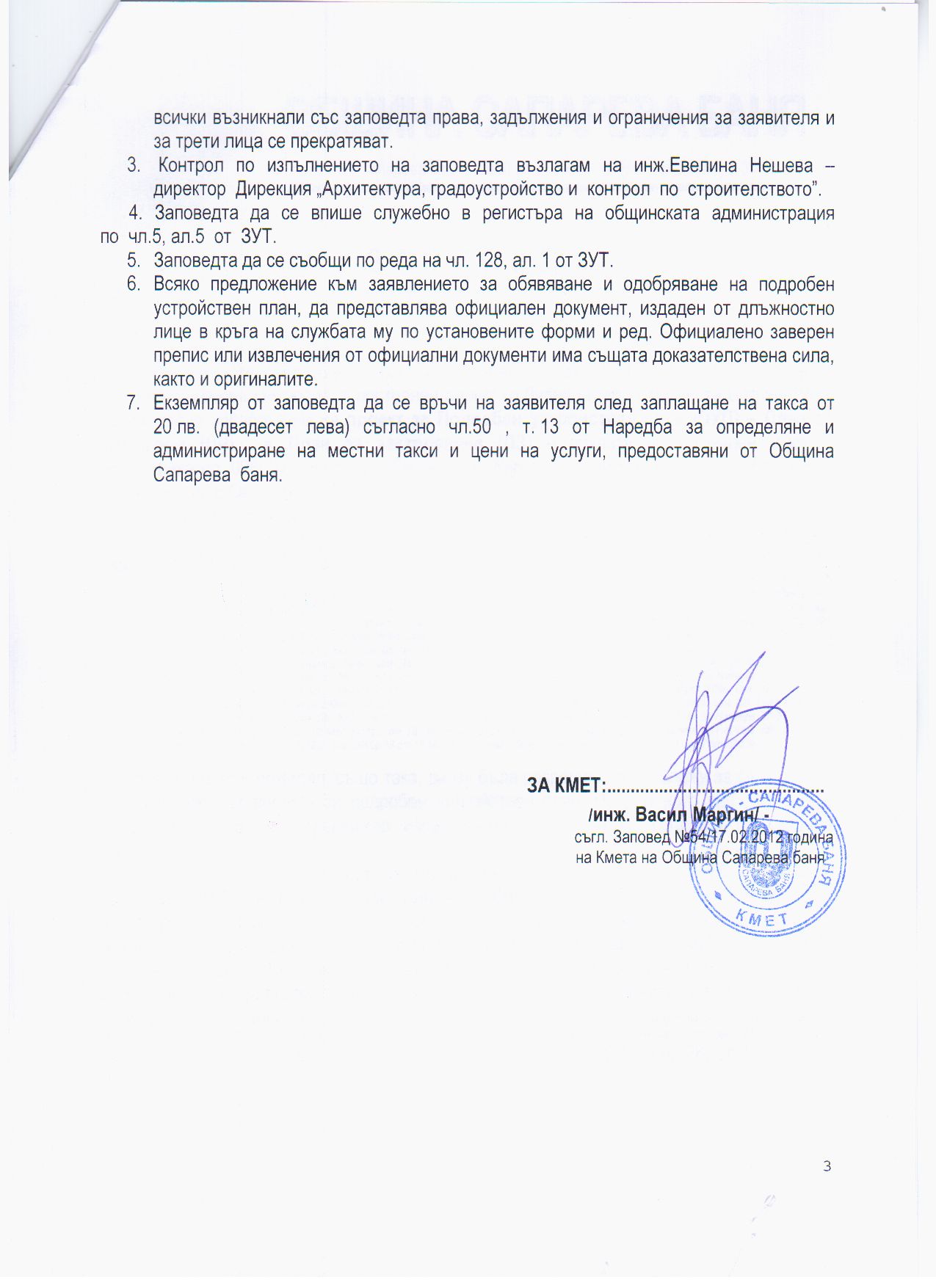 Община Сапарева баня на основание чл.128, ал. 1 от ЗУТ обявява на всички заинтересовани лица, че е издадена Заповед №РД-00-34/17.07.2012 година на Кмета на Община Сапарева баня за допускане изготвянето на  Проект за Подробен устройствен план - План за регулация (ПР)  и План за застрояване (ПЗ) в обхват поземлен имот  с идентификатор 028092, месност «Герено» по Картата на възстановената собственост землището на с.Овчарци, третиращ  промяна на предназначението на земеделска  земя  за  неземеделски  нужди,  установяване на жилищна  устройствена  зона с преобладаващо  застрояване  с малка височина  и  плътност - Жм,  с цел изграждане на една малкоетажна жилищна сграда, с Възложител Стойка Йорданова Николова.