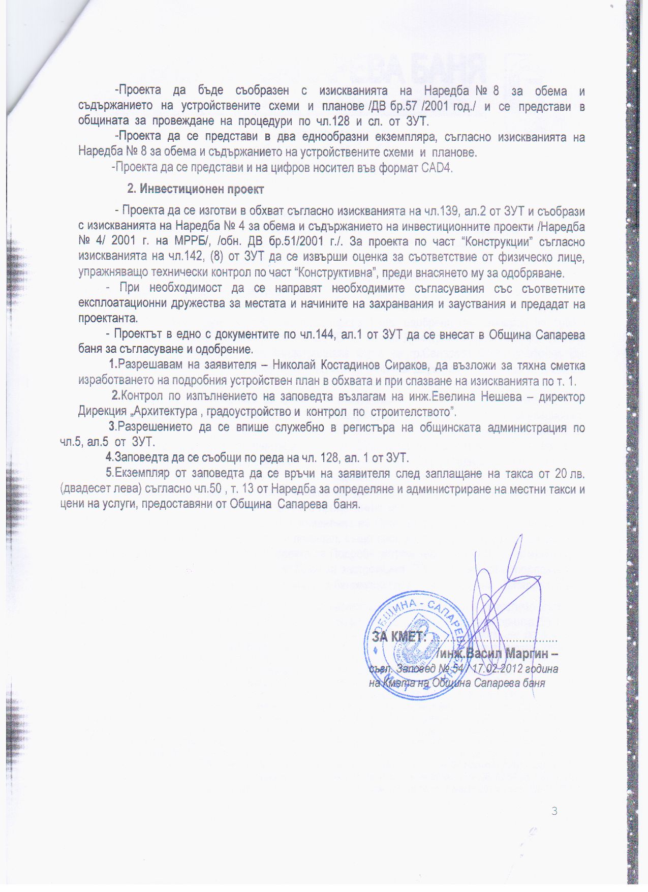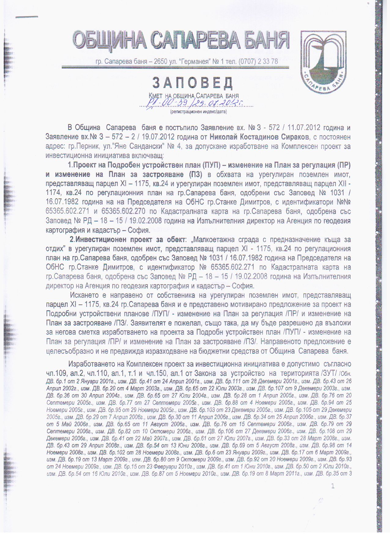 На основание чл. 128, ал.1 от Закона за устройство на територията, Община Сапарева баня съобщава за постановена на 25.07.2012 г. Заповед № РД - 00 - 39 / 2012 г. на Кмета на Община Сапарева баня за допускане изработването на Комплексен проект за инвестиционна инициатива включващ: