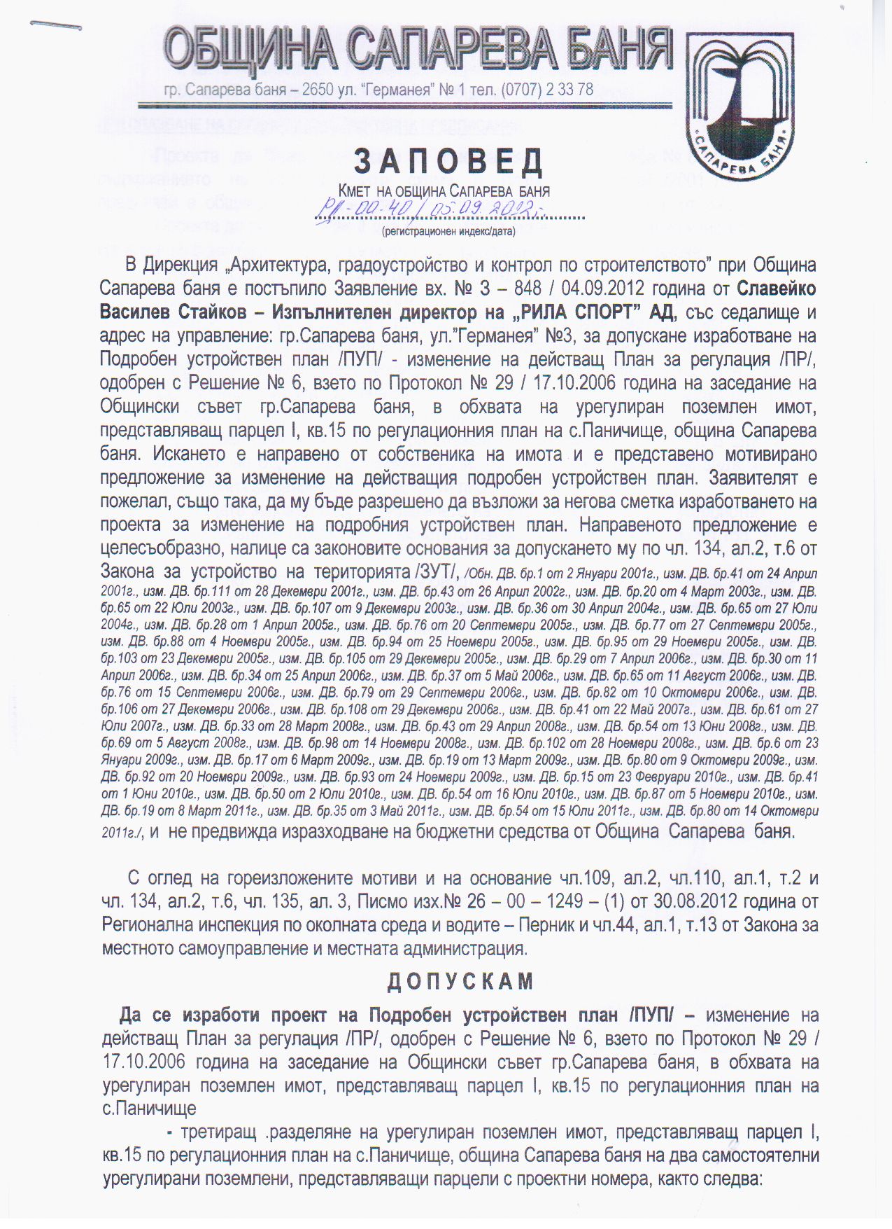 На основание чл. 128, ал.1 от Закона за устройство на територията, Община Сапарева баня съобщава за постановена на 05.09.2012 г. Заповед № РД - 00 - 40 / 2012 г. на Кмета на Община Сапарева баня за допускане изработването на проект на Подробен устройствен план /ПУП/ - изменение на План за регулация /ПР/ одобрен с Решение № 6, взето по Протокол № 29 / 17.10.2006 година на заседание на Общински съвет гр.Сапарева баня, в обхват на урегулиран поземлен имот, представляващ парцел І, кв.15 по регулационния план на с.Паничище, община Сапарева баня, третиращ разделянето му на два самостоятелни урегулирани поземлени имота представляващи парцели І и ІХ, кв.15 по плана на с.Паничище, община Сапарева баня, с Възложител „РИЛА СПОРТ" АД представлявана от Изпълнителен директор Славейко Стайков.