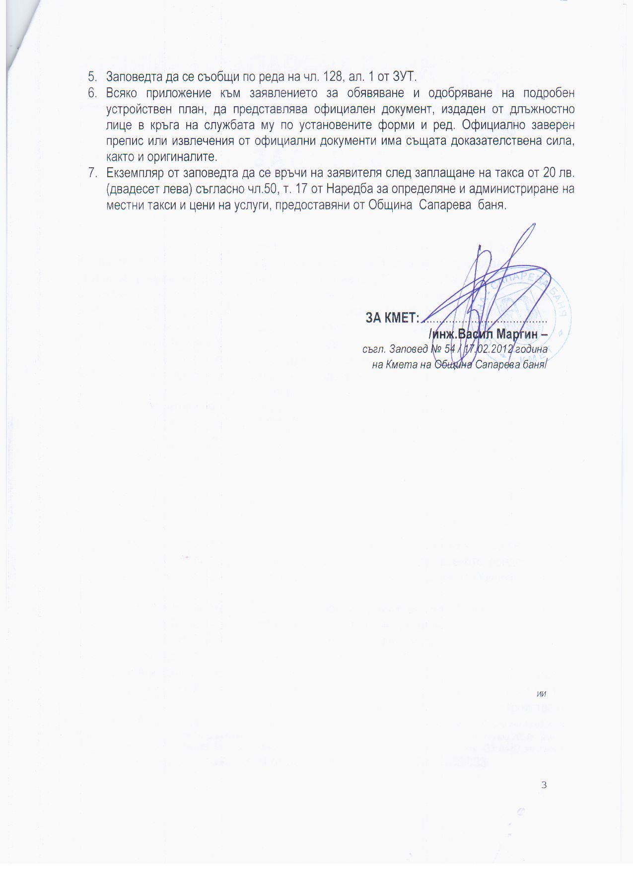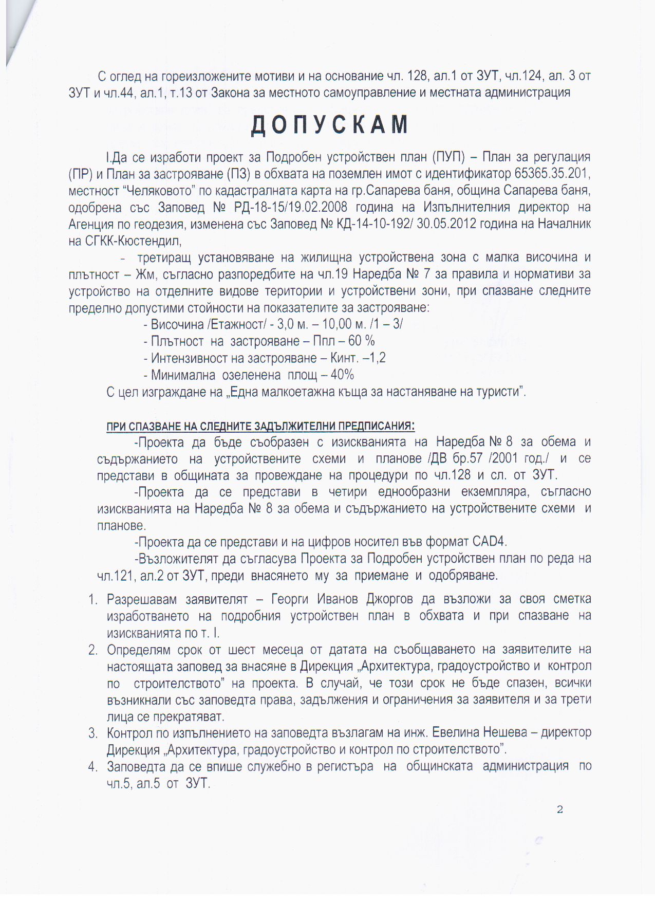 Община Сапарева баня на основание чл.128, ал.1 от Закона за устройство на територията /ЗУТ/ обявява на всички заинтересовани лица, че е издадена Заповед № РД-00-49/08.10.2012 година на Кмета на Община Сапарева баня за допускане изготвяне на Проект за Подробен устройствен план (ПУП) - План за регулация (ПР) и План за застрояване (ПЗ) в обхвата на поземлен имот с идентификатор 65365.35.201, местност "Челяковото", по кадастралната карта на гр.Сапарева баня, община Сапарева баня, третиращ промяна предназначението на земеделска земя за собствени неземеделски нужди - установяване на жилищна устройствена зона с малка височина и плътност - Жм, с цел изграждане на „Една малкоетажна къща за настаняване на туристи", с Възложител Георги Иванов Джоргов.