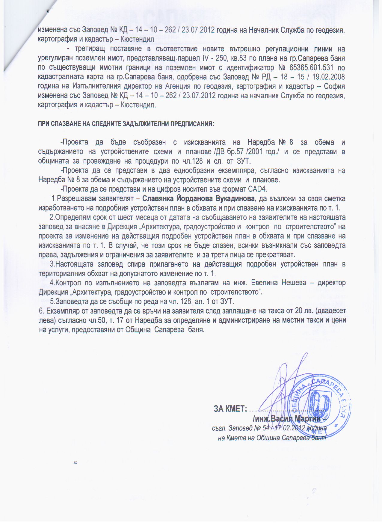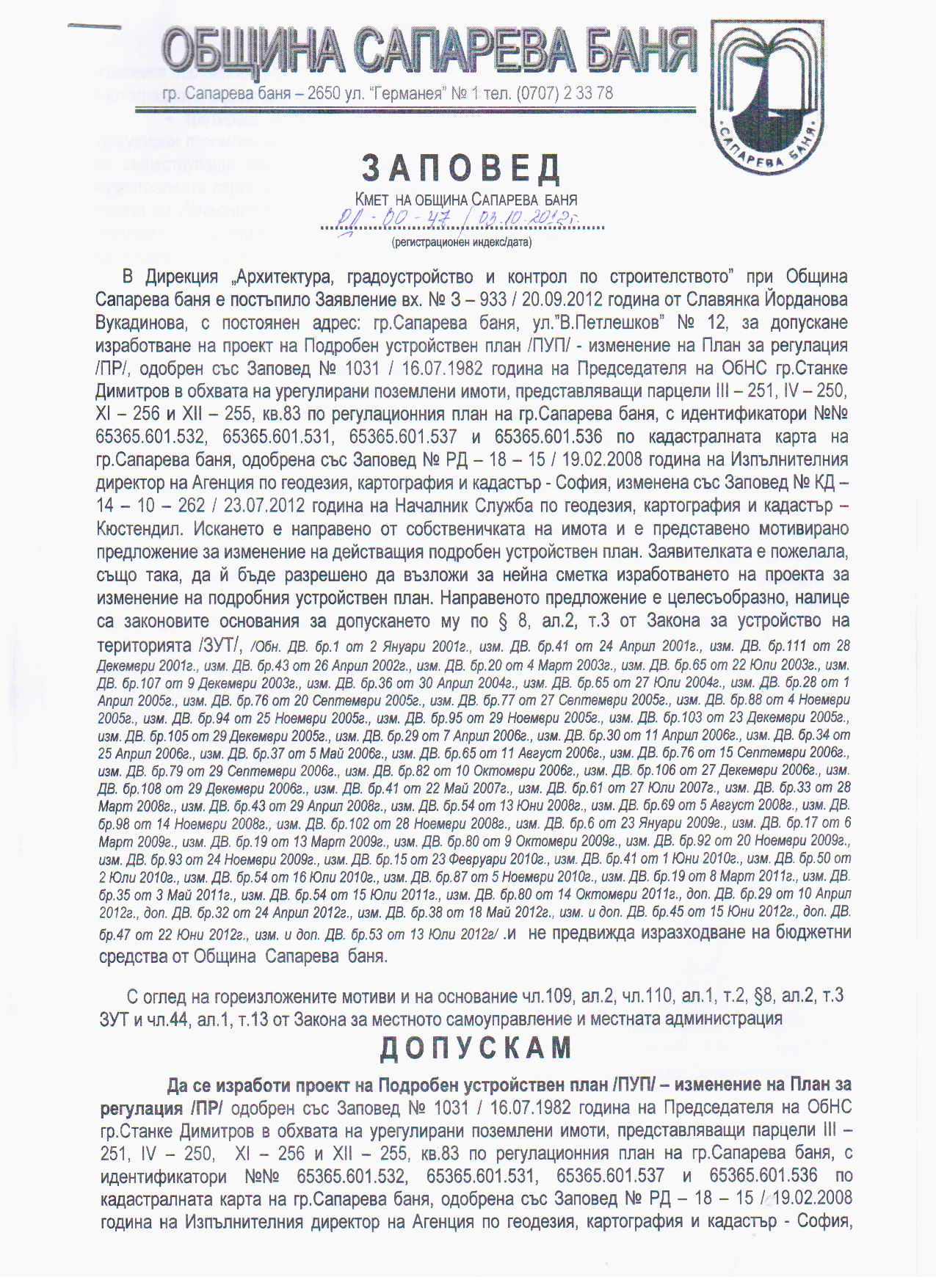 На основание чл. 128, ал.1 от Закона за устройство на територията, Община Сапарева баня съобщава за постановена на 03.10.2012 г. Заповед № РД - 00 - 47 / 2012 г. на Кмета на Община Сапарева баня за допускане изработването на проект на Подробен устройствен план /ПУП/ - изменение на План за регулация /ПР/ одобрен със Заповед № 1031 / 16.07.1982 година на Председателя на ОбНС гр.Станке Димитров в обхвата на урегулирани поземлени имоти, представляващи парцели ІІІ - 251, ІV - 250, ХІ - 256 и ХІІ - 255, кв.83 по регулационния план на гр.Сапарева баня, с идентификатори №№ 65365.601.532, 65365.601.531, 65365.601.537 и 65365.601.536 по кадастралната карта на гр.Сапарева баня, одобрена със Заповед № РД - 18 - 15 / 19.02.2008 година на Изпълнителния директор на Агенция по геодезия, картография и кадастър - София, изменена със Заповед № КД - 14 - 10 - 262 / 23.07.2012 година на Началник Служба по геодезия, картография и кадастър - Кюстендил, третиращ поставяне в съответствие новите вътрешно регулационни линии на урегулиран поземлен имот, представляващ парцел ІV - 250, кв.83 по плана на гр.Сапарева баня по съществуващи имотни граници на поземлен имот с идентификатор № 65365.601.531 по кадастралната карта на гр.Сапарева баня, одобрена със Заповед № РД - 18 - 15 / 19.02.2008 година на Изпълнителния директор на Агенция по геодезия, картография и кадастър - София изменена със Заповед № КД - 14 - 10 - 262 / 23.07.2012 година на началник Служба по геодезия, картография и кадастър - Кюстендил, с Възложител Славянка Йорданова Вукадинова.