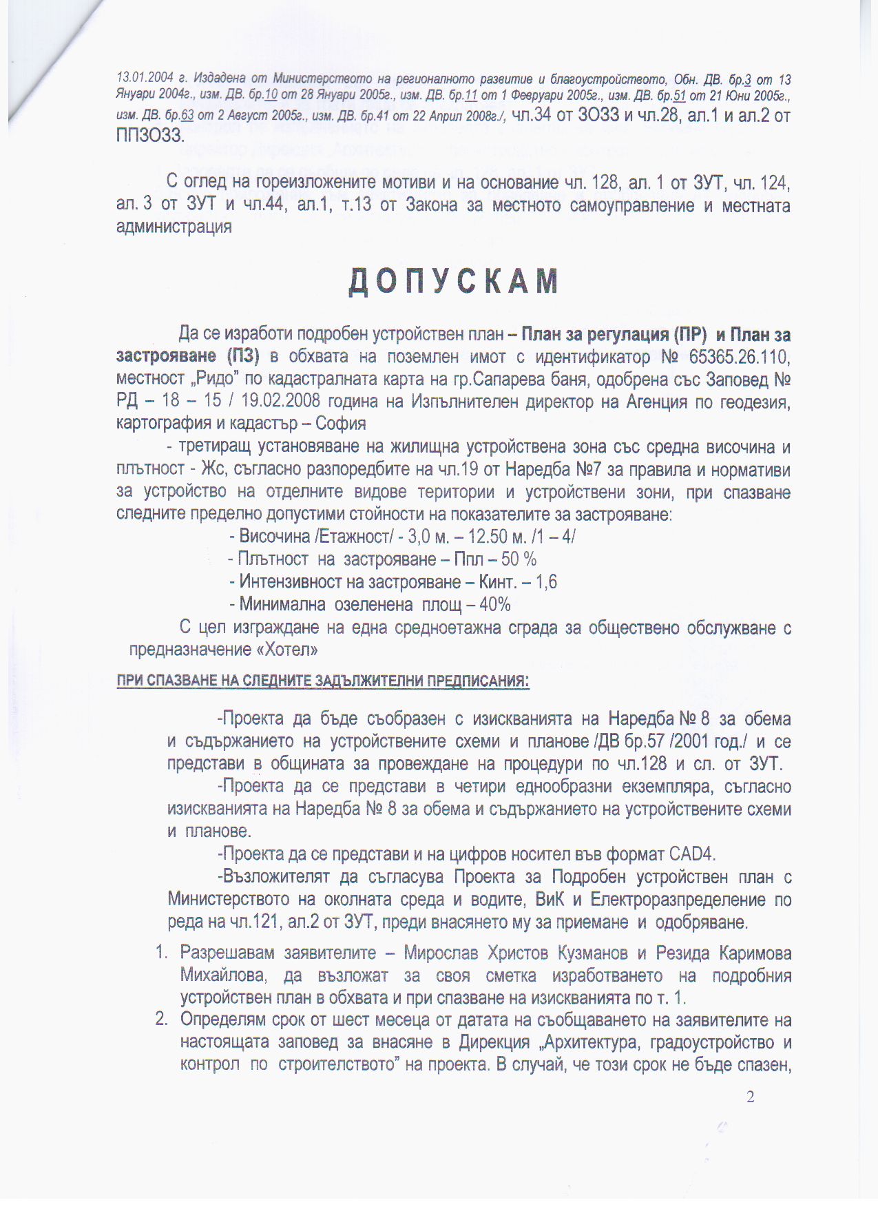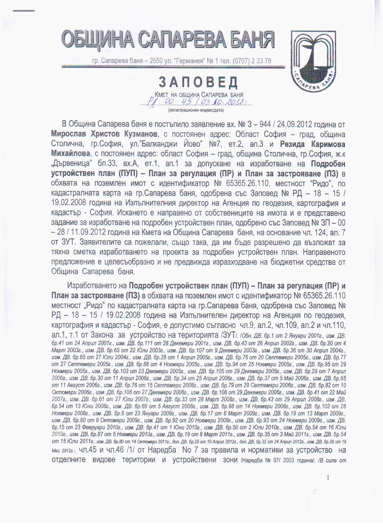 На основание чл. 128, ал.1 от Закона за устройство на територията, Община Сапарева баня съобщава за постановена на 03.10.2012 г. Заповед № РД - 00 - 45 / 2012 г. на Кмета на Община Сапарева баня за допускане изработването на проект на Подробен устройствен план /ПУП/ - План за регулация (ПР) и План за застрояване (ПЗ) в обхвата на поземлен имот с идентификатор № 65365.26.110, местност „Ридо" по кадастралната карта на гр.Сапарева баня, одобрена със Заповед № РД - 18 - 15 / 19.02.2008 година на Изпълнителен директор на Агенция по геодезия, картография и кадастър - София, третиращ установяване на жилищна устройствена зона със средна височина и плътност - Жс, с цел изграждане на една средноетажна сграда за обществено обслужване с предназначение «Хотел», с Възложители Мирослав Христов Кузманов и Резида Каримова Михайлова.