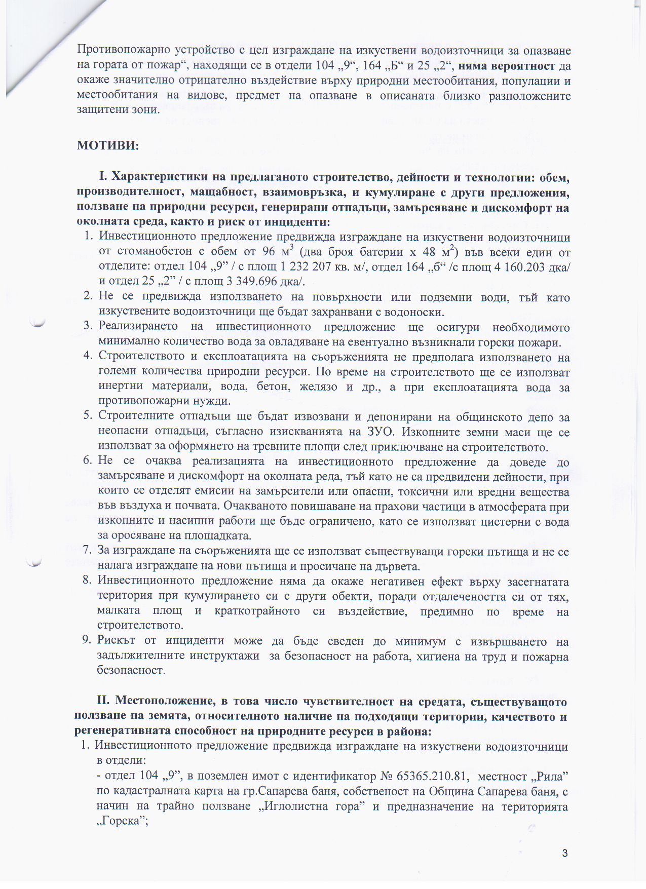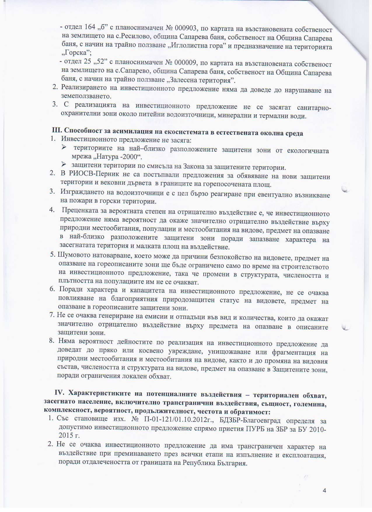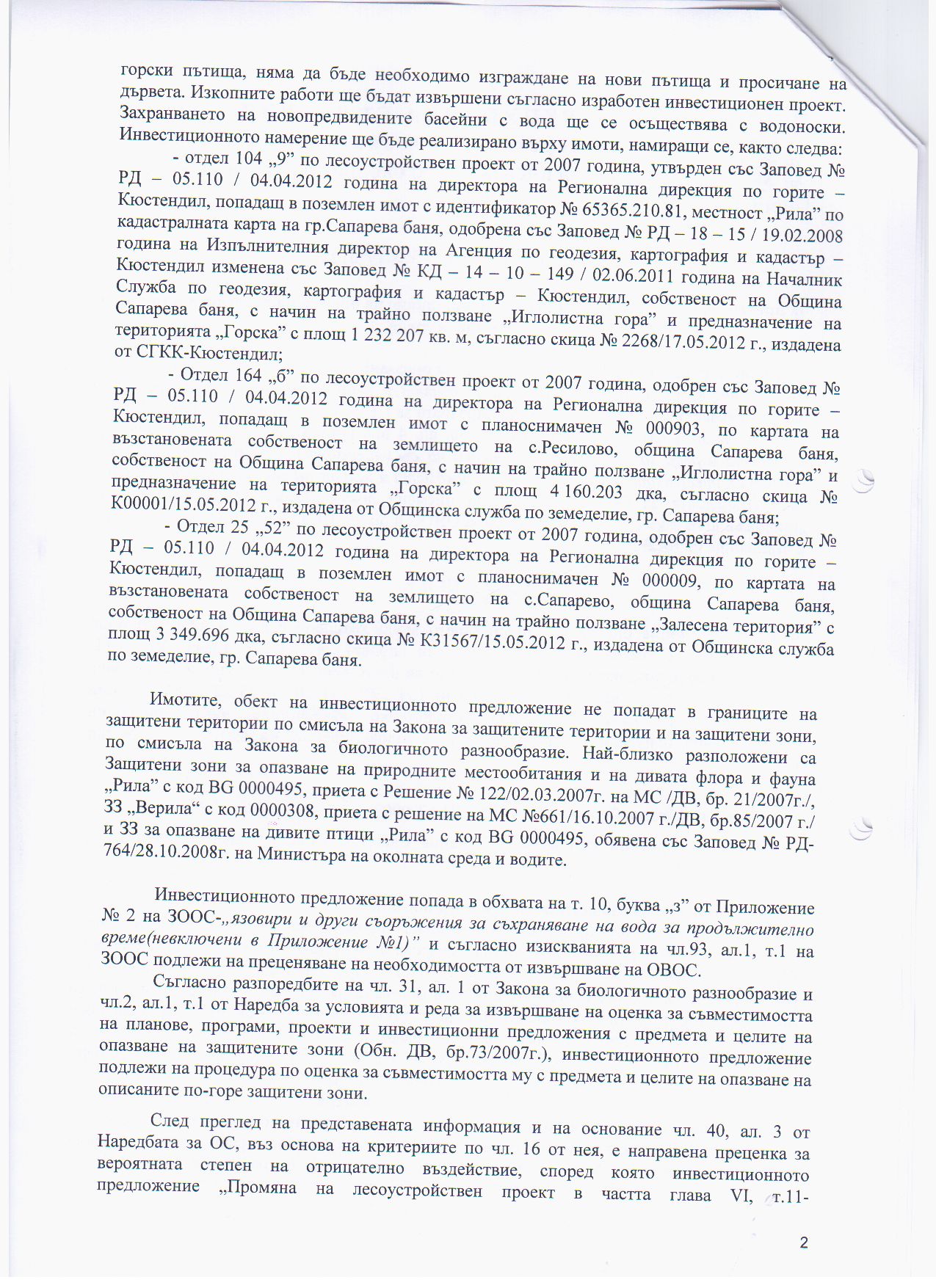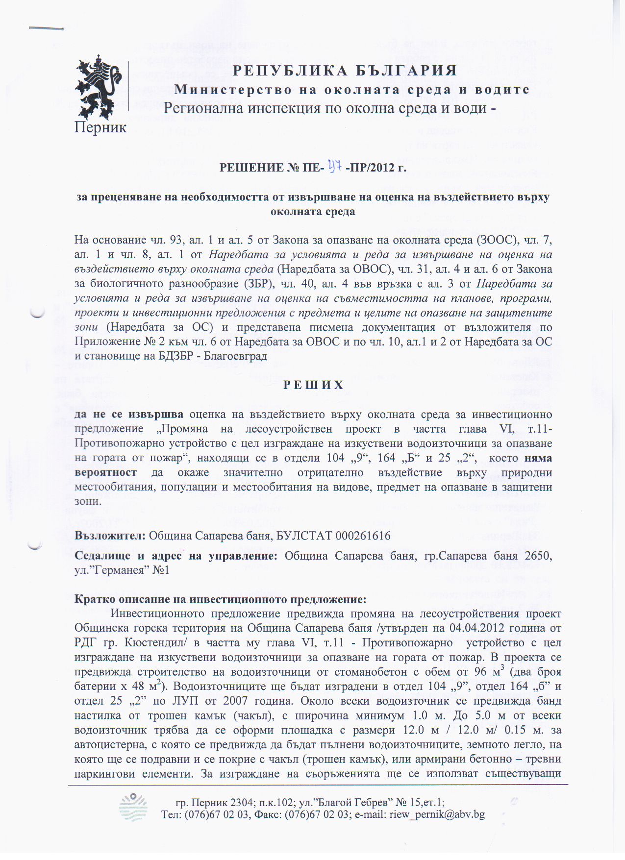 На основание чл. 8, ал. 5 от Наредбата за условията и реда за извършване на оценка на въздействието върху околната среда (ДВ бр.25/2003г. изм. и доп. ДВ, бр. 3/11.01.2011г.), Община Сапарева баня съобщава за постановено на 16.10.2012 г. Решение № ПЕ-47-ПР/2012 г. на Директора на РИОСВ - Перник за преценяване на необходимостта от извършване на оценка на въздействието върху околната среда за инвестиционно предложение „Промяна на лесоустройствения проект в частта глава VІ, т.11 Противопожарно устройство с цел изграждане на изкуствени водоизточници за опазване на гората от пожар" находящи се в отдели 104 „9", 164 "б" и 25 „2" в землището на община Сапарева баня, област Кюстендил, с възложител: Община Сапарева баня - да не се извършва ОВОС.
