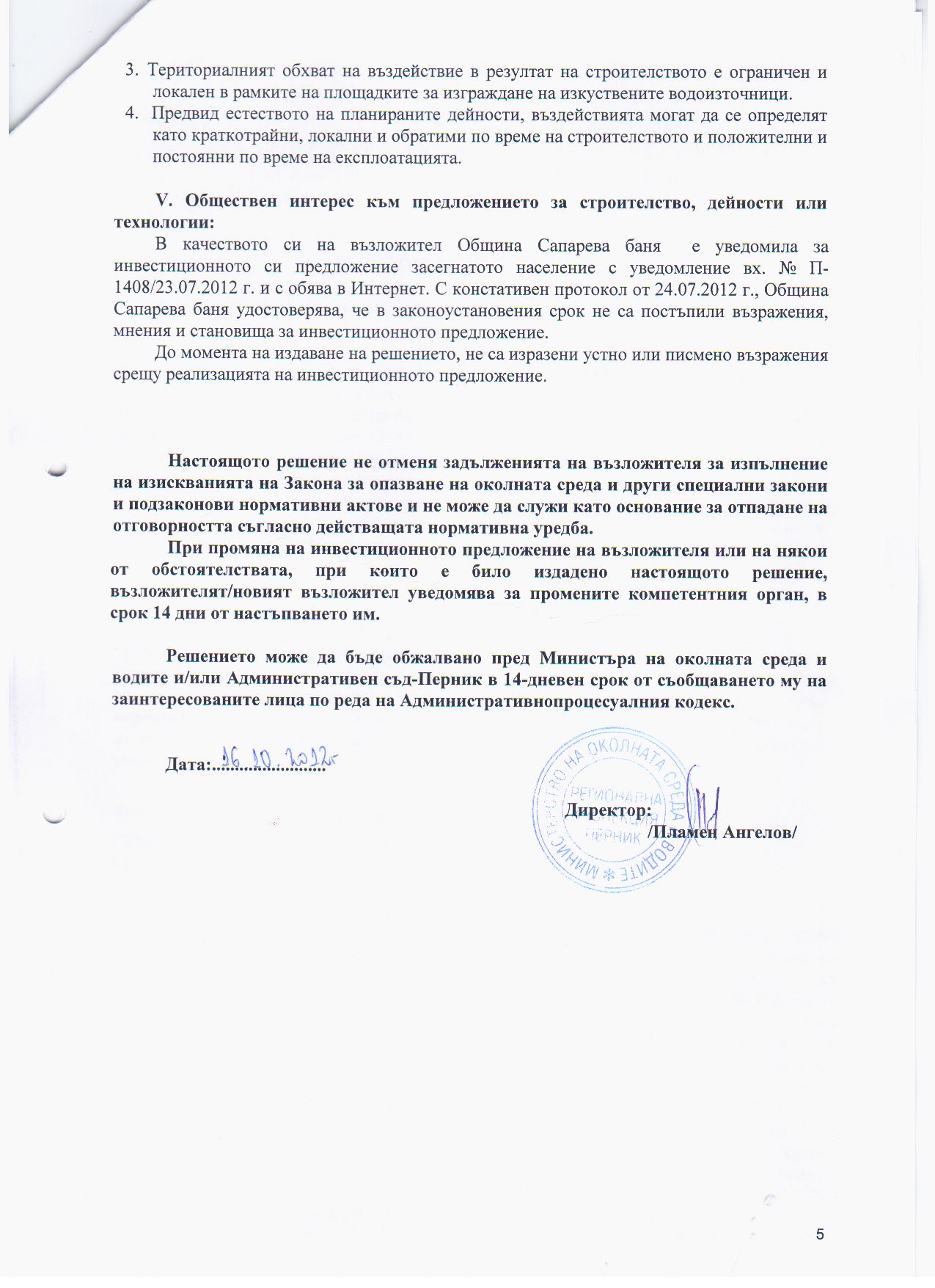Решение № ПЕ-47-ПР/2012 г. на Директора на РИОСВ - Перник