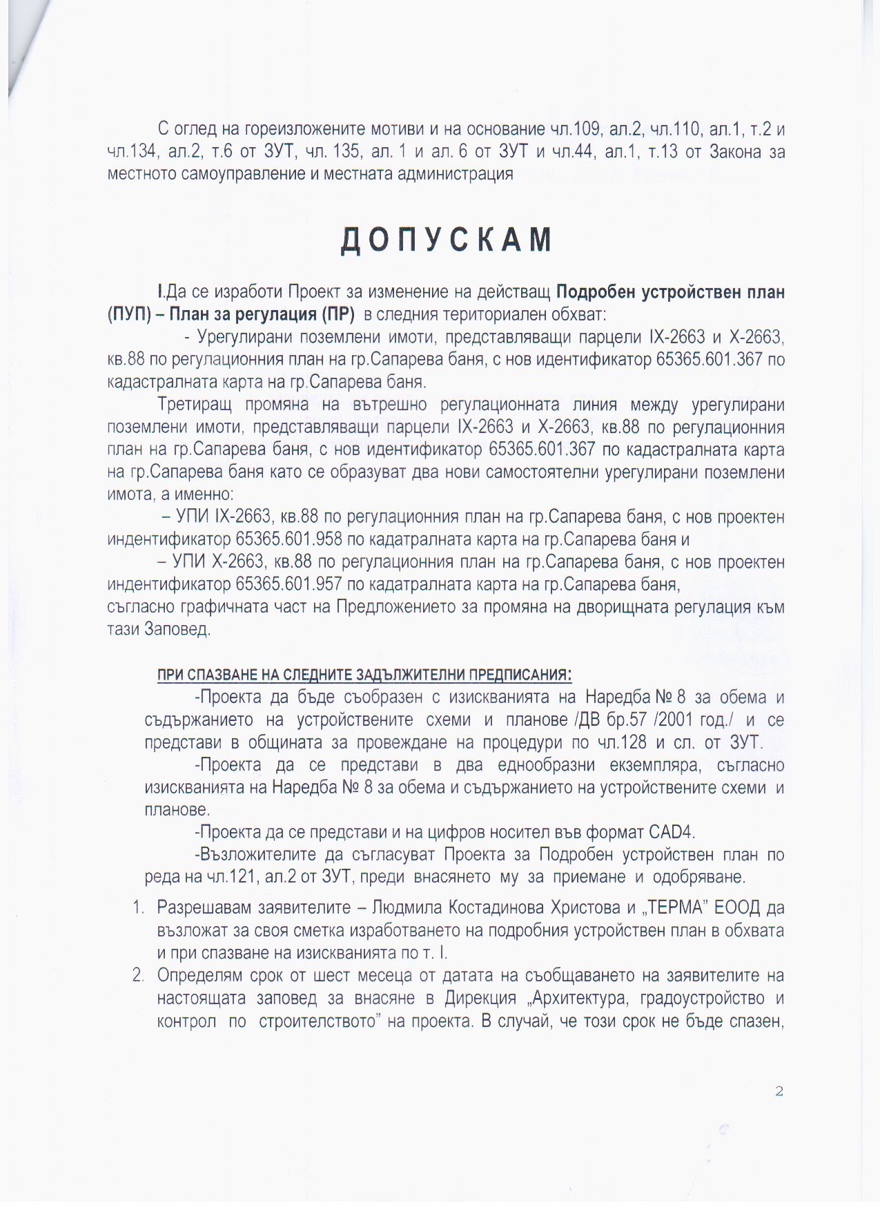 - УПИ Х-2663, кв.88 по регулационния план на гр.Сапарева баня, с нов проектен индентификатор 65365.601.957 по кадатралната карта на гр.Сапарева баня, съгласно графичната част на Предложението за промяна на дворищната регулация към тази Заповед, с Възложители Людмила Костадинова Христова и „ТЕРМА" ЕООД.