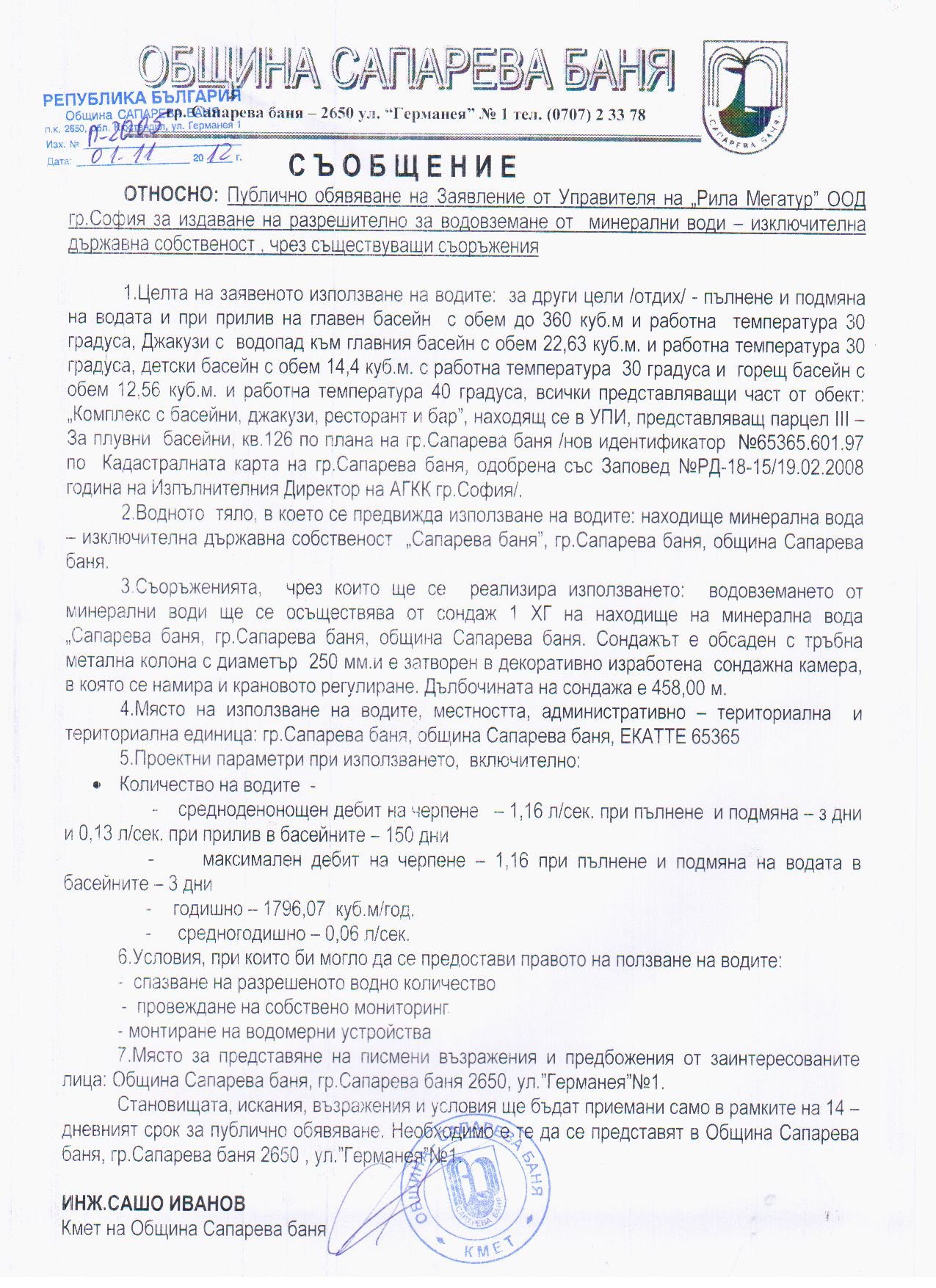 Съобщение относно публично обявление на Заявление от Управителя на Рила Мегатур ООД гр. София за издаване на разрешително за водовземане от минерални води - изключителна държавна собственост, чрез съществуващи съоръжения.