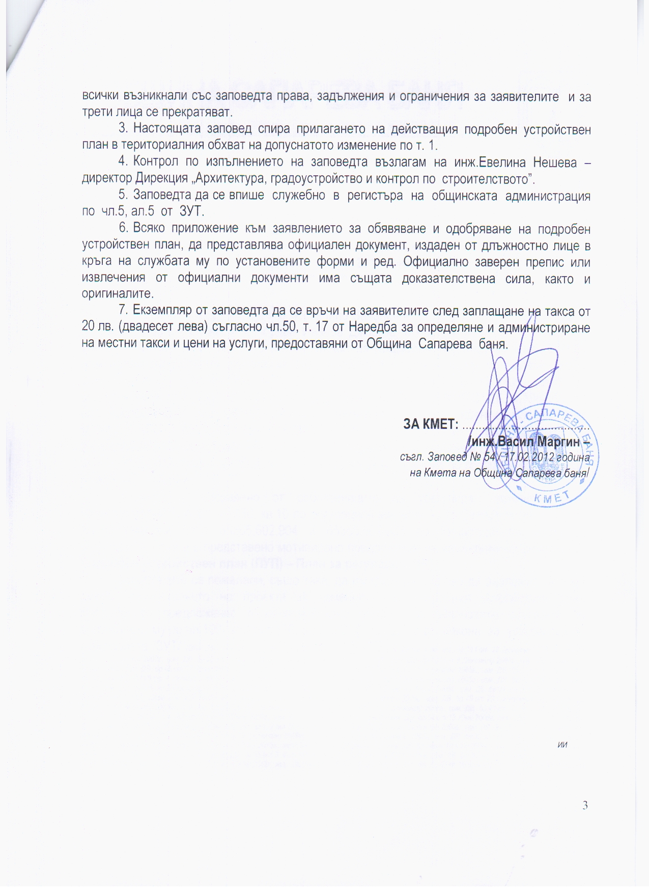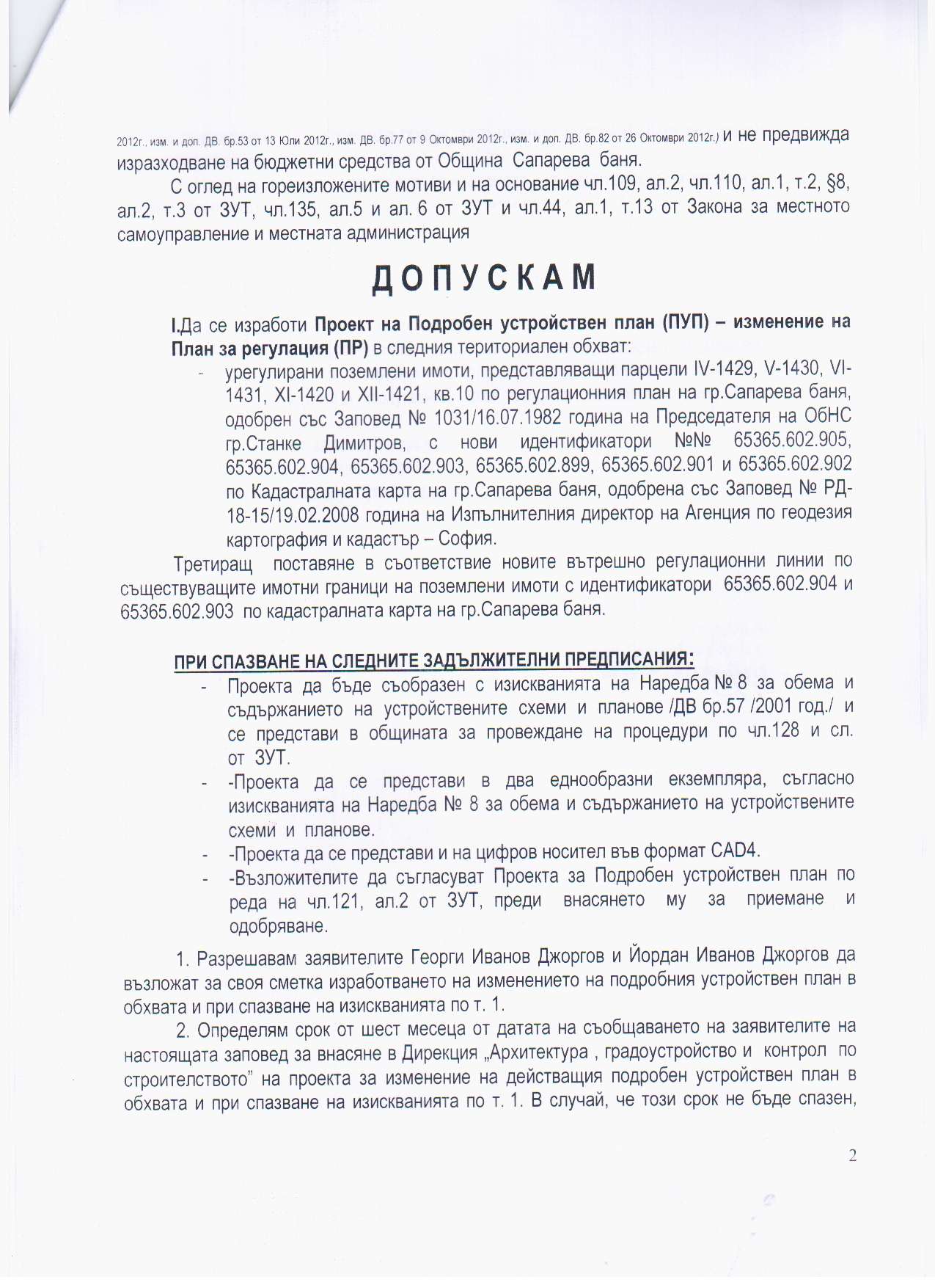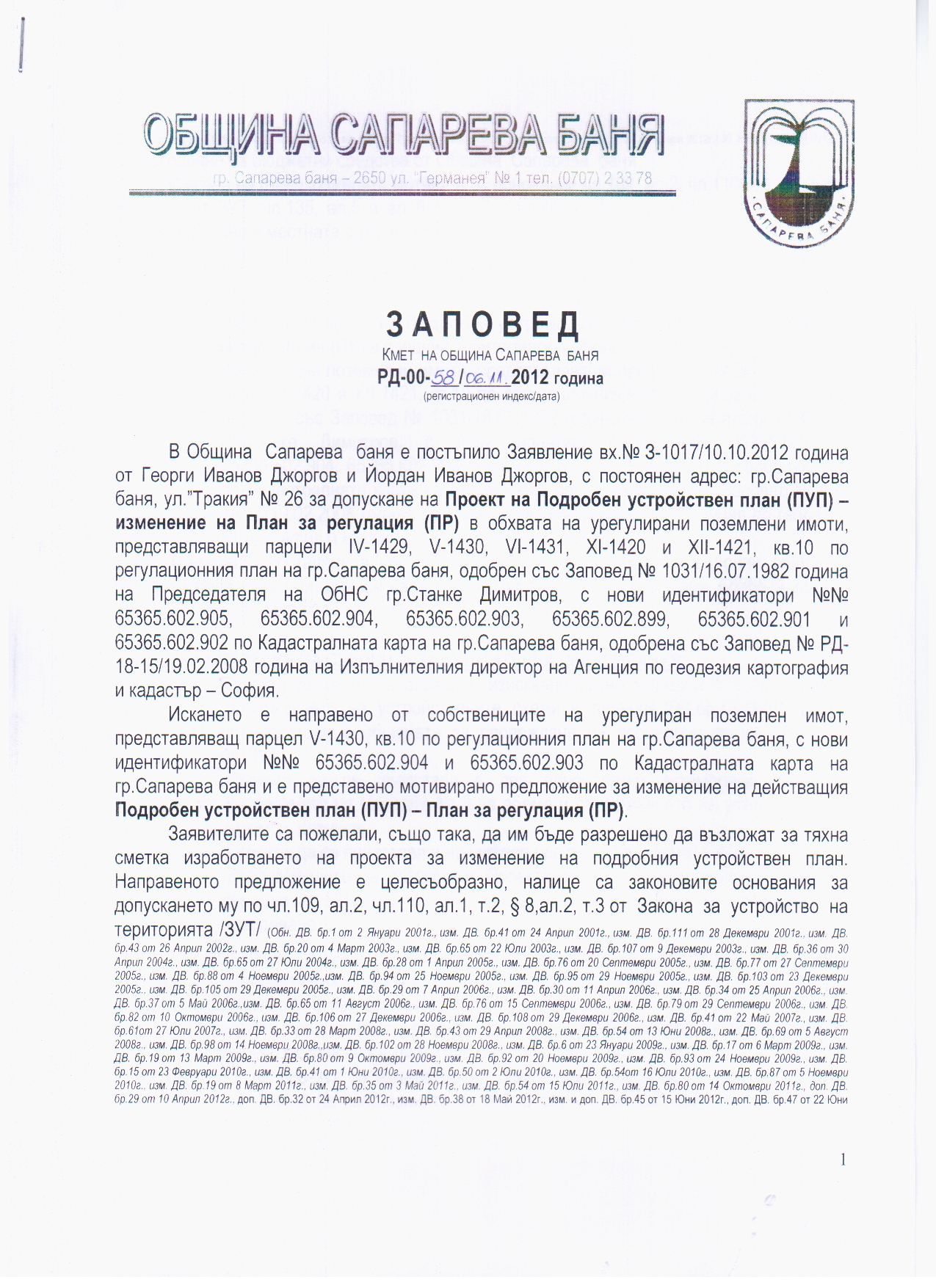 Община Сапарева баня на основание чл.128, ал.1 от Закона за устройство на територията /ЗУТ/ обявява на всички заинтересовани лица, че е издадена Заповед № РД-00-58/06.11.2012 година на Кмета на Община Сапарева баня за допускане изготвяне на Проект на Подробeн устройствен план (ПУП) - изменение на План за регулация (ПР) в обхват урегулирани поземлени имоти, представляващи парцели ІV-1429, V-1430, VІ-1431, ХІ-1420 и ХІІ-1421, кв.10 по регулационния план на гр.Сапарева баня, одобрен със Заповед № 1031/16.07.1982 година на Председателя на ОбНС гр.Станке Димитров, с нови идентификатори №№ 65365.602.905, 65365.602.904, 65365.602.903, 65365.602.899, 65365.602.901 и 65365.602.902 по Кадастралната карта на гр.Сапарева баня, одобрена със Заповед № РД-18-15/19.02.2008 година на Изпълнителния директор на Агенция по геодезия картография и кадастър - София, третиращ поставяне в съответствие новите вътрешно регулационни линии по съществуващите имотни граници на поземлени имоти с идентификатори 65365.602.904 и 65365.602.903 по кадастралната карта на гр.Сапарева баня, с Възложители Георги Иванов Джоргов и Йордан Иванов Джоргов.