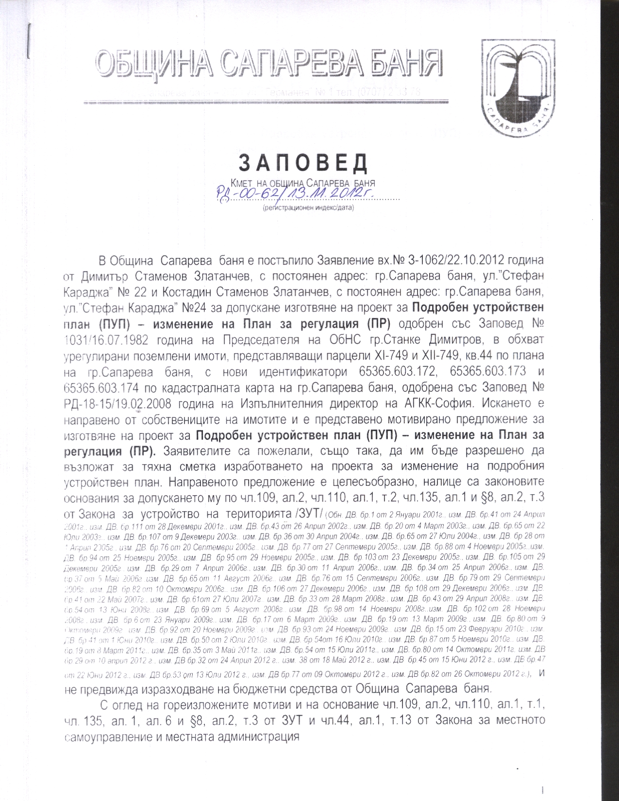 заинтересовани лица, че е издадена Заповед №РД-00-62/13.11.2012 година на Кмета на Община