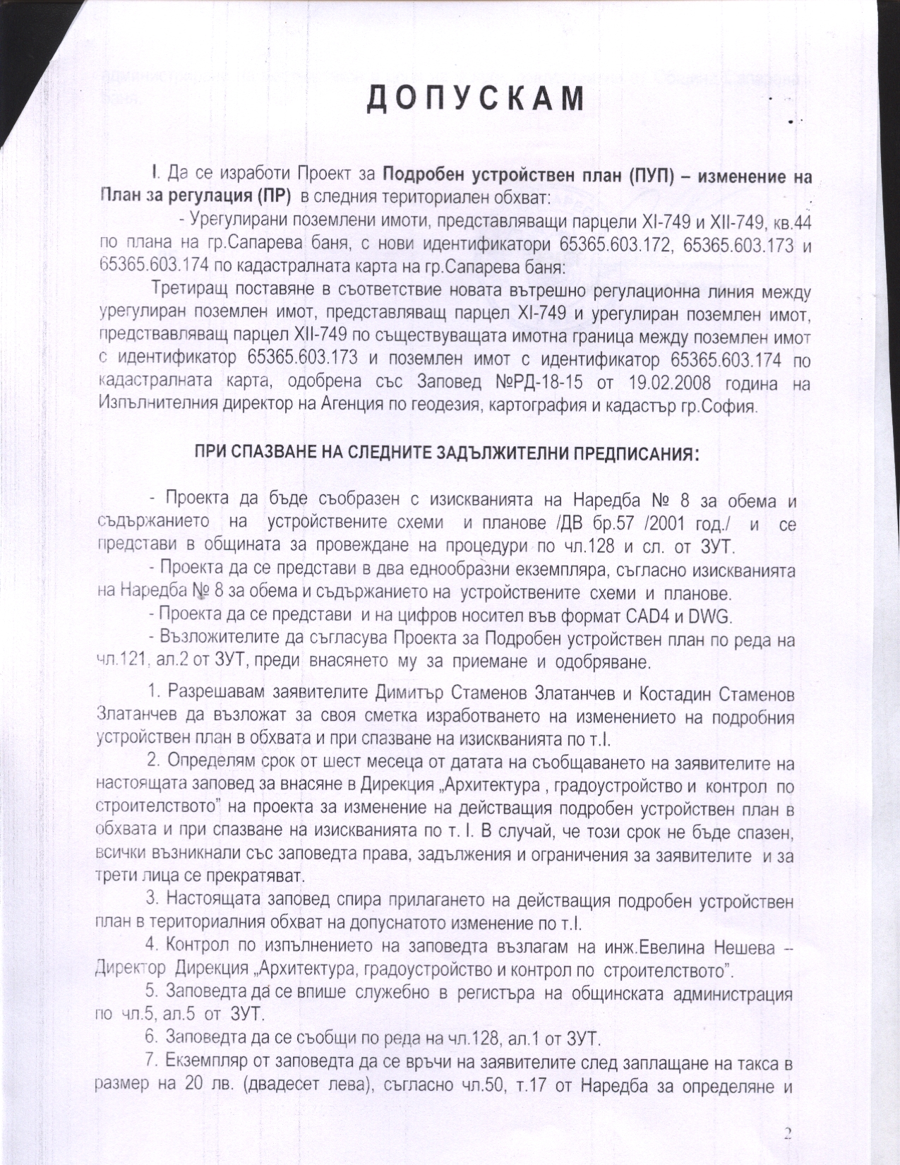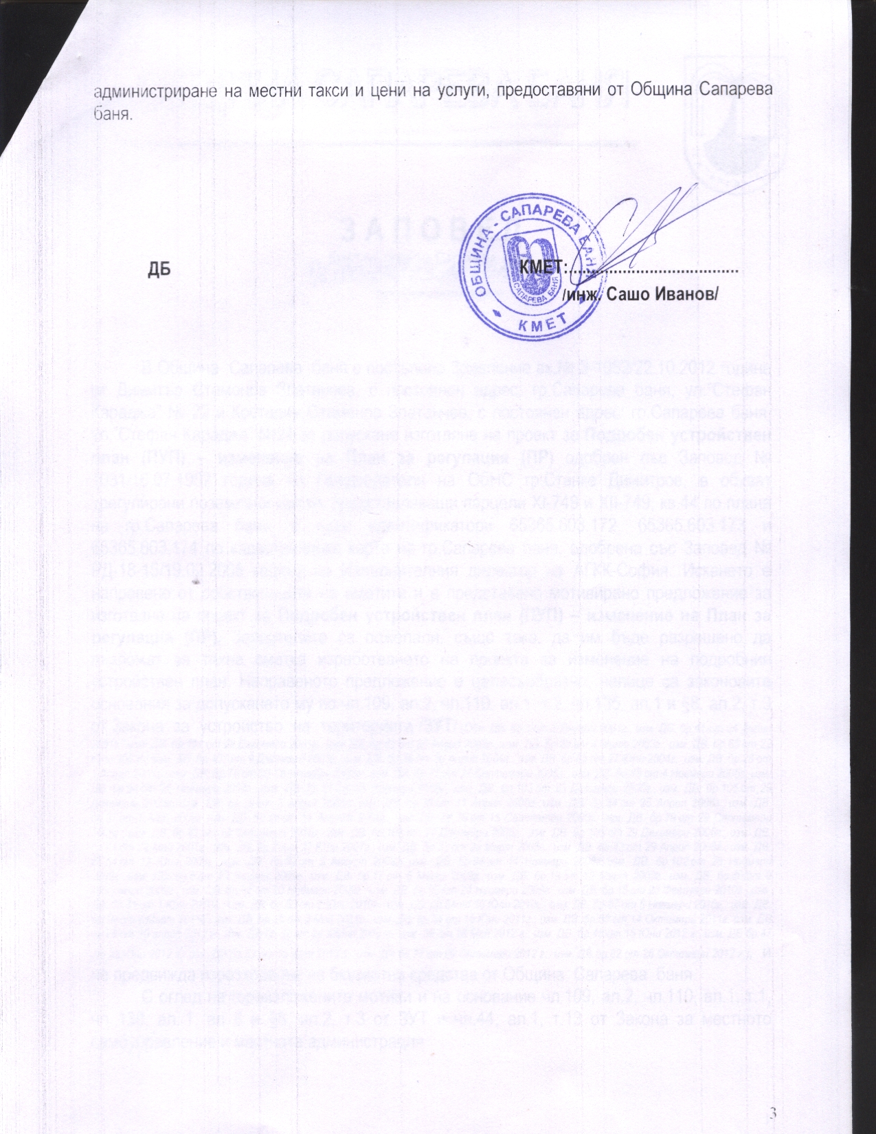Сапарева баня за допускане изготвянето на Проект за Подробен устройствен план - План за