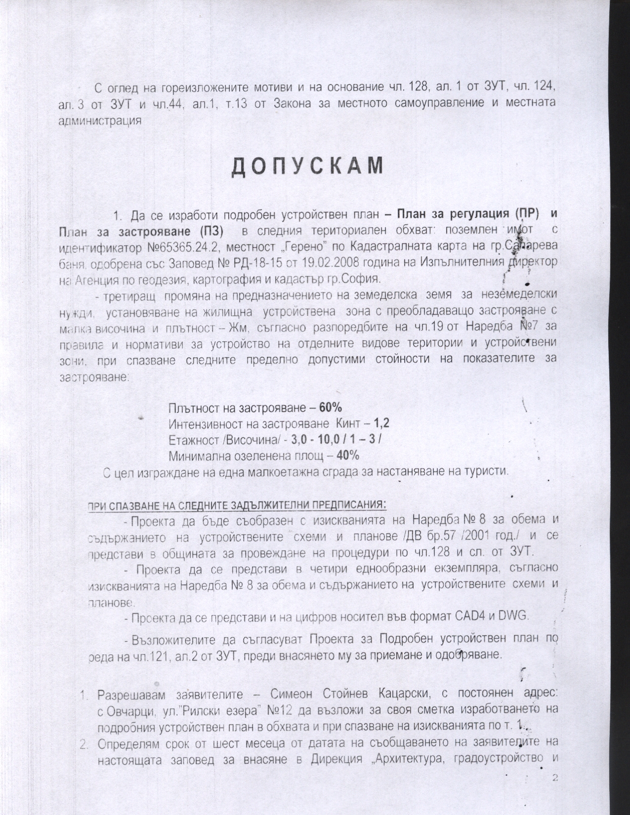 Община Сапарева баня на основание чл.128, ал. 1 от ЗУТ обявява на всички заинтересовани лица, че е издадена Заповед №РД-00-71/23.11.2012 година на Кмета на Община Сапарева баня за допускане изготвянето на Проект за Подробен устройствен план - План за регулация (ПР) и План за застрояване (ПЗ) в обхват поземлен имот с идентификатор 65365.24.2, месност «Герено» по Кадастралната карта на гр.Сапарева баня, третиращ промяна на предназначението на земеделска земя за неземеделски нужди, установяване на жилищна устройствена зона с преобладаващо застрояване с малка височина и плътност - Жм, с цел изграждане на една малкоетажна сграда за настаняване на туристи", Възложител Симеон Стойнев Кацарски.