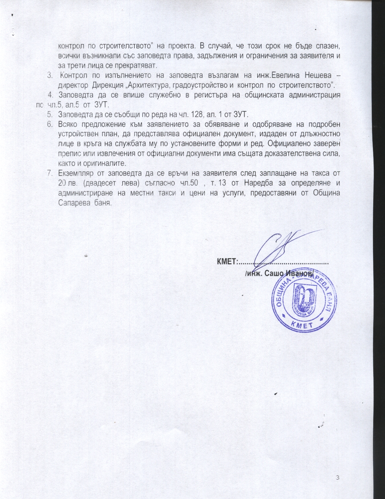 Заповедта е поставена за обществен достъп на информационното табло и интернет страницата на Община Сапарева баня и подлежи на обжалване по реда на чл.215 от ЗУТ.