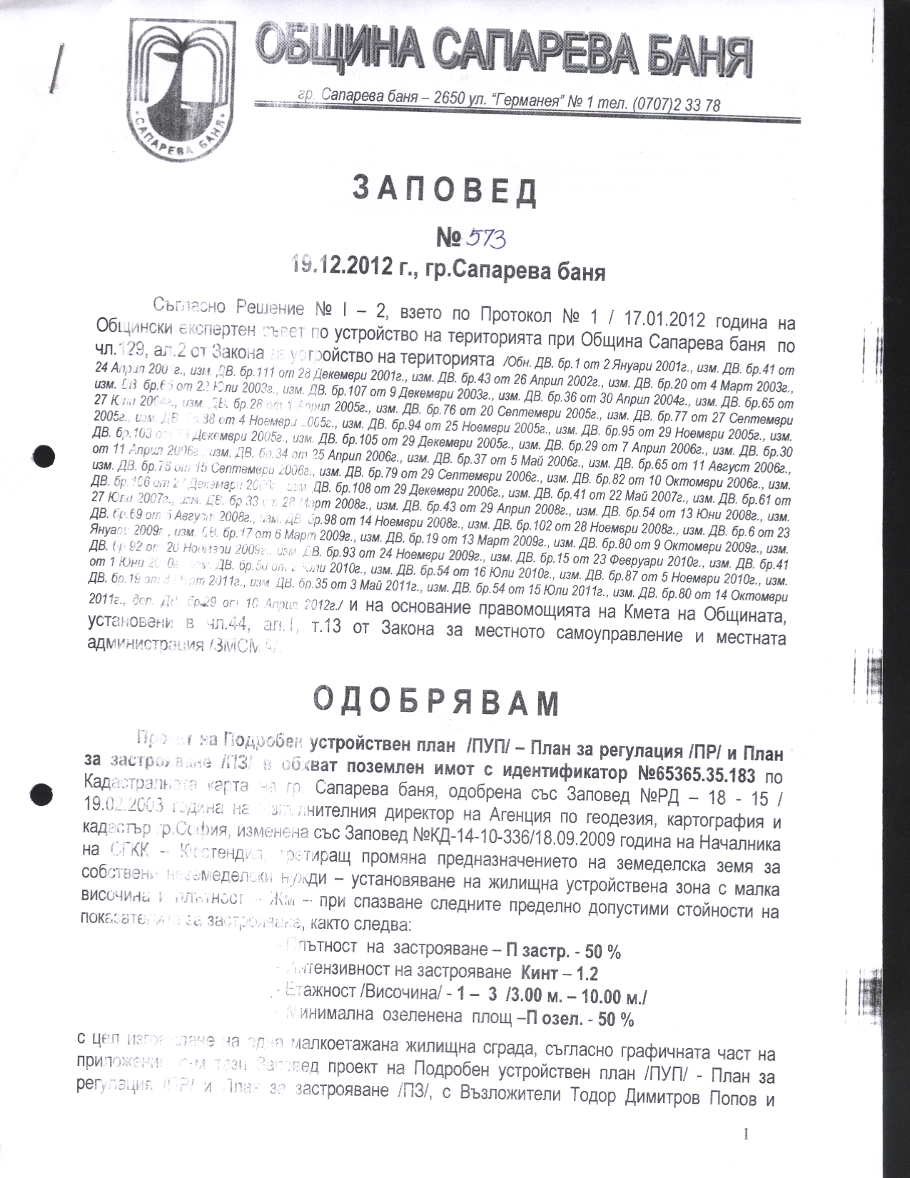 Дирекция "Архитектура, градоустройство и контрол по строителството" при Община Сапарева баня на основание чл.61, ал.3 от Административнопроцесуалния кодекс /АПК/ обявява на Валентин Андреев Ризов и Александър Аспарухов Николов, че със Заповед №573/19.12.2012 година на Кмета на Община Сапарева баня е ОДОБРЕН Проект за подробен устройствен план /ПУП/ - План за регулация /ПР/ и План за застрояване /ПЗ/ с обхват поземлен имот с идентификатор №65365.35.183 по Кадастралната карта на гр.Сапарева баня, одобрена със Заповед №РД-18-15/19.02.2008г.на Изпълнителния Директор на АГКК гр.София, третиращ промяна предназначението на земеделска земя за собствени неземеделски нужди - установяване на жилищна устройствена зона с малка височина и плътност - Жм, с цел изграждане на една малкоетажна жилищна сграда, с Възложители Тодор Димитров Попов и Малинка Симеонова Попова.
