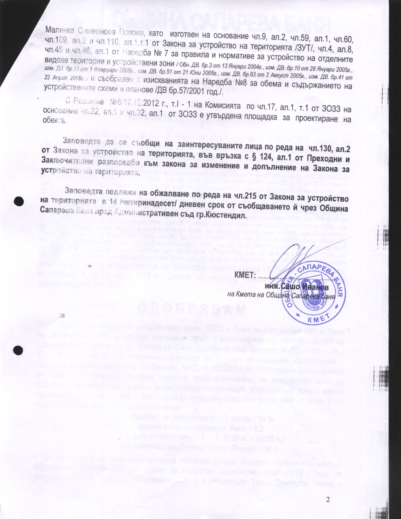 На основание чл.61, ал.3 от АПК в 14 -дневен срок от обявяването в Интернет страницата на Община Сапарева баня, съгласно разпоредбите на чл.215 от ЗУТ горепосочените лица, ако имат основание може да направят писмени възражения в два екземпляра чрез Община Сапарева баня до Административен съд - гр.Кюстендил.