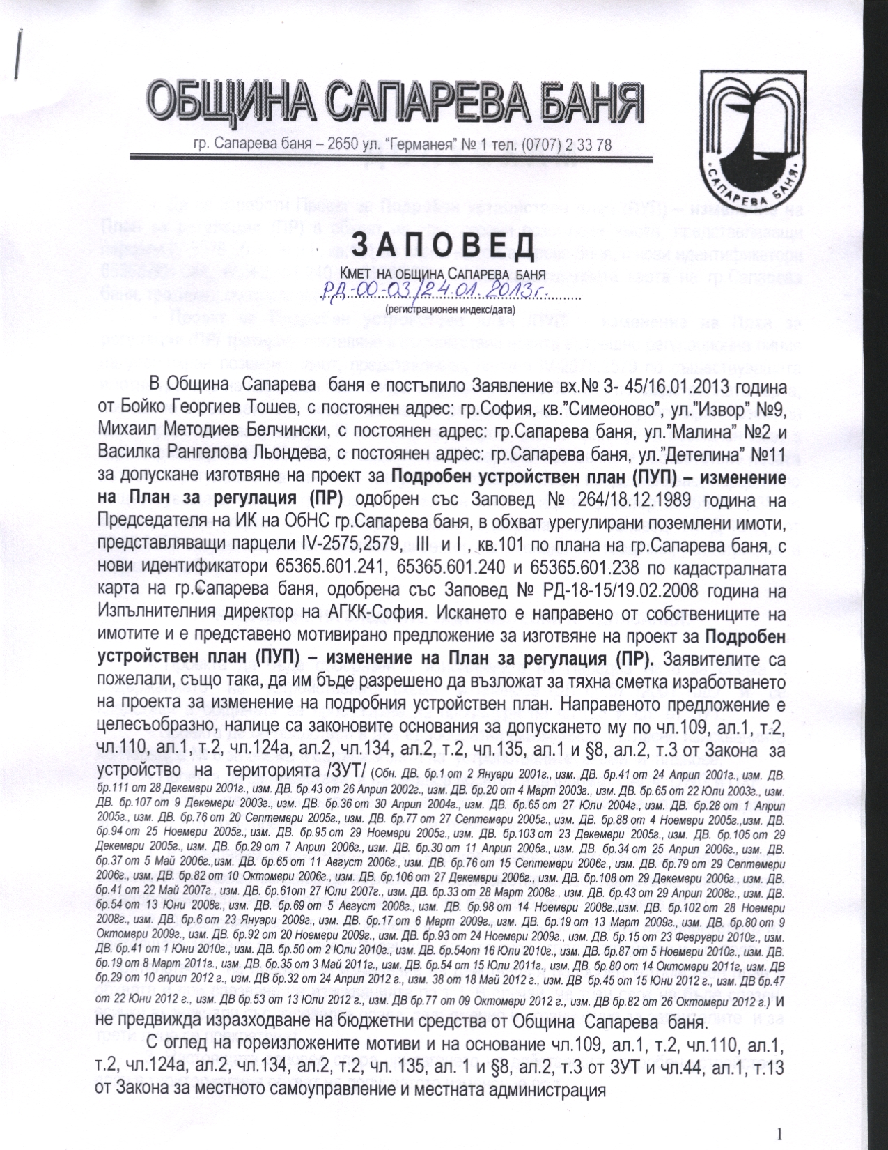 Община Сапарева баня на основание чл.128, ал. 2 от ЗУТ обявява на всички заинтересовани лица, че е издадена Заповед №РД-00-03 / 02.01.2013 година на Кмета на Община Сапарева баня за допускане изготвянето на Проект за Подробен устройствен план - изменение на План за регулация /ПР/ в обхват на урегулирани поземлени имоти, представляващи парцели ІV-2575,2579, ІІІ и І , кв.101 по плана на гр.Сапарева баня, с нови идентификатори 65365.601.241, 65365.601.240 и 65365.601.238 по кадастралната карта на гр.Сапарева баня, третиращ както следва: