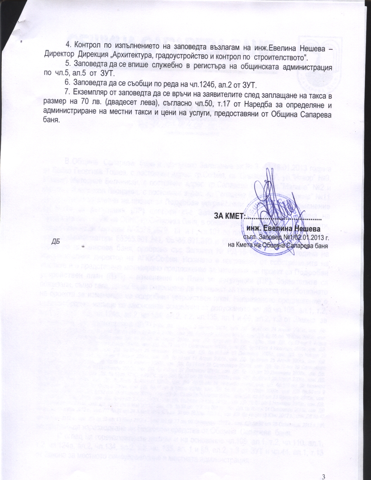 - Проект на Подробен устройствен план /ПУП/ - изменение на План за регулация /ПР/ третиращ поставяне в съответствие новата вътрешно регулационна линия на урегулиран поземлен имот, представляващ парцел ІV-2575,2579 по съществуващата имотна граница на поземлен имот с идентификатор 65365.601.241 по кадастралната карта, поставяне в съответствие новата вътрешно регулационна линия на урегулиран поземлен имот, представляващ парцел ІІІ по съществуващата имотна граница на поземлен имот с идентификатор 65365.601.240 по кадастралната карта и поставяне в съответствие новата вътрешно регулационна линия на урегулиран поземлен имот, представляващ парцел І по съществуващата имотна граница на поземлен имот с идентификатор 65365.601.238 по Кадастралната карта на гр.Сапарева баня, одобрена със Заповед №РД-18-15 от 19.02.2008 година на Изпълнителния директор на Агенция по геодезия, картография и кадастър гр.София с Възложители Бойко Георгиев Тошев, Михаил Методиев Белчински и Василка Рангелова Льондева.