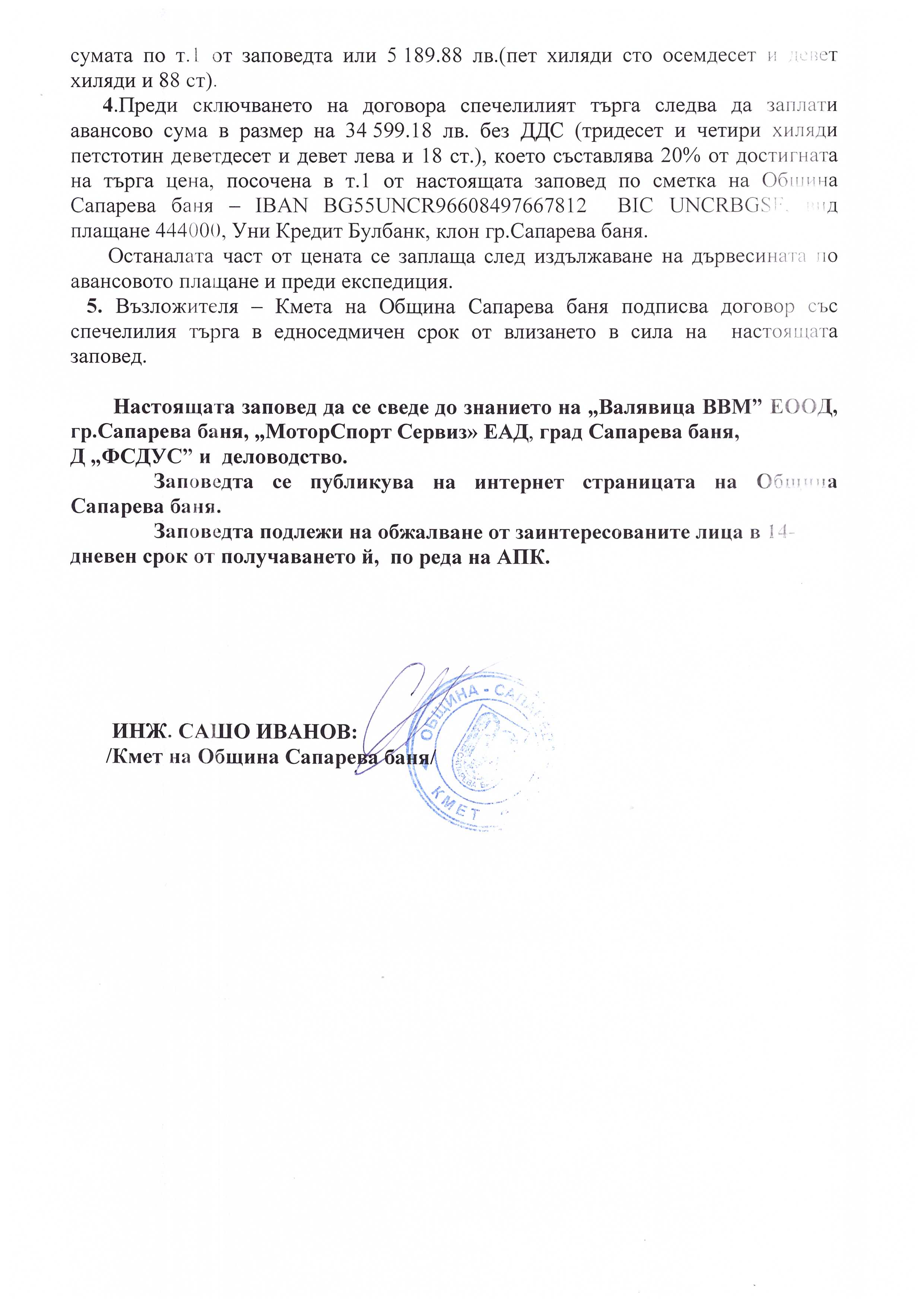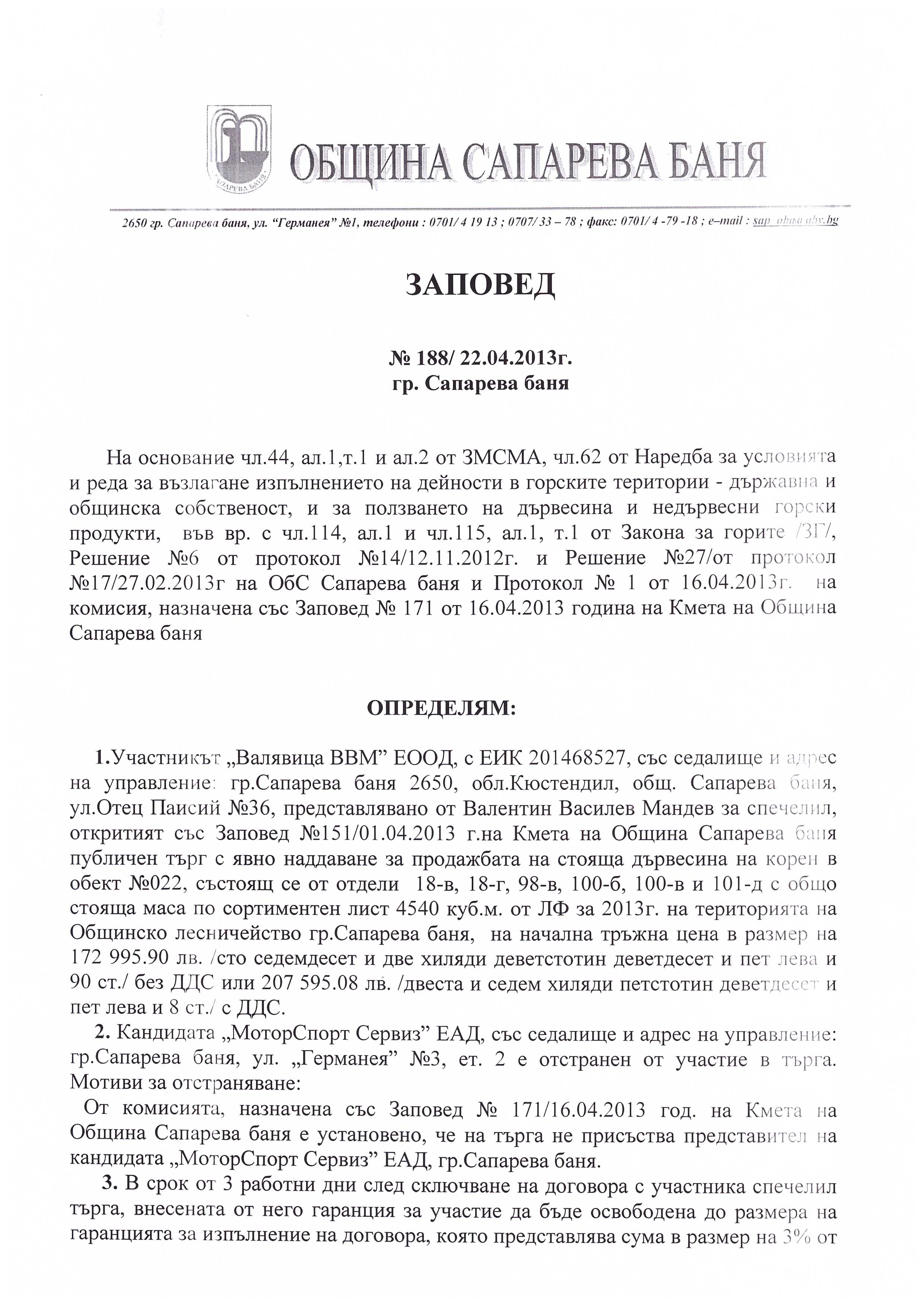 Заповед за спечелил, открития със Заповед №151/01.04.2013 г. на Кмета на Община Сапарева баня публичен търг с явно наддаване за продажбата на стояща дървесина на корен в обект №022, състоящ се от отдели 18-в, 18-г, 98-в, 100-б, 100-в и 101-д с общо стояща маса по сортиментен лист 4540 куб.м. от ЛФ за 2013г. на територията на Общинско лесничейство гр. Сапарева баня.