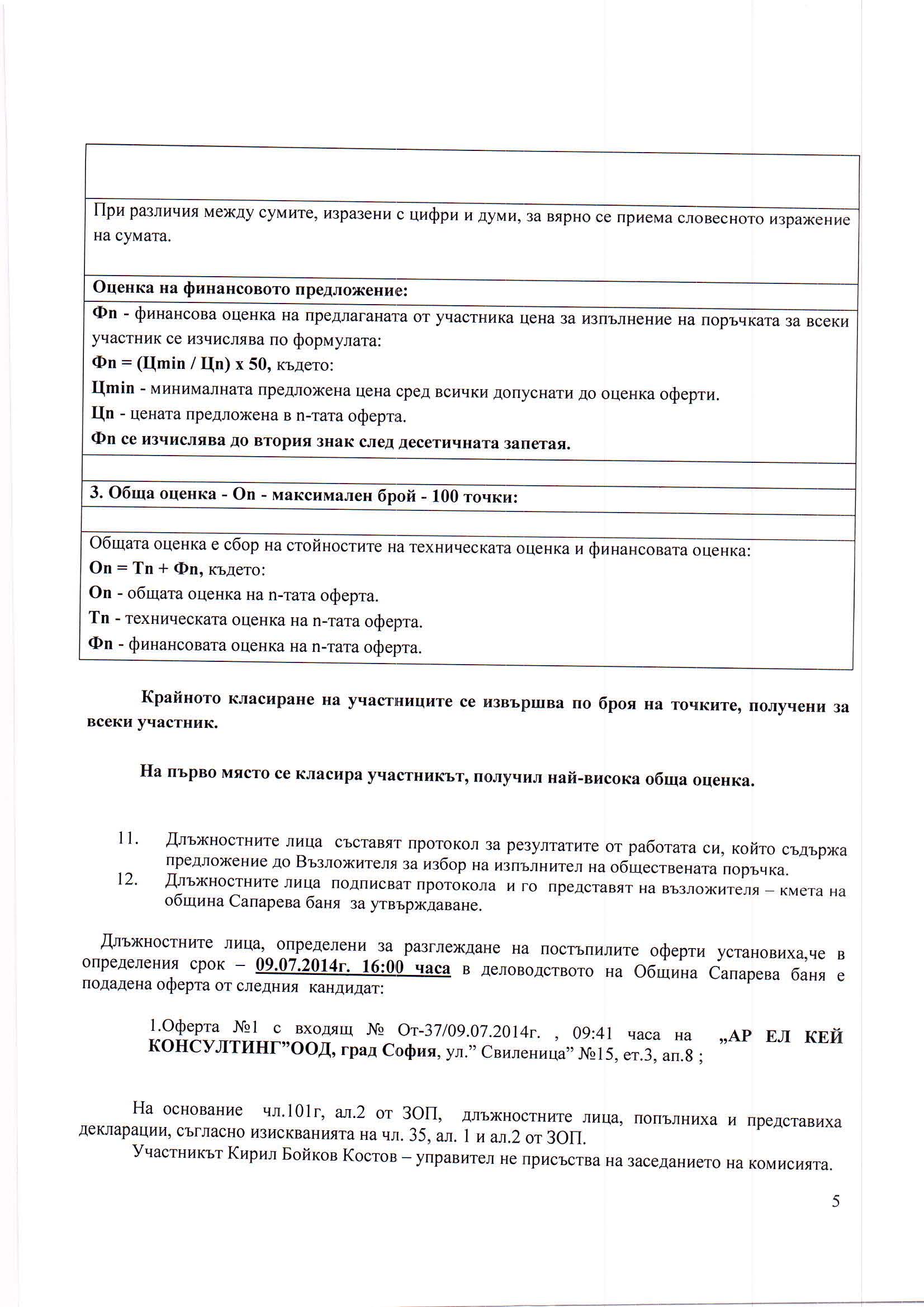 Одобреният на дата 13.08.2014г. от кмета на община Сапарева баня Протокол №1/10.07.2014г. на комисията, назначена със Заповед №371/10.07.2014г. на кмета на общината за разглеждане на постъпилите оферти за обществена поръчка проведена по реда на глава 8А от ЗОП с предмет: „Консултантска услуга за изпълнение и отчитане на дейностите по проект № 10/313/00272 „Изграждане и обзавеждане на сграда за експониране на археологическото и етнографското наследство в УПИ, парцел III - за училище, кв.125 по плана на гр. Сапарева баня" мярка 313 от Програмата за развитие на селските райони 2007-2013 г." е достъпен в прикачения файл.