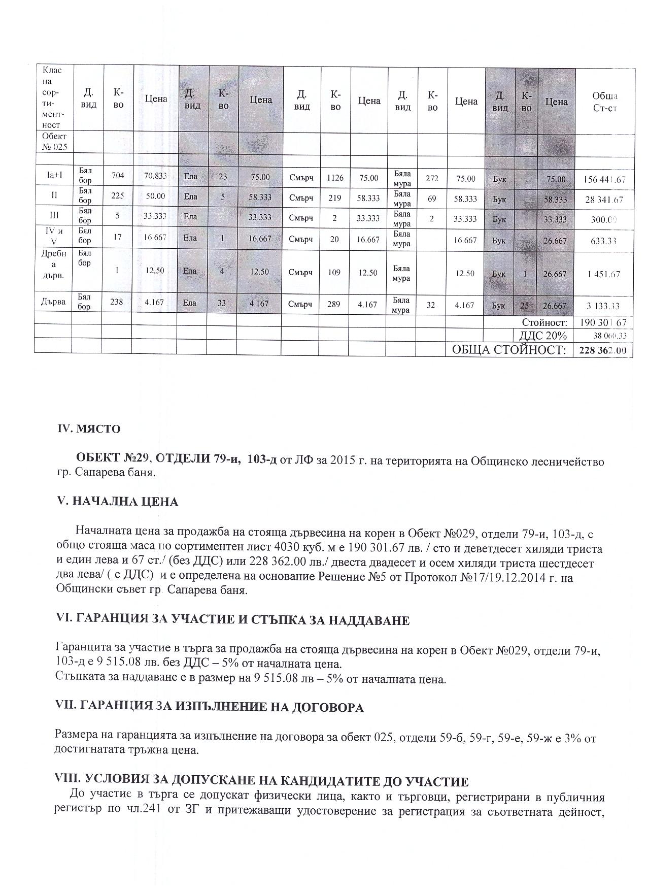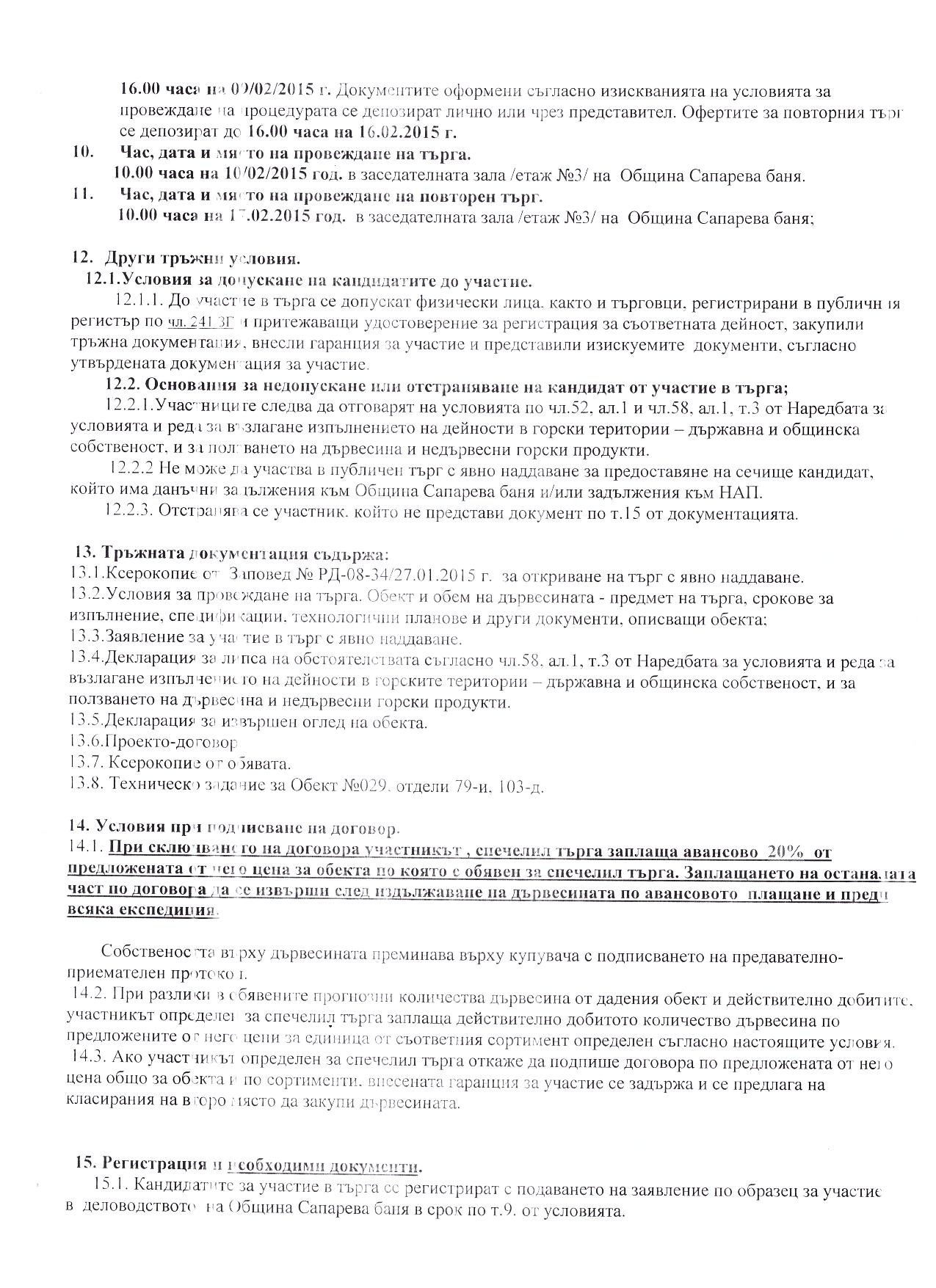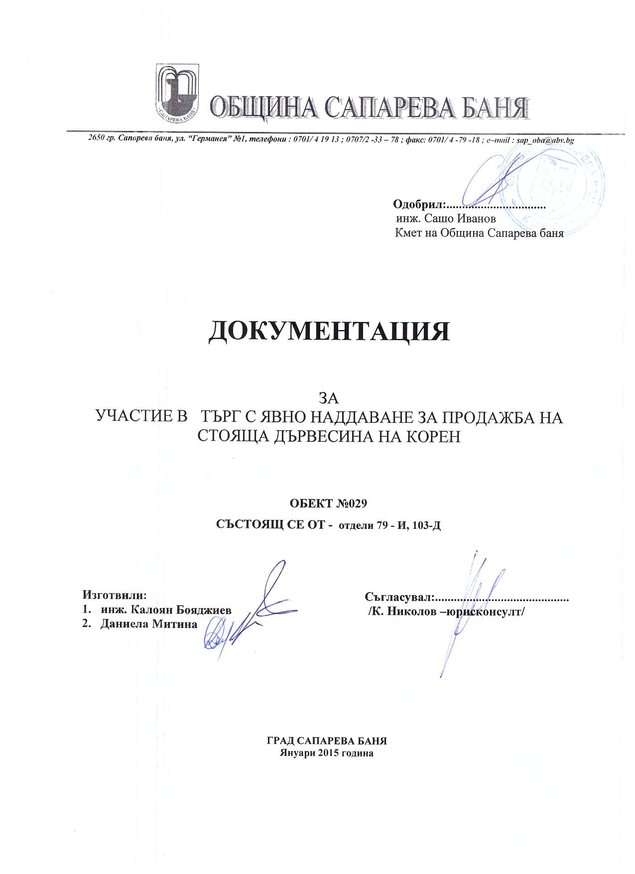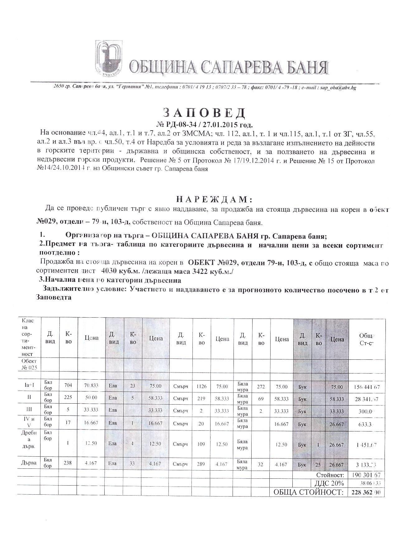 На основание чл.44, aл.1, т.1 и т.7, aл.2 от ЗМСМА; чл. 112, ал.1, т. 1и чл.115, ал.1, т.1 от ЗГ; чл.55, ал.2 и ал. 3 във вр. с чл.50, т.4 от Наредба за условията и реда за възлагане изпълнението на дейности в горските територии - държавна и общинска собственост, и за ползването на дървесина и недървесни горски продукти; Решение № 5 от Протокол №17/19.12.2014 г.; Решение №15 от Протокол №14/24.10.2014 г.на Общински съвет гр. Сапарева баня и Заповед №РД-08-34/27.01.2015 год. на Кмета на Община Сапарева баня се организира публичен търг с явно наддаване за продажба на стояща дървесина на корен в обект № 029 състоящ се от отдели 79-и, 103-д от ЛФ за 2015 г. на територията на Общинско лесничейство гр.Сапарева баня.