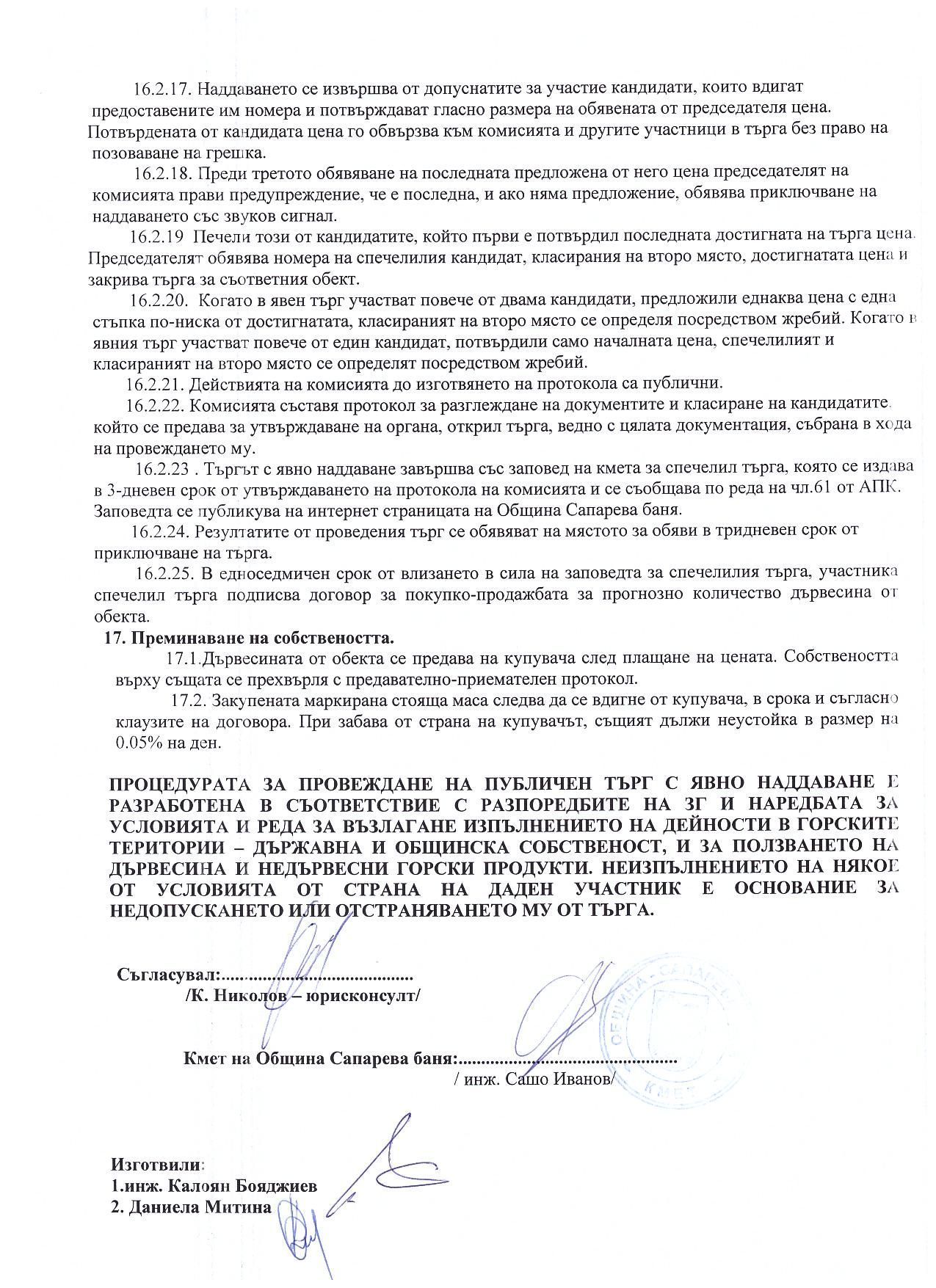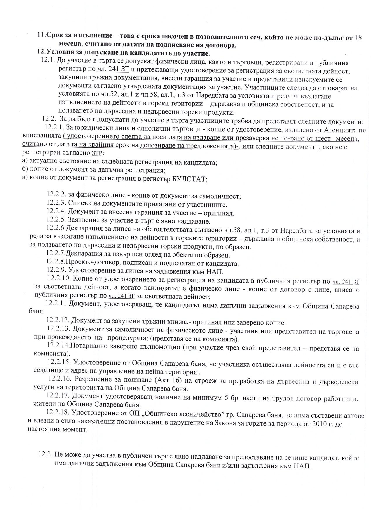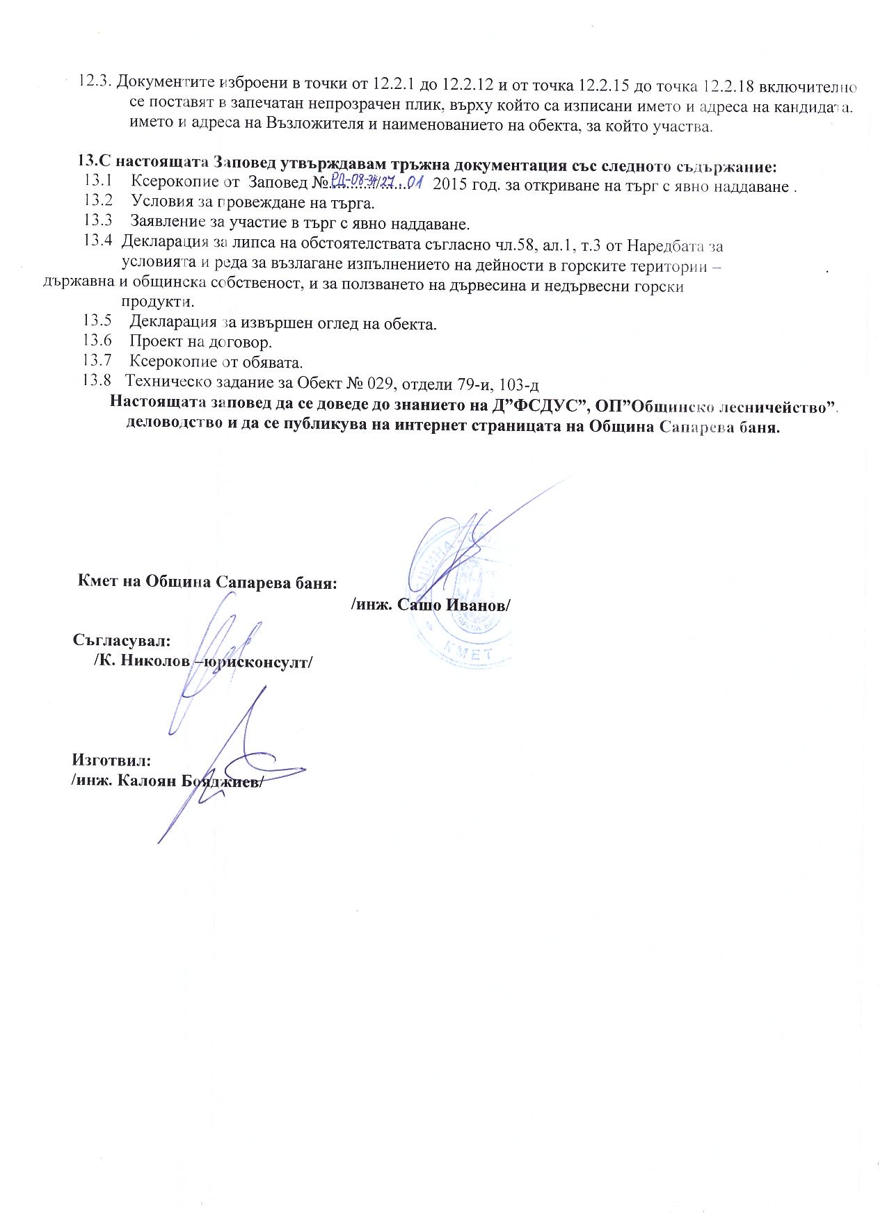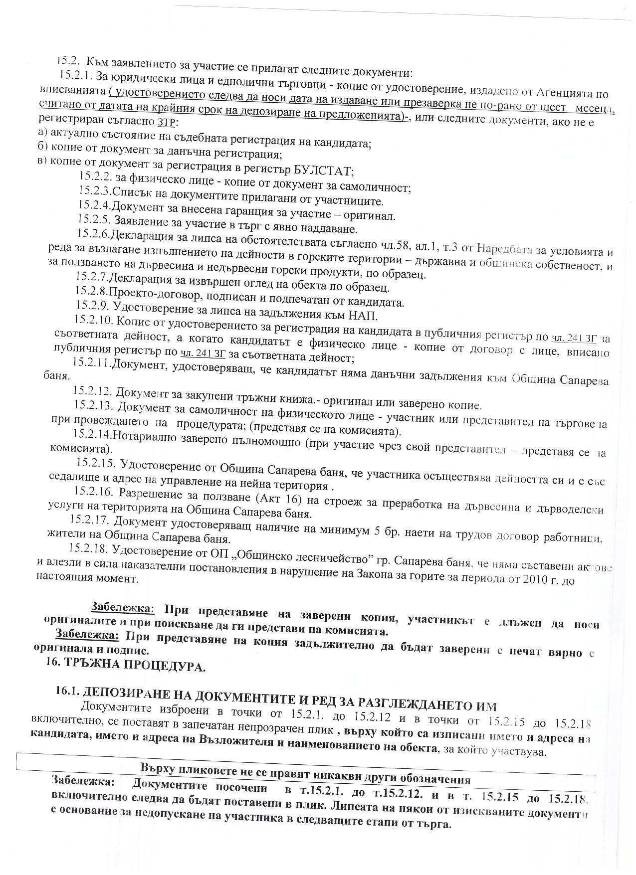 На основание чл.44, aл.1, т.1 и т.7, aл.2 от ЗМСМА; чл. 112, ал.1, т. 1и чл.115, ал.1, т.1 от ЗГ; чл.55, ал.2 и ал. 3 във вр. с чл.50, т.4 от Наредба за условията и реда за възлагане изпълнението на дейности в горските територии - държавна и общинска собственост, и за ползването на дървесина и недървесни горски продукти; Решение № 5 от Протокол №17/19.12.2014 г.; Решение №15 от Протокол №14/24.10.2014 г.на Общински съвет гр. Сапарева баня и Заповед №РД-08-34/27.01.2015 год. на Кмета на Община Сапарева баня се организира публичен търг с явно наддаване за продажба на стояща дървесина на корен в обект № 029 състоящ се от отдели 79-и, 103-д от ЛФ за 2015 г. на територията на Общинско лесничейство гр.Сапарева баня.