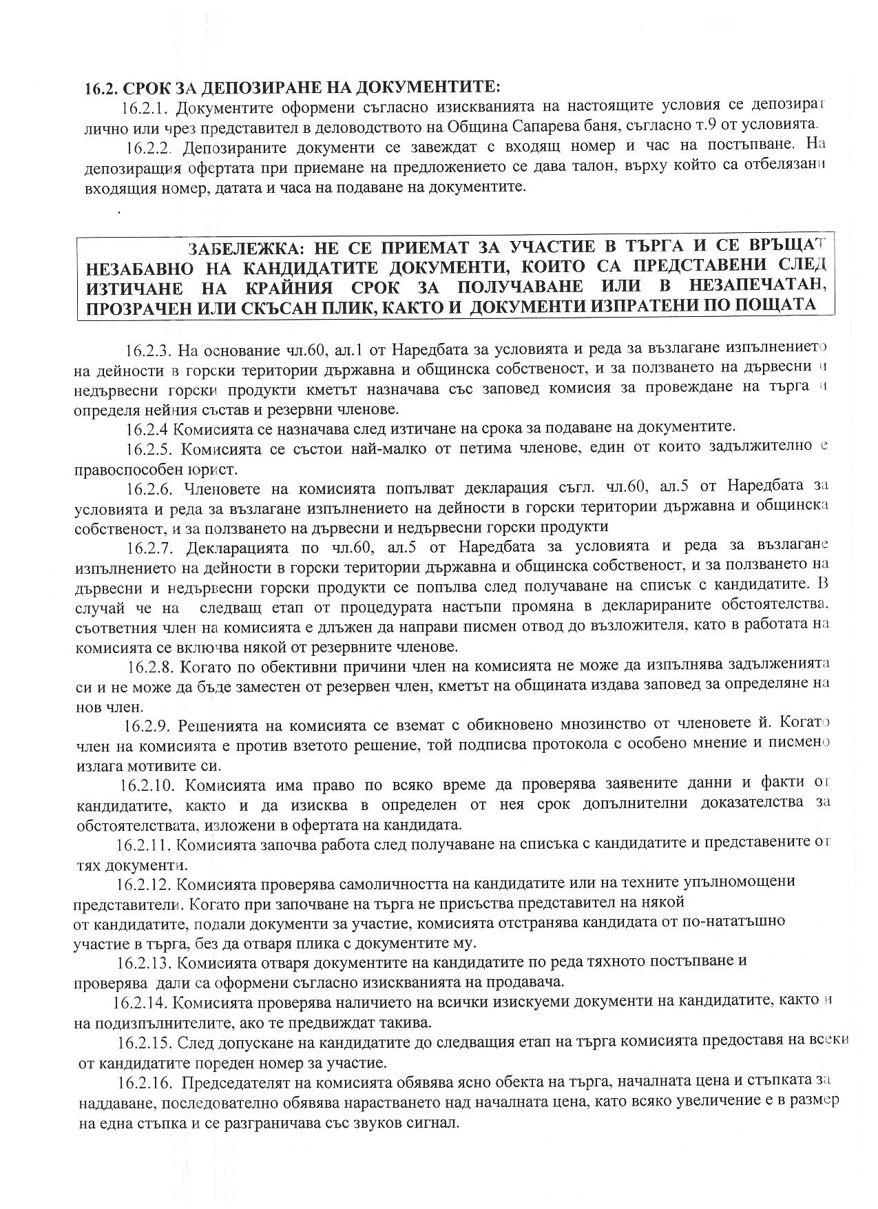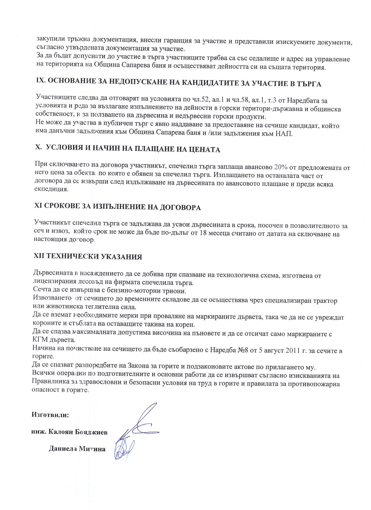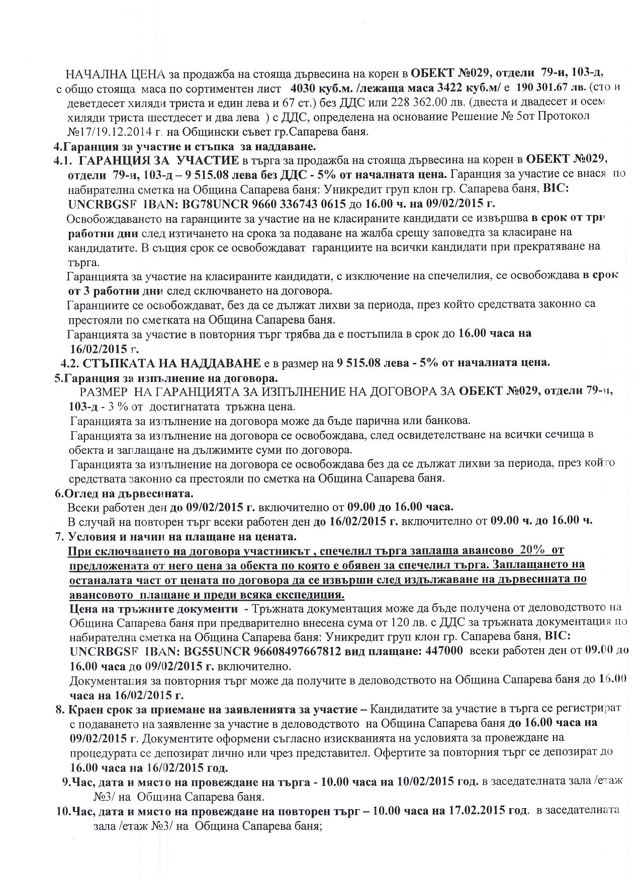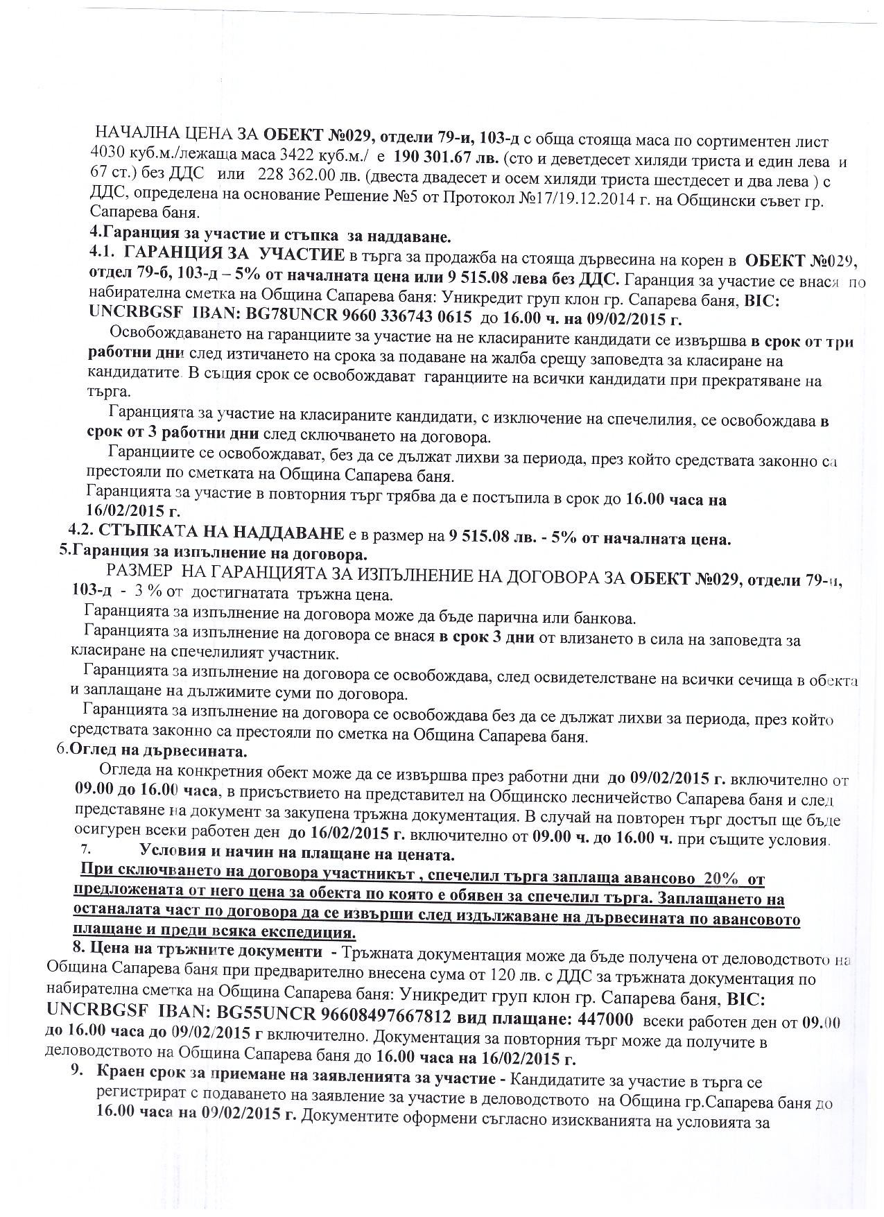 3.1.Гаранция за участие за обект № 029 - отдели 79-и, 103-д - 5% от началната цена или 9 515.08 лева без ДДС. Гаранция за участие се внася по набирателна сметка на Община Сапарева баня: Уникредит груп клон гр. Сапарева баня, BIC: UNCRBGSF IBAN: BG78UNCR 9660 3367430615 до 16.00 ч. на 09/02/2015 г.