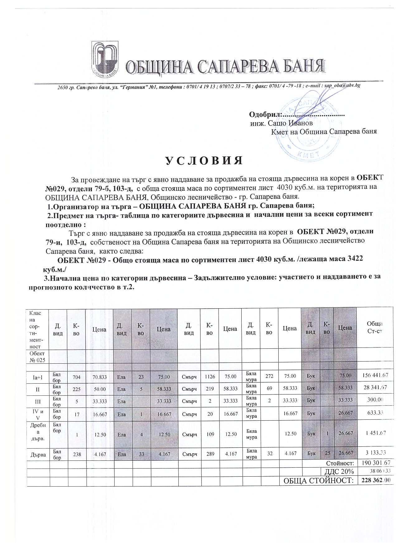 Продажба на стояща дървесина на корен в обект №029, отдели 79-и, 103-д, собственост на Община Сапарева баня. Обща стояща маса по сортиментен лист 4030 куб.м. /лежаща маса 3422 куб.м./, начална цена за обекта -190 301.67 лв. без ДДС;