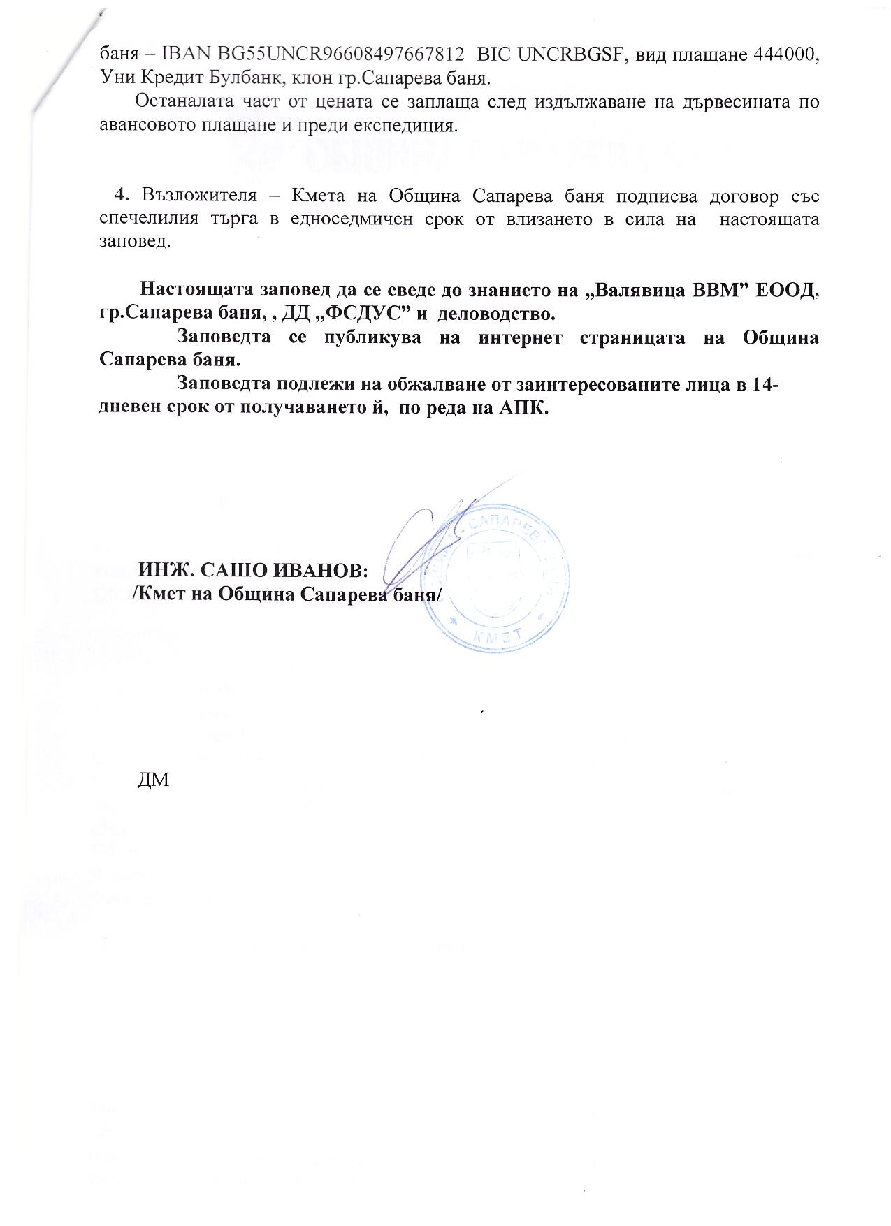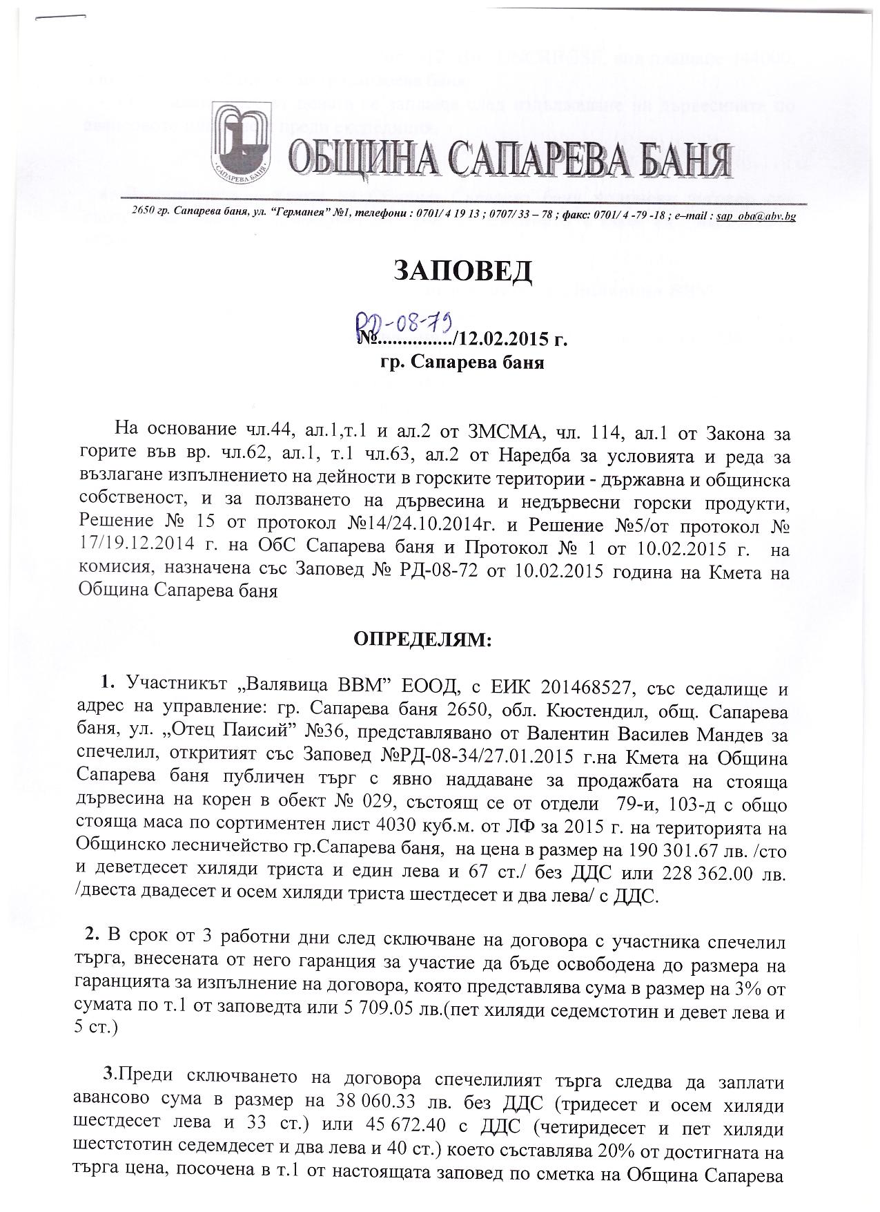 Заповед №РД-08-79/12.02.2015г. на кмета на община Сапарева баня за спечелил търг с явно наддаване за продажба на стояща дървесина на корен в обект № 029 състоящ се от отдели 79-и, 103-д от ЛФ за 2015 г.