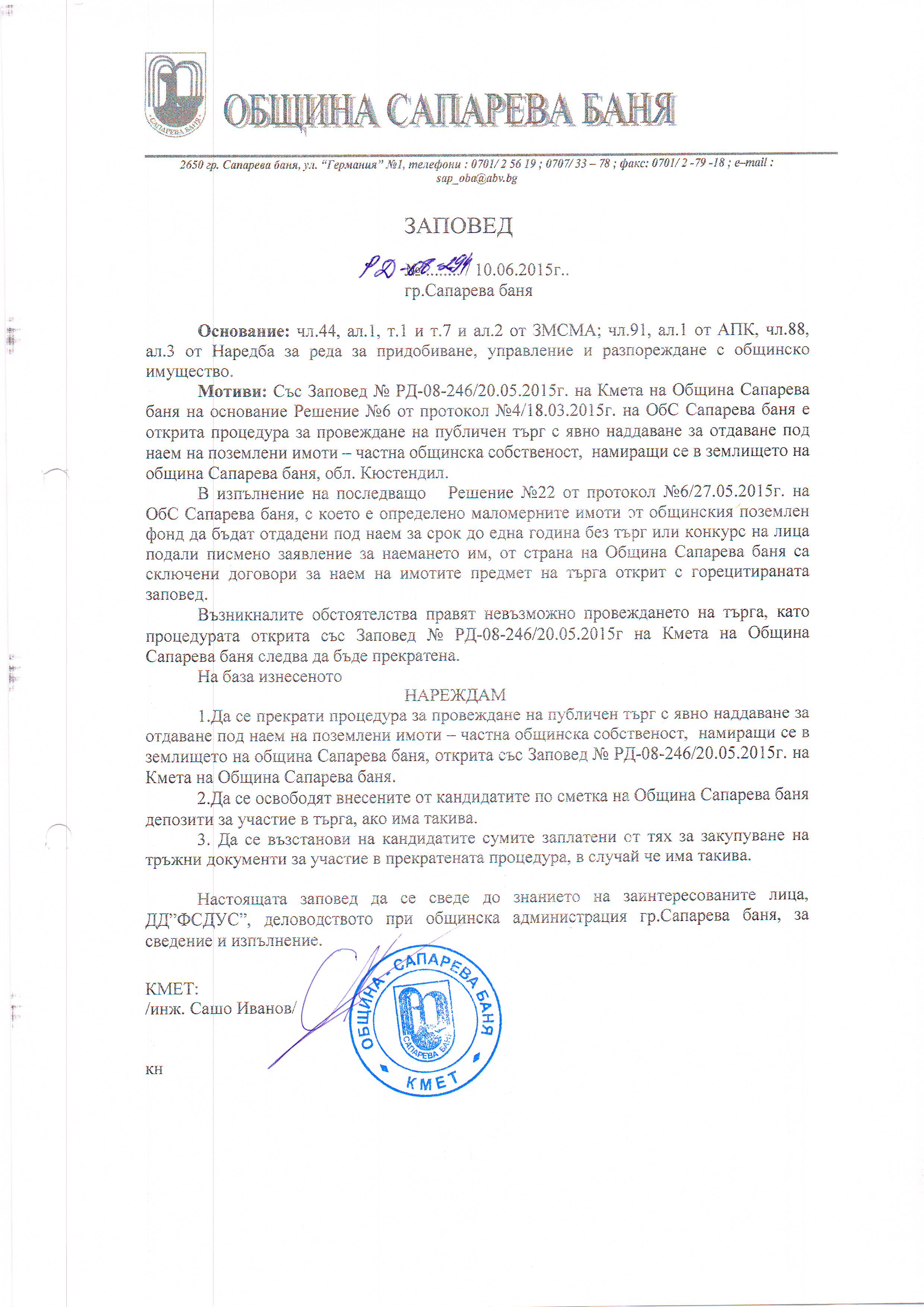 На основание чл.44, ал.2 от ЗМСМА, чл.14, ал.1 и ал. 2 от ЗОС, чл. 24а,ал.5 от ЗСПЗЗ; чл. 37,ал.3;чл.85,ал.1 от Наредба за реда на придобиване, стопанисване, управление и разпореждане с общинско имущество на Общински съвет Сапарева баня,Решение №6 от Протокол №4/18.03.2015г. на Общински съвет Сапарева баня и Заповед № РД-08-246/20.05.2015г. на кмета на община Сапарева баня