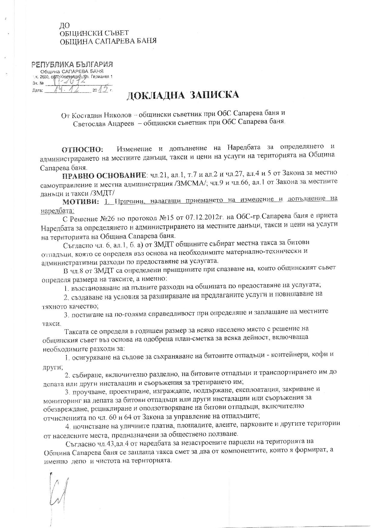 С Решение №26 по протокол №15 от 07.12.2012г. на ОбС-гр.Сапарева баня е приета Наредбата за определянето и администрирането на местните данъци, такси и цени на услуги на територията на Община Сапарева баня.