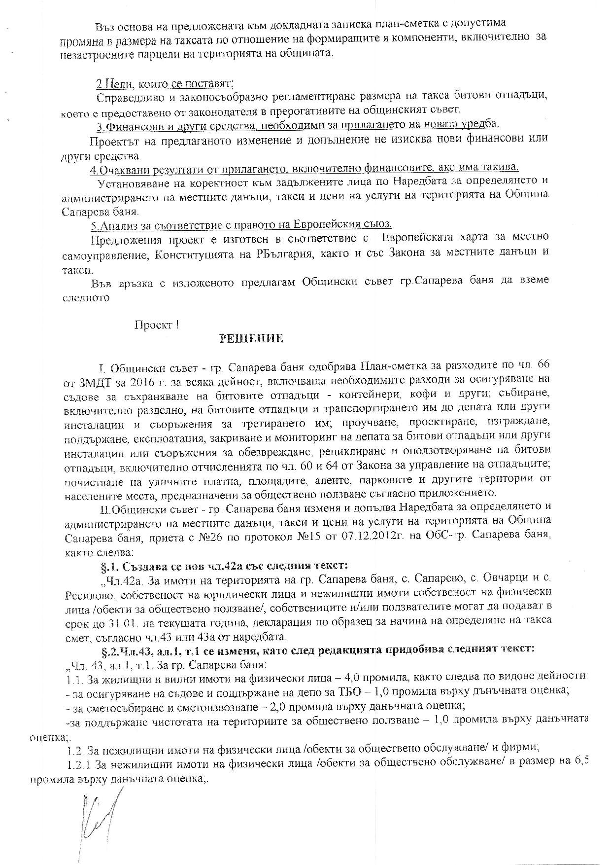 І. Общински съвет - гр. Сапарева баня одобрява План-сметка за разходите по чл. 66 от ЗМДТ за 2016 г. за всяка дейност, включваща необходимите разходи за осигуряване на съдове за съхраняване на битовите отпадъци - контейнери, кофи и други; събиране, включително разделно, на битовите отпадъци и транспортирането им до депата или други инсталации и съоръжения за третирането им; проучване, проектиране, изграждане, поддържане, експлоатация, закриване и мониторинг на депата за битови отпадъци или други инсталации или съоръжения за обезвреждане, рециклиране и оползотворяване на битови отпадъци, включително отчисленията по чл. 60 и 64 от Закона за управление на отпадъците; почистване на уличните платна, площадите, алеите, парковите и другите територии от населените места, предназначени за обществено ползване съгласно приложението.