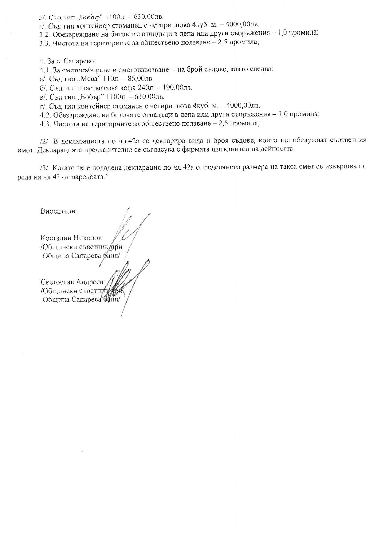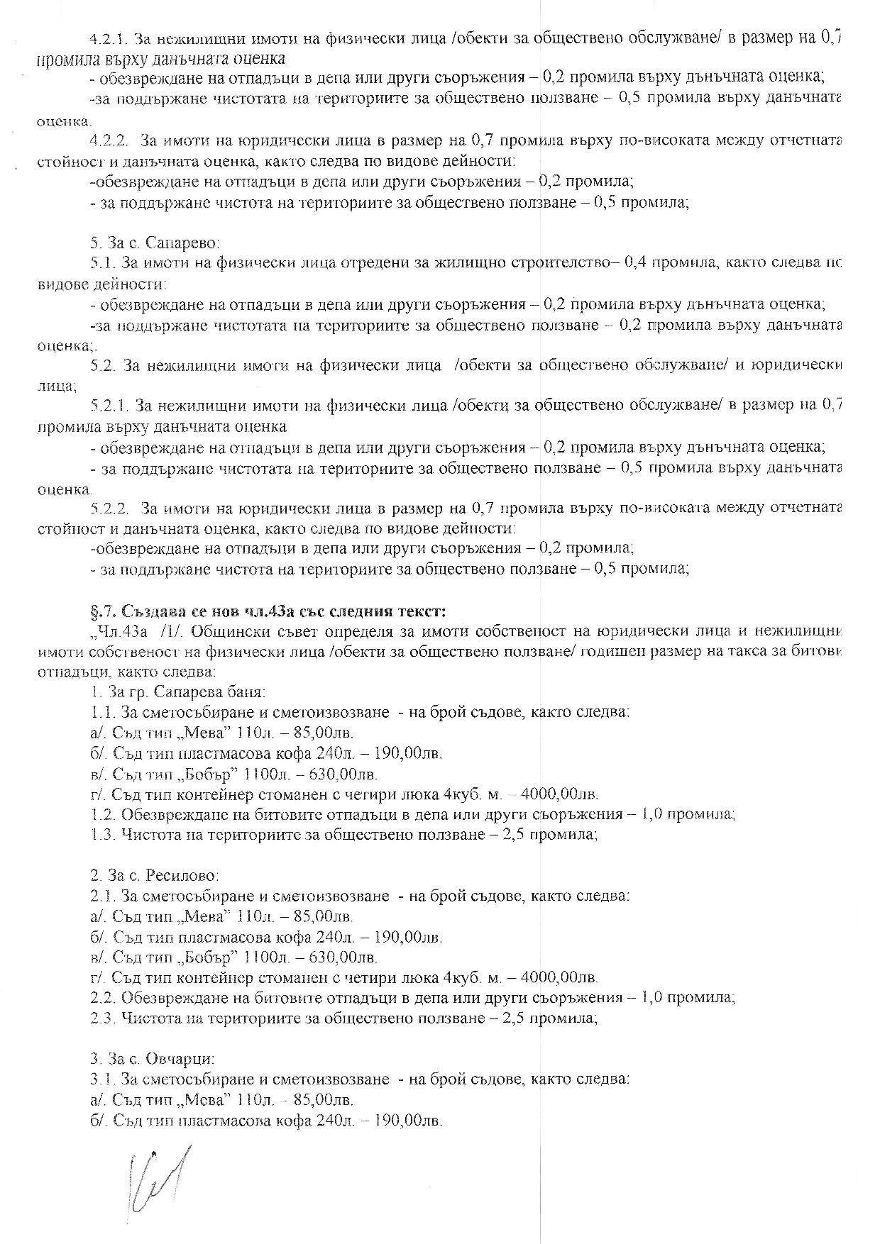 „Чл.43, ал.4. За незастроените урегулирани поземлени имоти на територията на Община Сапарева баня се заплаща такса смет формирана от компонентите чистота на териториите за обществено ползване и обезвреждане на битовите отпадъци в депа или други съоръжения, в годишен размер както следва: