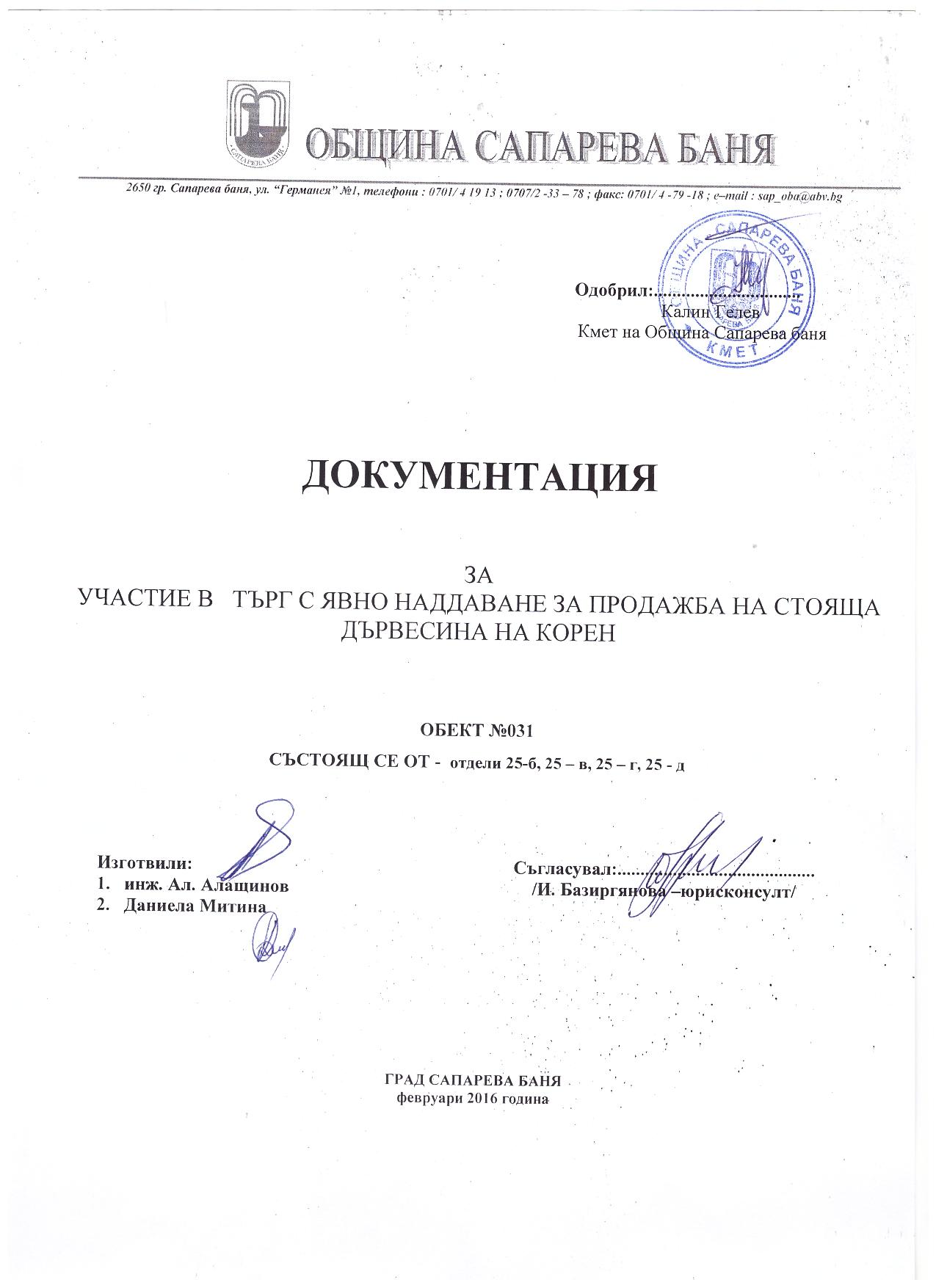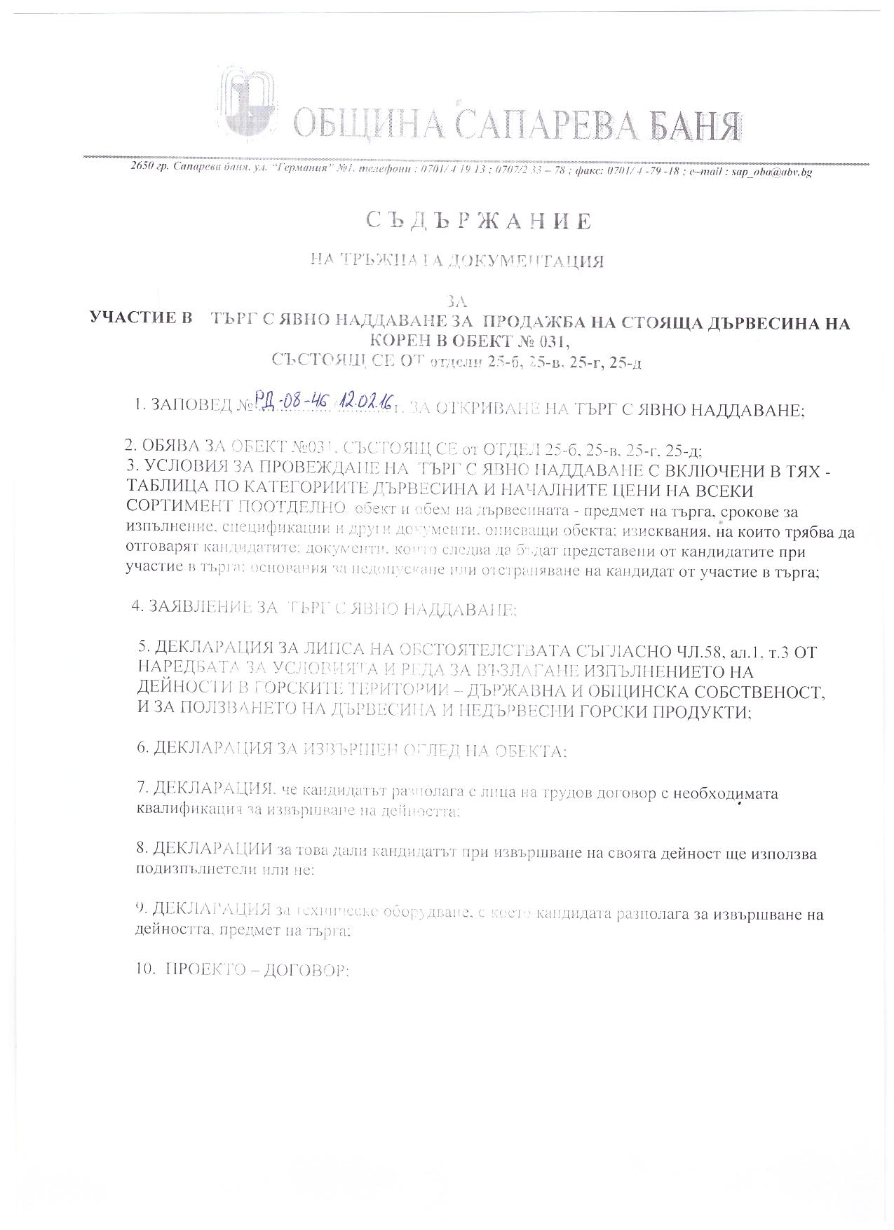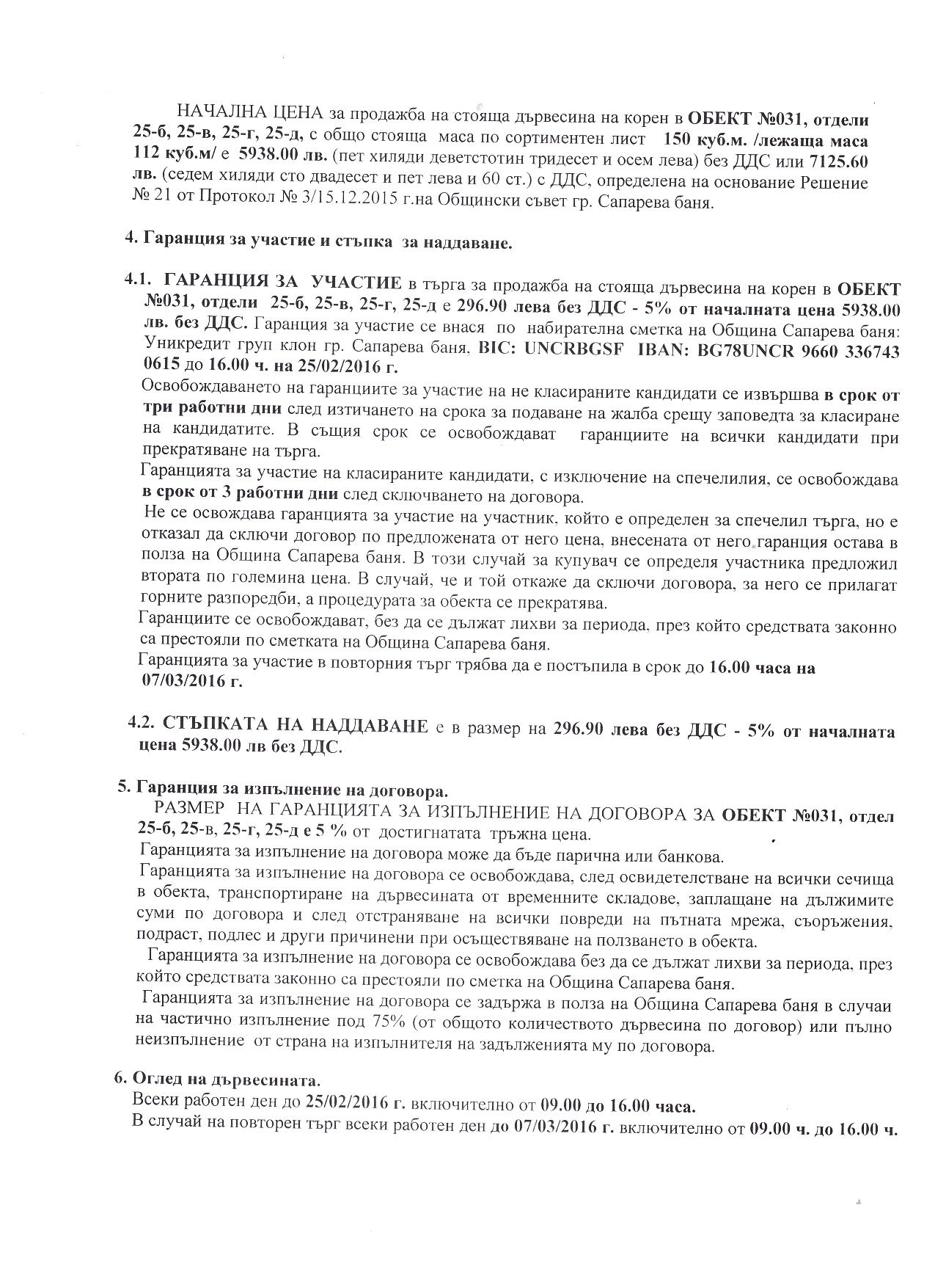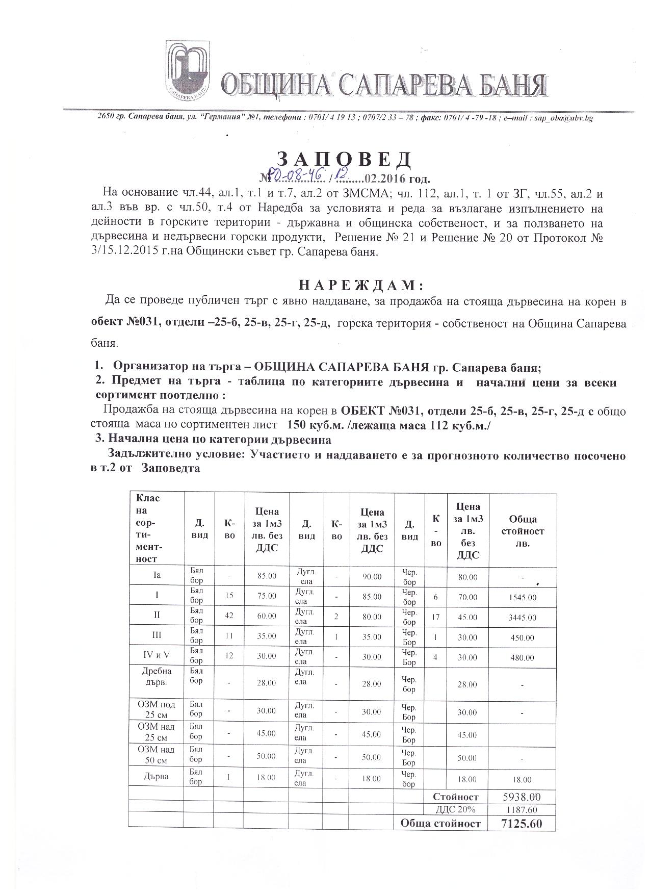 На основание чл.44, aл.1, т.1 и т.7, aл.2 от ЗМСМА; чл. 112, ал.1, т. 1 от ЗГ; чл.55, ал.2 и ал. 3 във вр. с чл.50, т.4 от Наредба за условията и реда за възлагане изпълнението на дейности в горските територии - държавна и общинска собственост, и за ползването на дървесина и недървесни горски продукти; Решение № 20 от Протокол №3/15.12.2016 г.; Решение №21 от Протокол №3/15.12.2015 г.на Общински съвет гр. Сапарева баня и Заповед № РД-08-46/12.02.2016 год. на Кмета на Община Сапарева баня се организира публичен търг с явно наддаване за продажба на стояща дървесина на корен в обект № 031 състоящ се ототдели 25-б, 25-в, 25-г, 25-в за 2016 г. на територията на Общинско лесничейство гр.Сапарева баня.