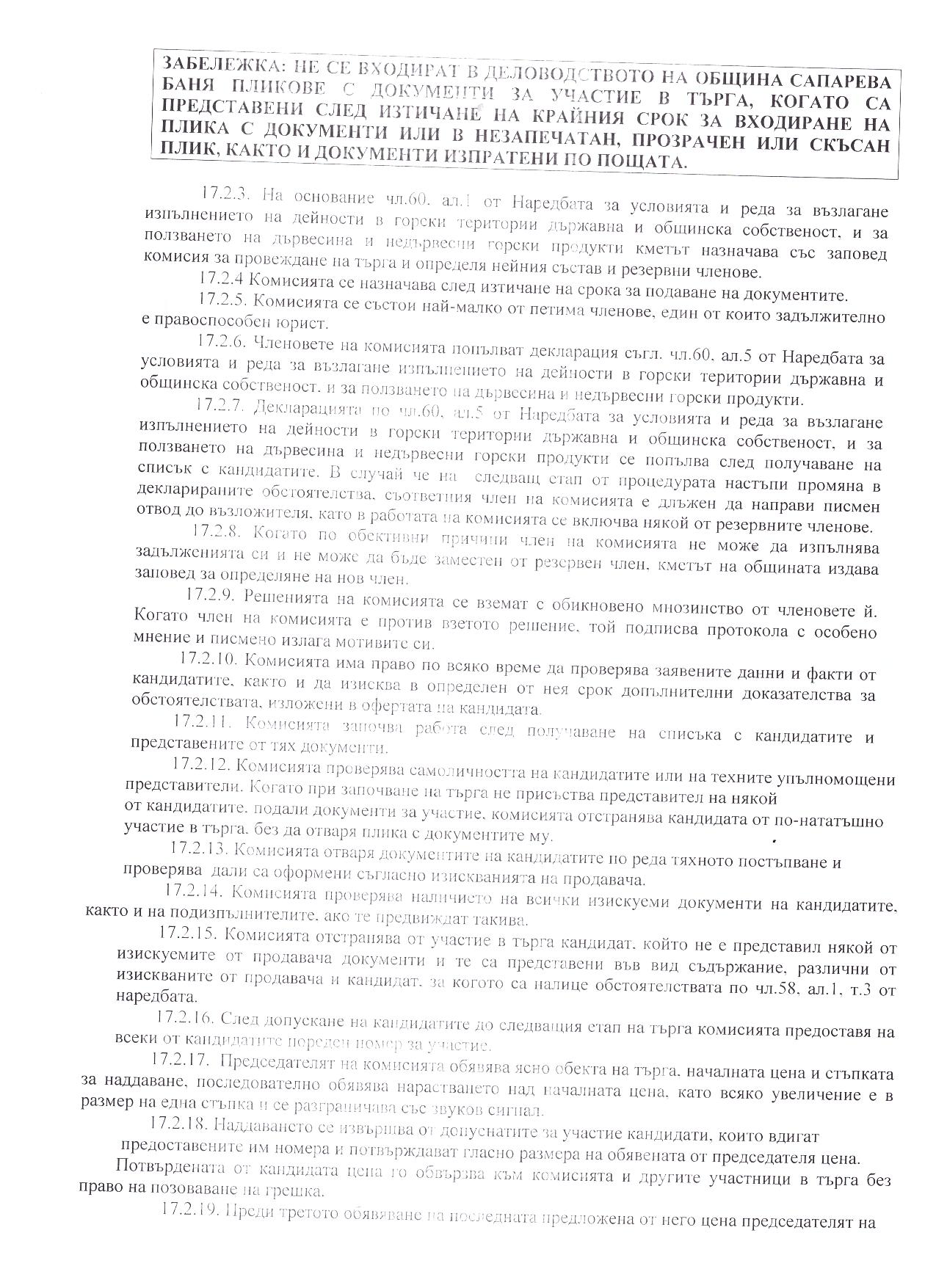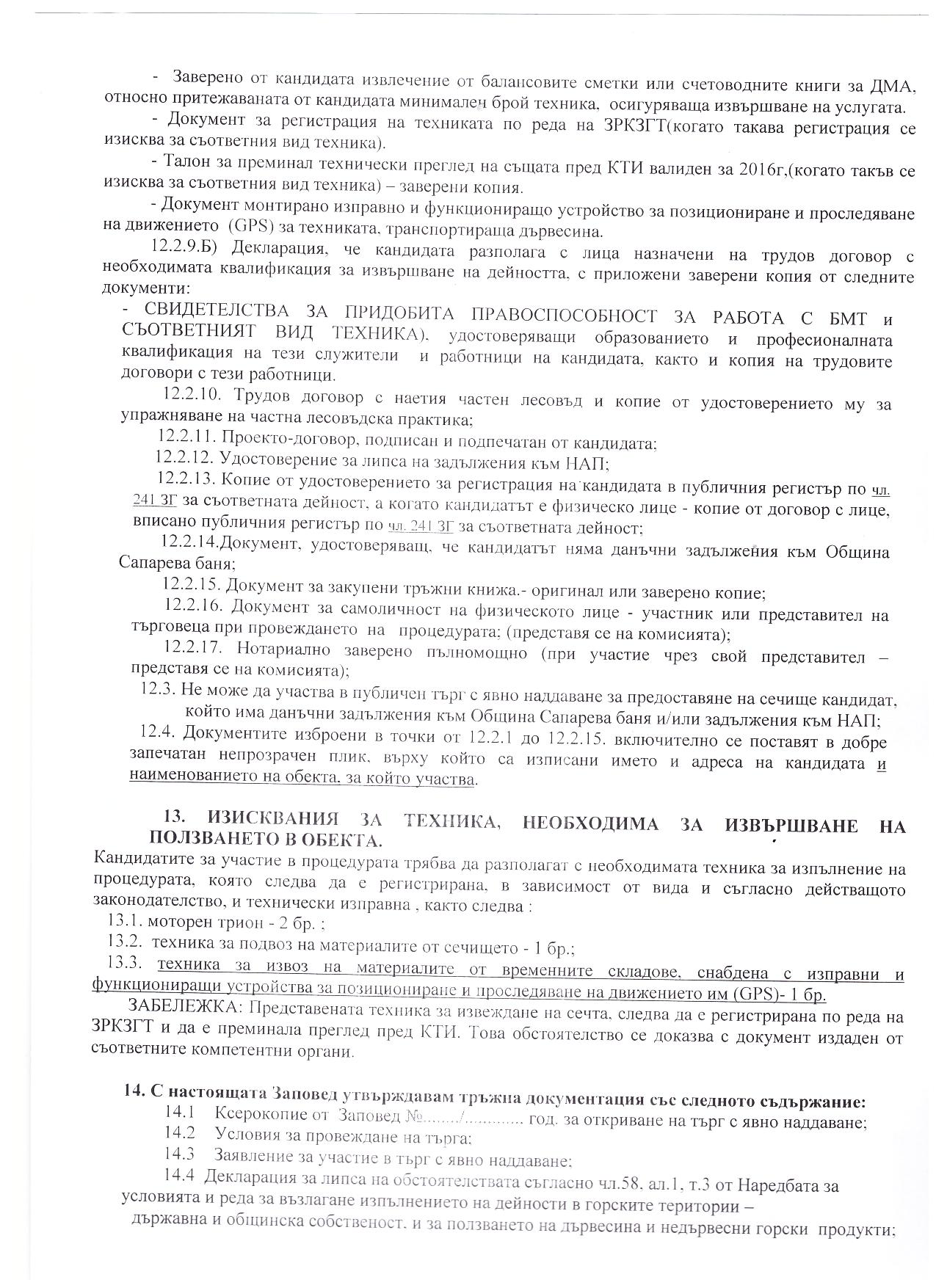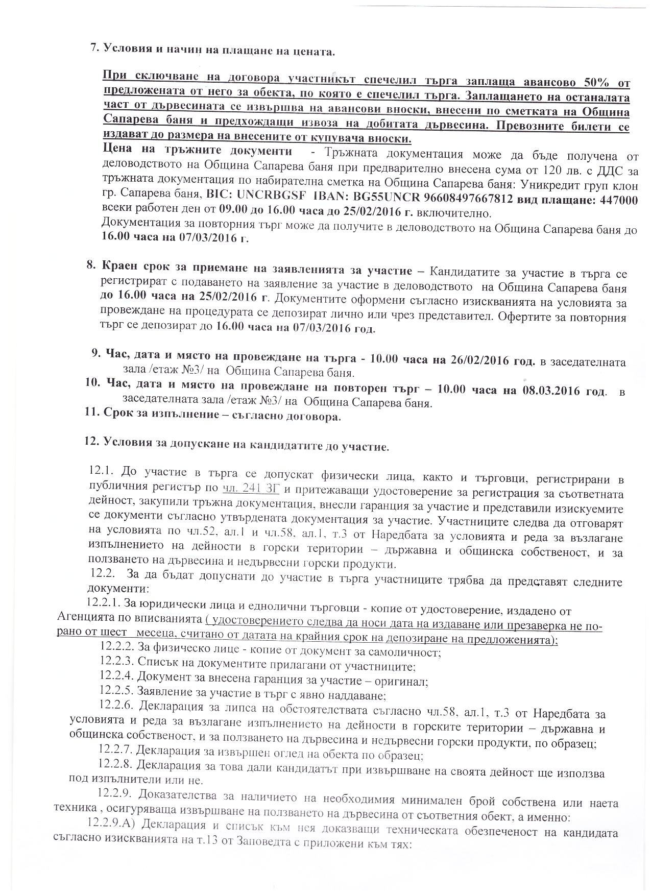 На основание чл.44, aл.1, т.1 и т.7, aл.2 от ЗМСМА; чл. 112, ал.1, т. 1 от ЗГ; чл.55, ал.2 и ал. 3 във вр. с чл.50, т.4 от Наредба за условията и реда за възлагане изпълнението на дейности в горските територии - държавна и общинска собственост, и за ползването на дървесина и недървесни горски продукти; Решение № 20 от Протокол №3/15.12.2016 г.; Решение №21 от Протокол №3/15.12.2015 г.на Общински съвет гр. Сапарева баня и Заповед № РД-08-46/12.02.2016 год. на Кмета на Община Сапарева баня се организира публичен търг с явно наддаване за продажба на стояща дървесина на корен в обект № 031 състоящ се ототдели 25-б, 25-в, 25-г, 25-в за 2016 г. на територията на Общинско лесничейство гр.Сапарева баня.