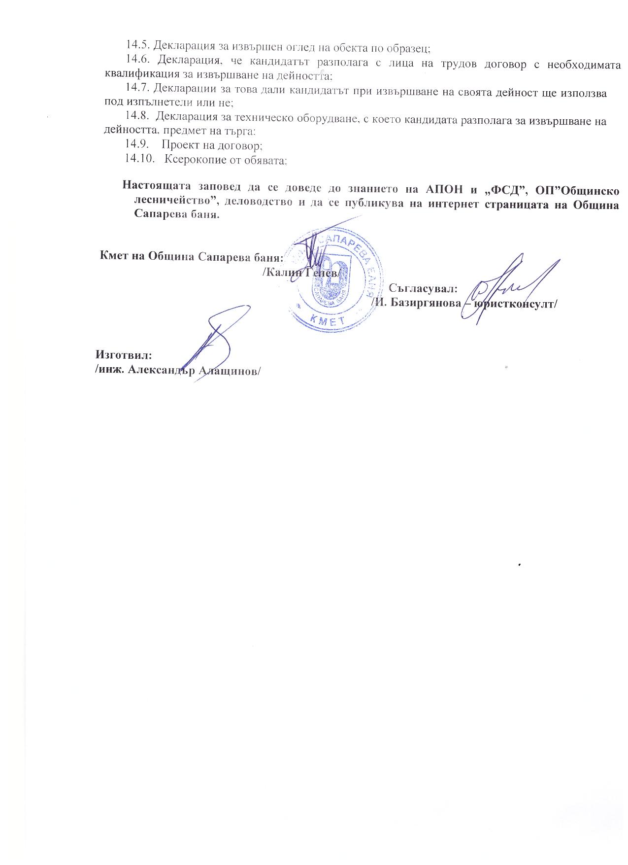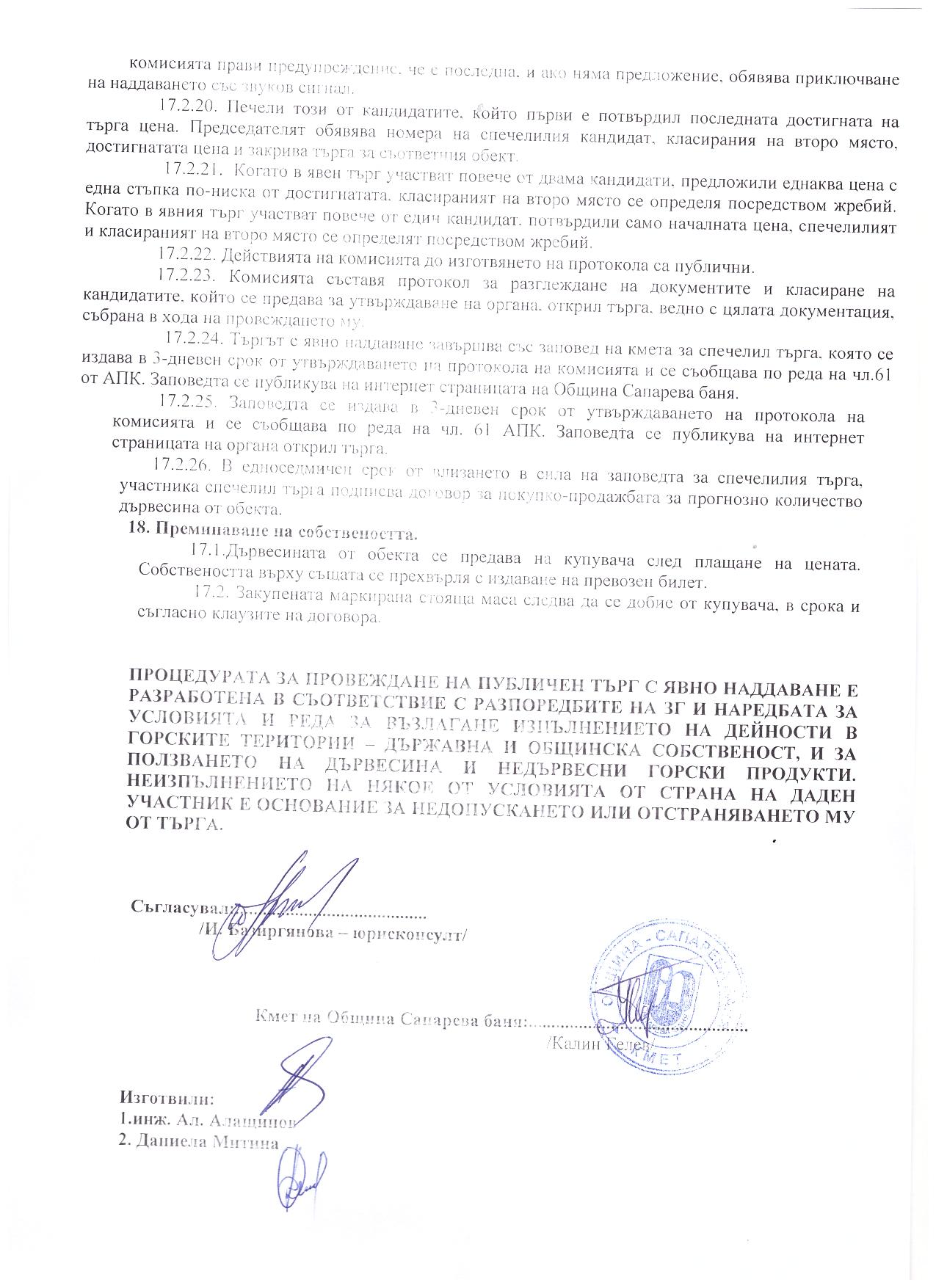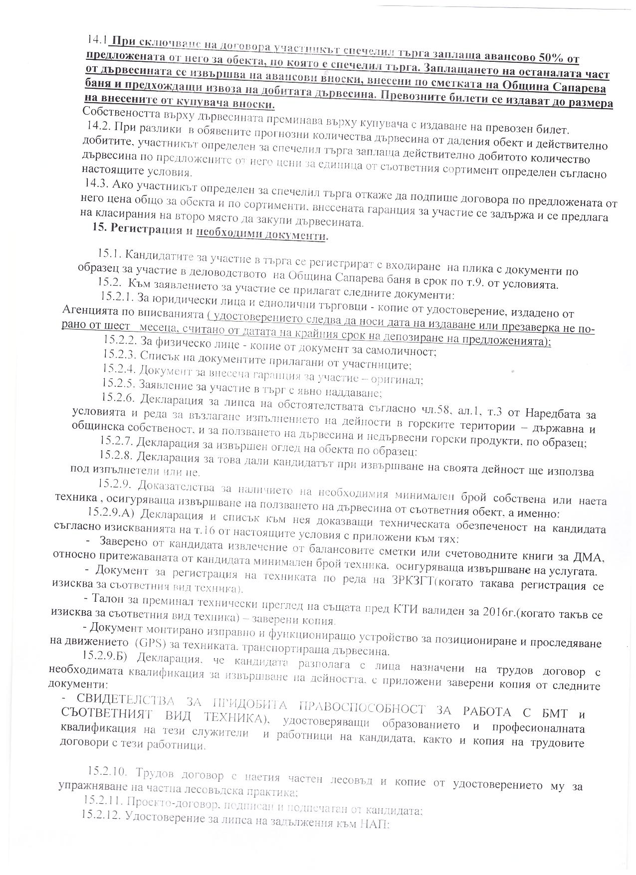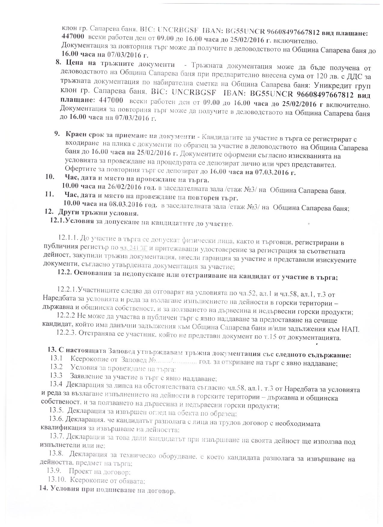На основание чл.44, aл.1, т.1 и т.7, aл.2 от ЗМСМА; чл. 112, ал.1, т. 1 от ЗГ; чл.55, ал.2 и ал. 3 във вр. с чл.50, т.4 от Наредба за условията и реда за възлагане изпълнението на дейности в горските територии - държавна и общинска собственост, и за ползването на дървесина и недървесни горски продукти; Решение № 20 от Протокол №3/15.12.2016 г.; Решение №21 от Протокол №3/15.12.2015 г.на Общински съвет гр. Сапарева баня и Заповед № РД-08-46/12.02.2016 год. на Кмета на Община Сапарева баня се организира публичен търг с явно наддаване за продажба на стояща дървесина на корен в обект № 031 състоящ се ототдели 25-б, 25-в, 25-г, 25-в за 2016 г. на територията на Общинско лесничейство гр.Сапарева баня.