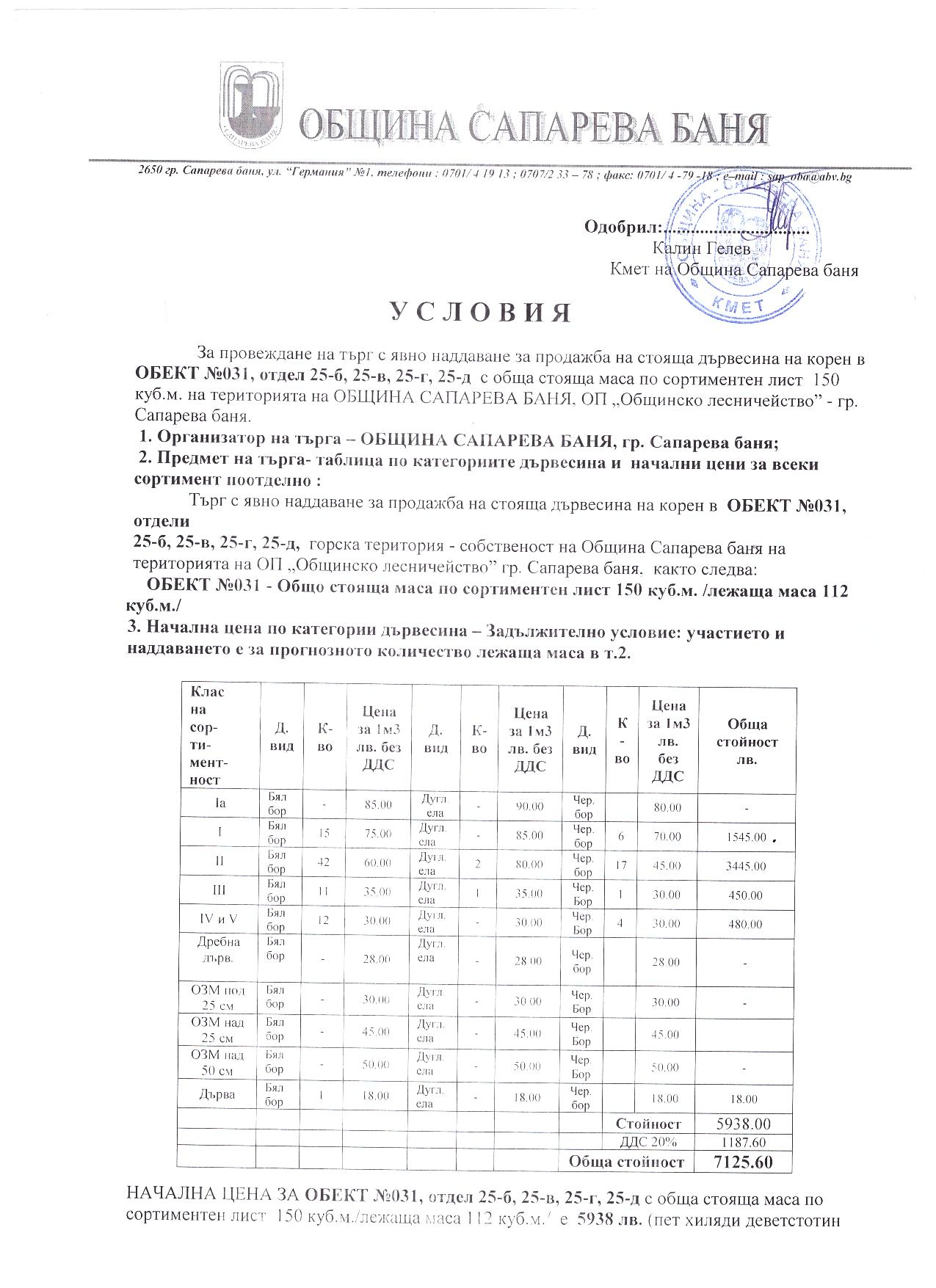 Продажба на стояща дървесина на корен в обект №031, отдели 25-б, 25-в, 25-г, 25-д, собственост на Община Сапарева баня. Обща стояща маса по сортиментен лист 150 куб.м. /лежаща маса 112 куб.м./, начална цена за обекта -;