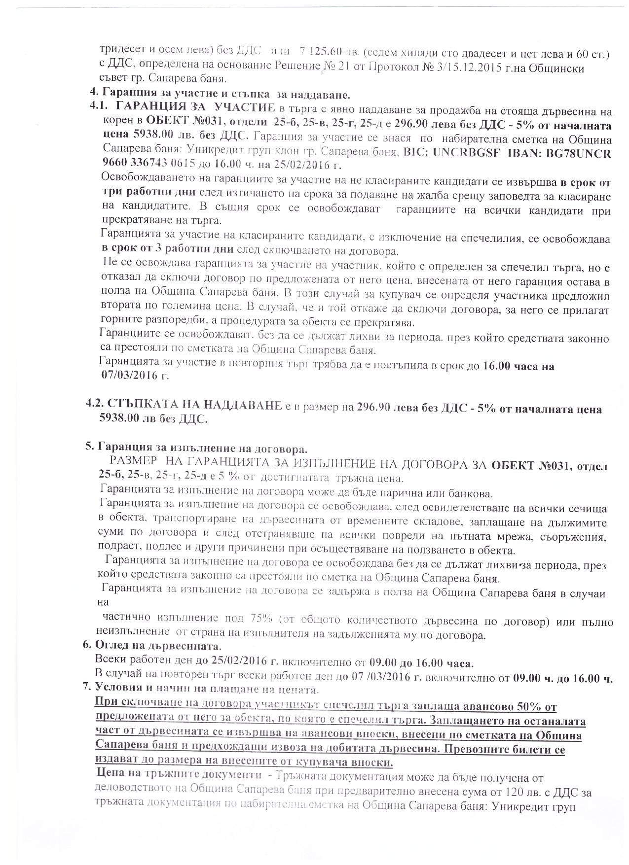3.1.Гаранция за участие за обект № 031 – отдели 25-б, 25-в, 25-г, 25-в - 5% от началната цена 5938.00 без ДДС или 296.90 лева без ДДС. Гаранция за участие се внася по набирателна сметка на Община Сапарева баня: Уникредит груп клон гр. Сапарева баня, BIC: UNCRBGSF IBAN: BG78UNCR 9660 3367430615 до 16.00 ч. на 25/02/2016 г.